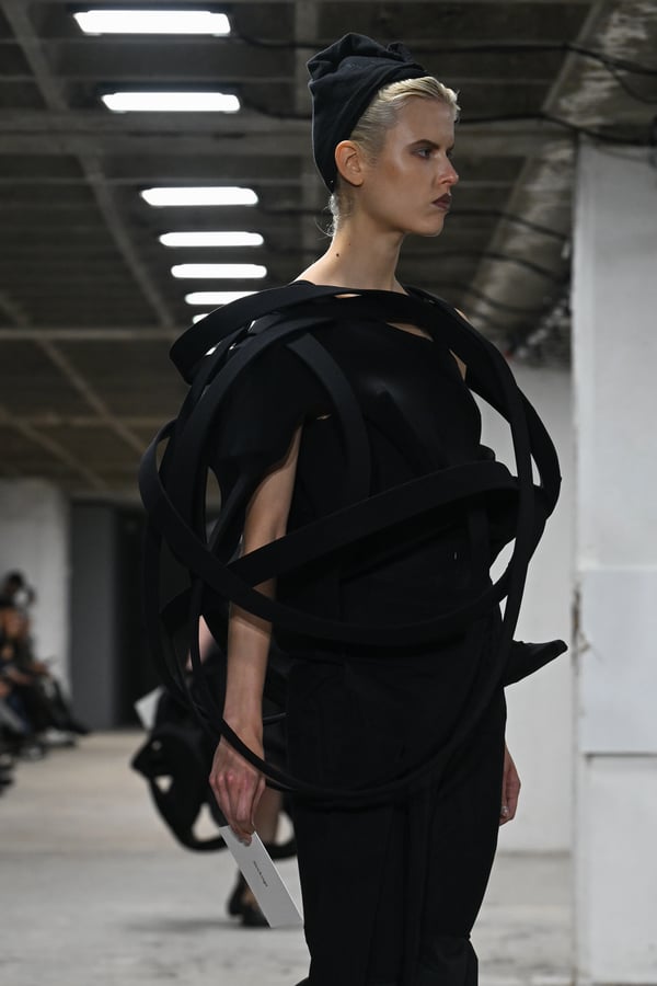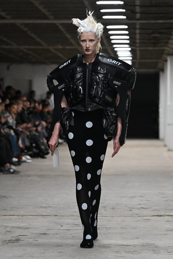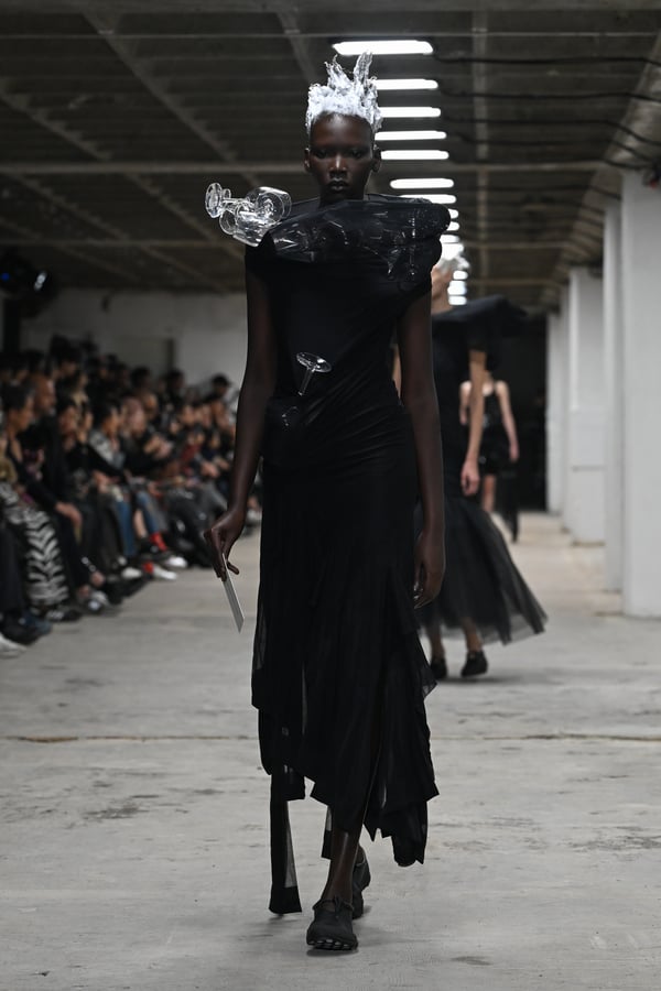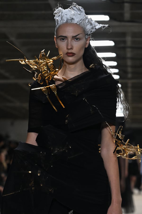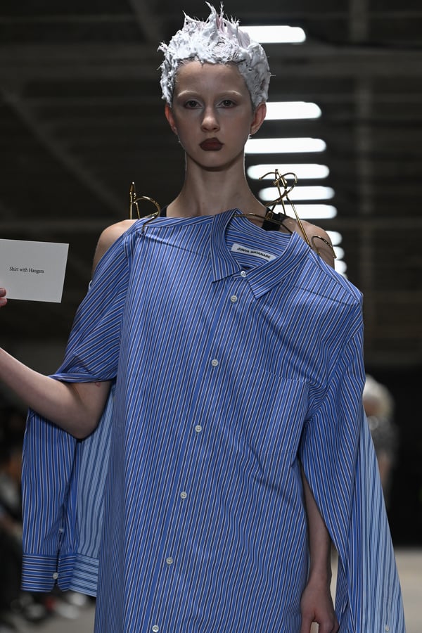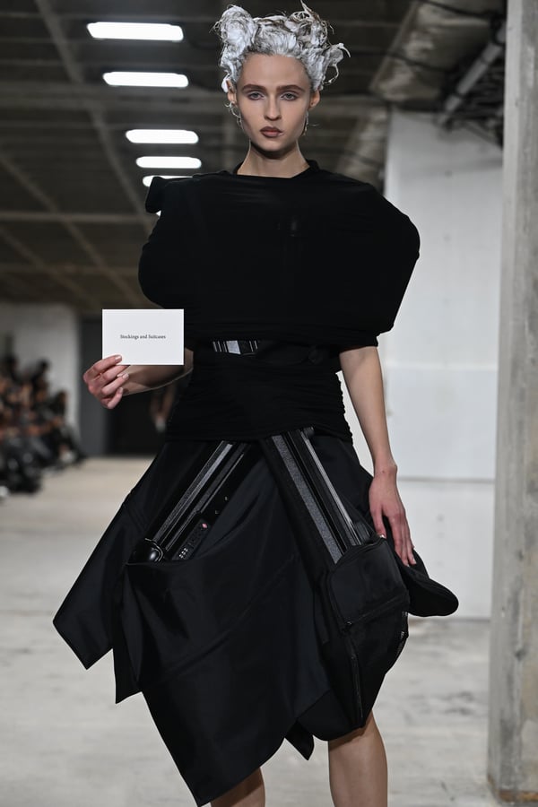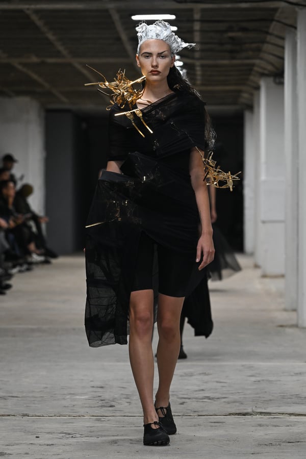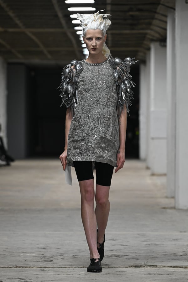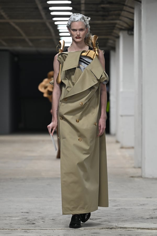 コレクションでは、パンプスやハット、ハンガー、カトラリー、ワイングラスを衣服の一部として融合。テキスタイルで包むなど、それぞれのオブジェクトごとに異なる手法が用いられた。そのほか「ステューシー(STÜSSY)」のTシャツにもハンガーで装飾したほか、ボレロジャケットは東京の後楽園ホールすぐ側にある格闘技用品を中心に扱う販売店「GRIT」と協業して製作した。