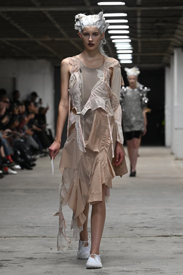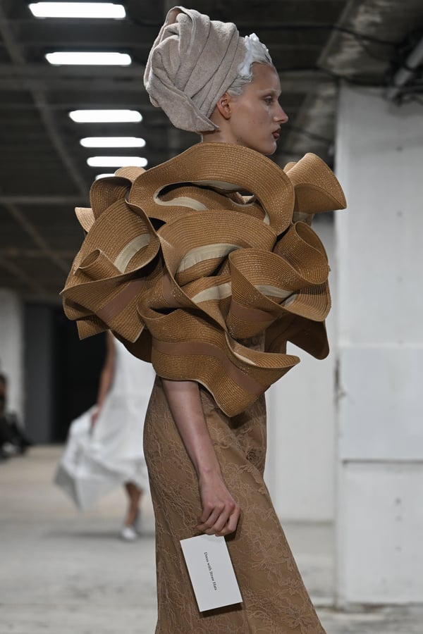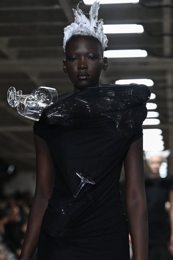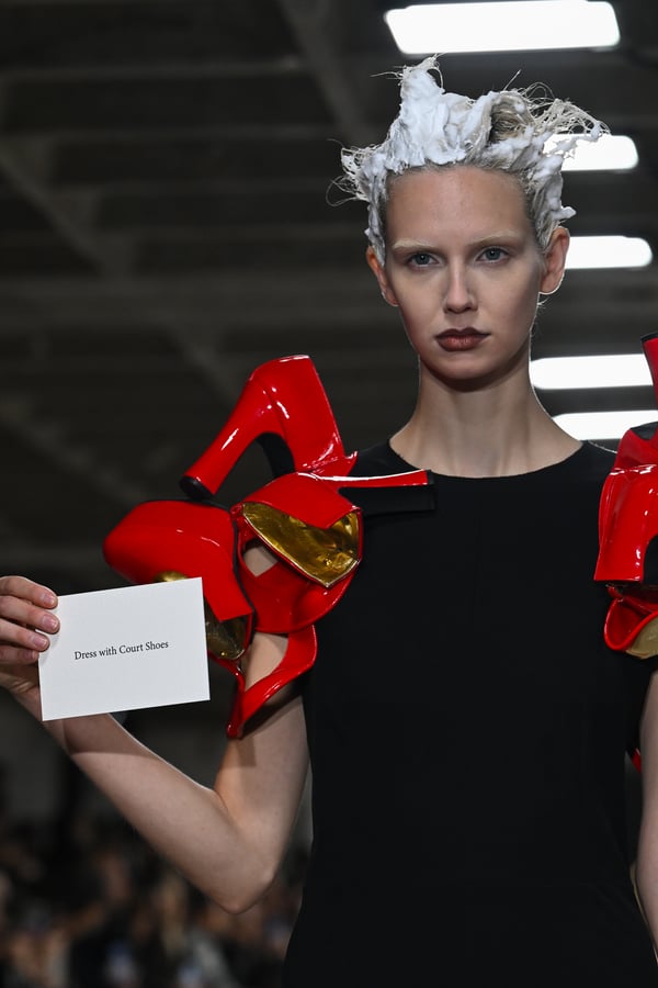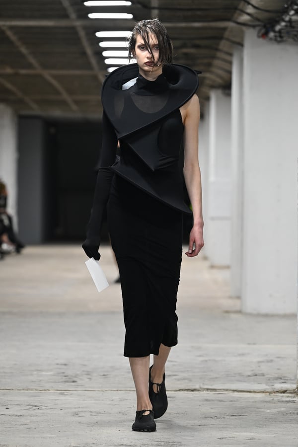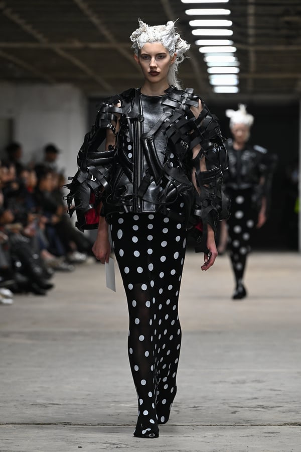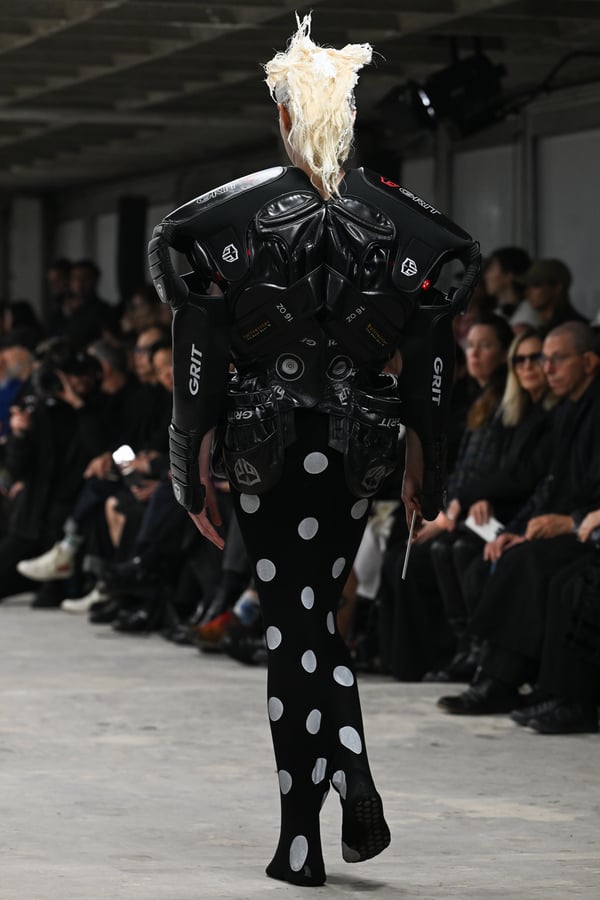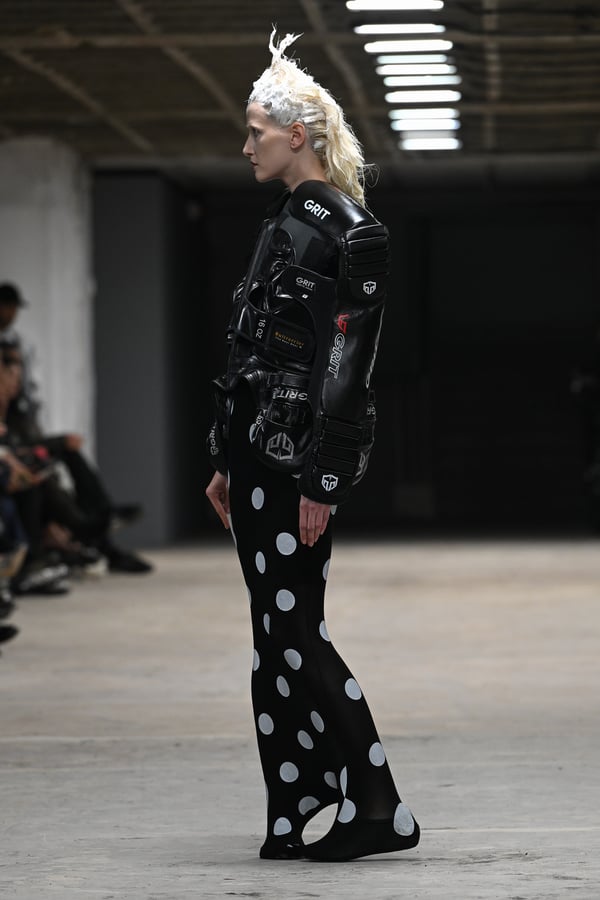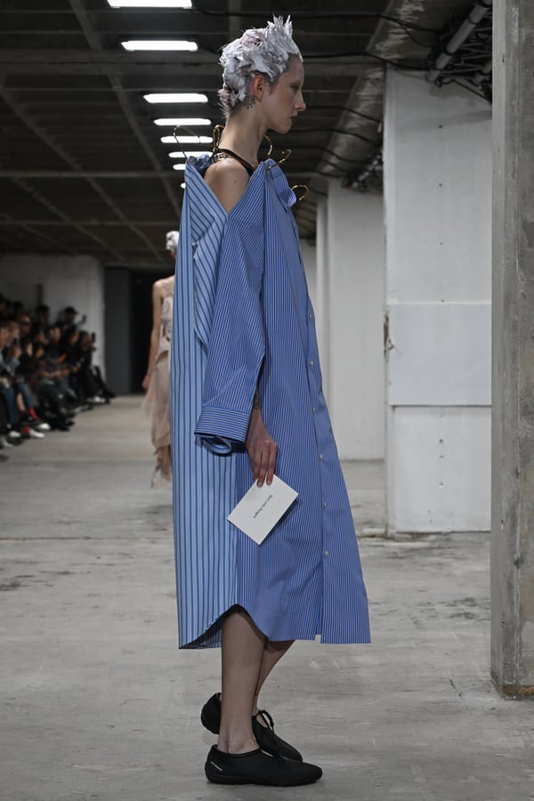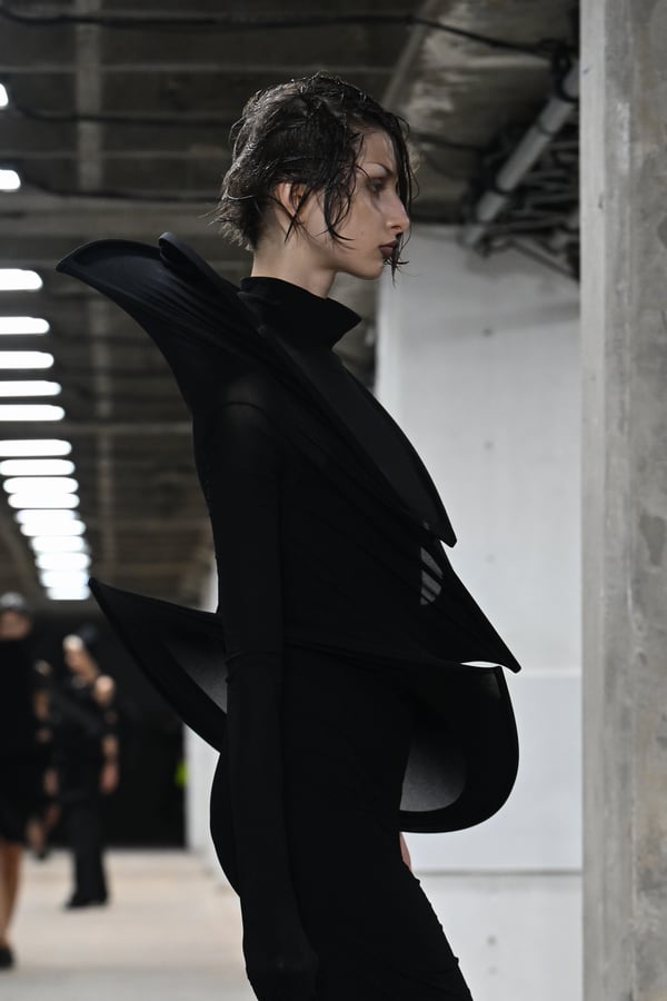 コレクションでは、パンプスやハット、ハンガー、カトラリー、ワイングラスを衣服の一部として融合。テキスタイルで包むなど、それぞれのオブジェクトごとに異なる手法が用いられた。そのほか「ステューシー(STÜSSY)」のTシャツにもハンガーで装飾したほか、ボレロジャケットは東京の後楽園ホールすぐ側にある格闘技用品を中心に扱う販売店「GRIT」と協業して製作した。