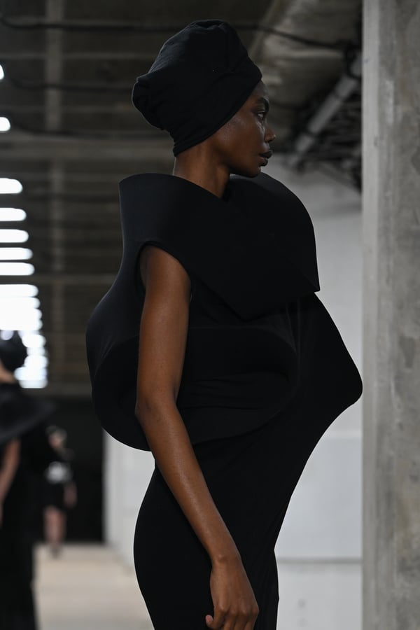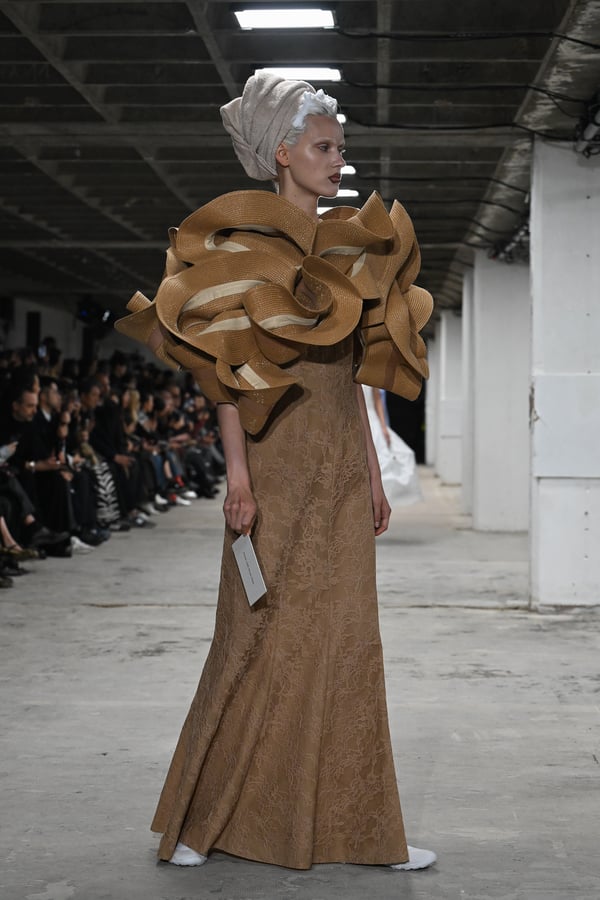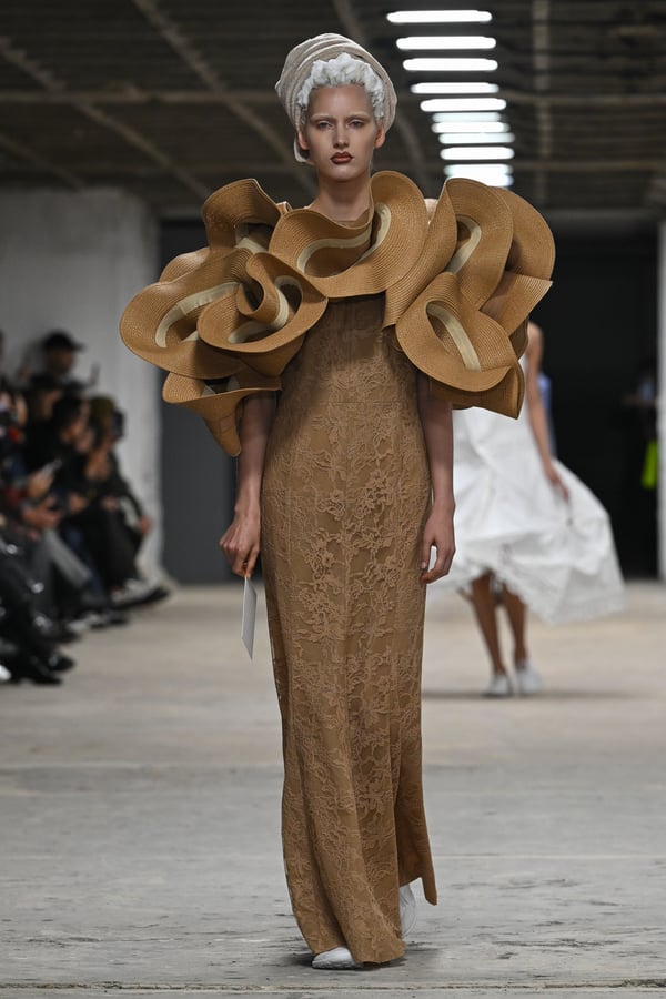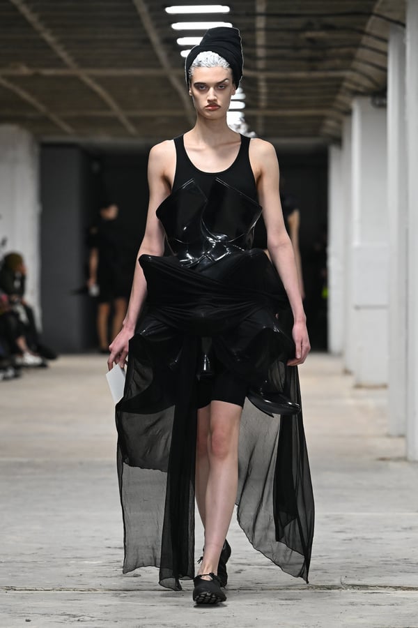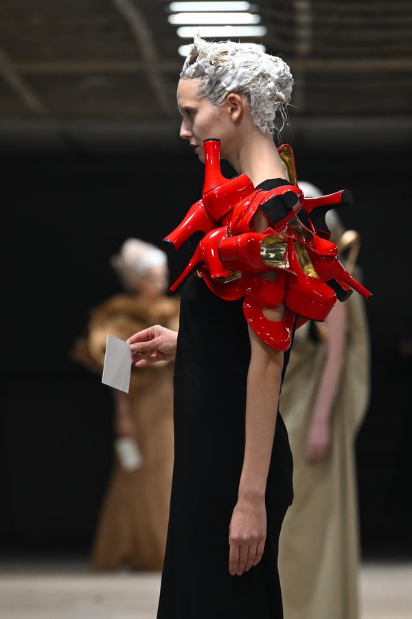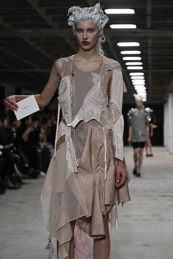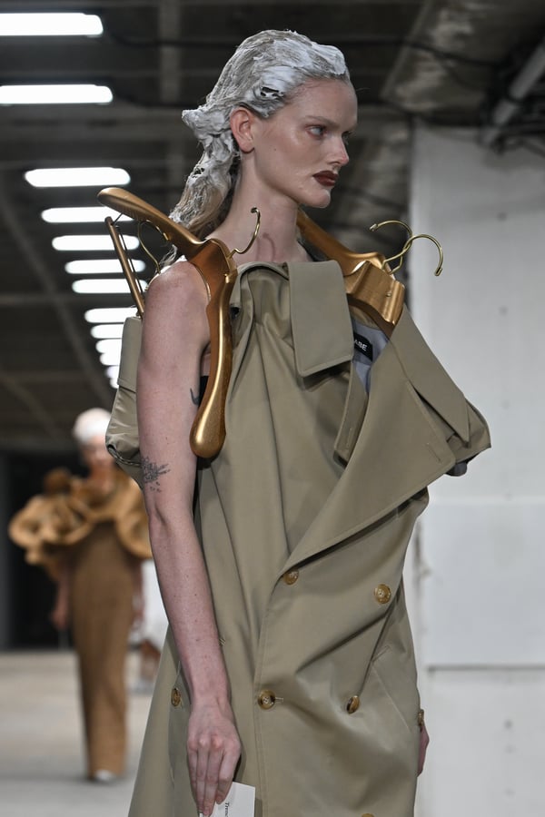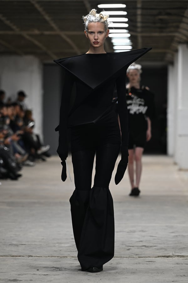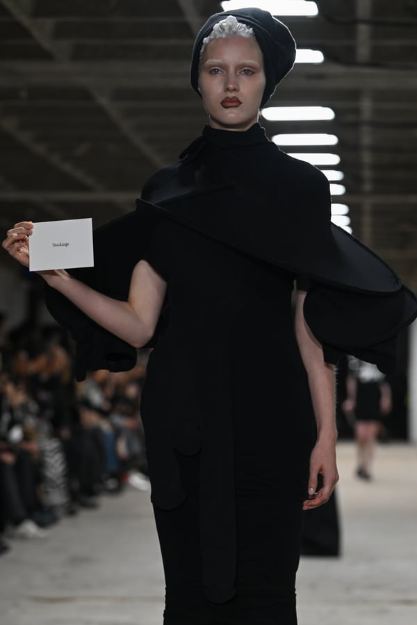 コレクションでは、パンプスやハット、ハンガー、カトラリー、ワイングラスを衣服の一部として融合。テキスタイルで包むなど、それぞれのオブジェクトごとに異なる手法が用いられた。そのほか「ステューシー(STÜSSY)」のTシャツにもハンガーで装飾したほか、ボレロジャケットは東京の後楽園ホールすぐ側にある格闘技用品を中心に扱う販売店「GRIT」と協業して製作した。