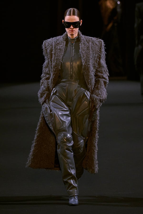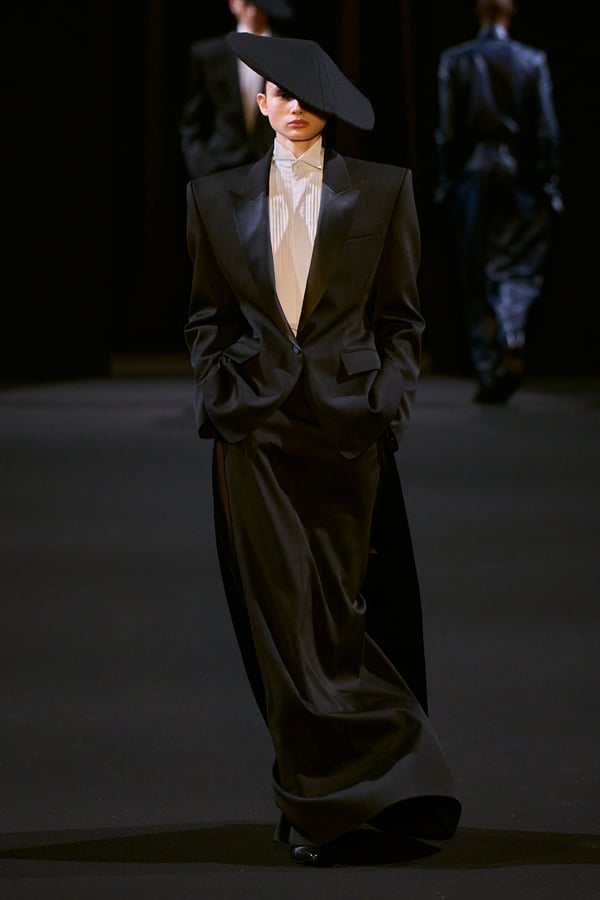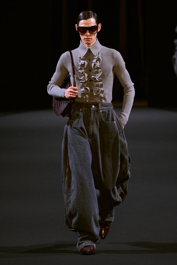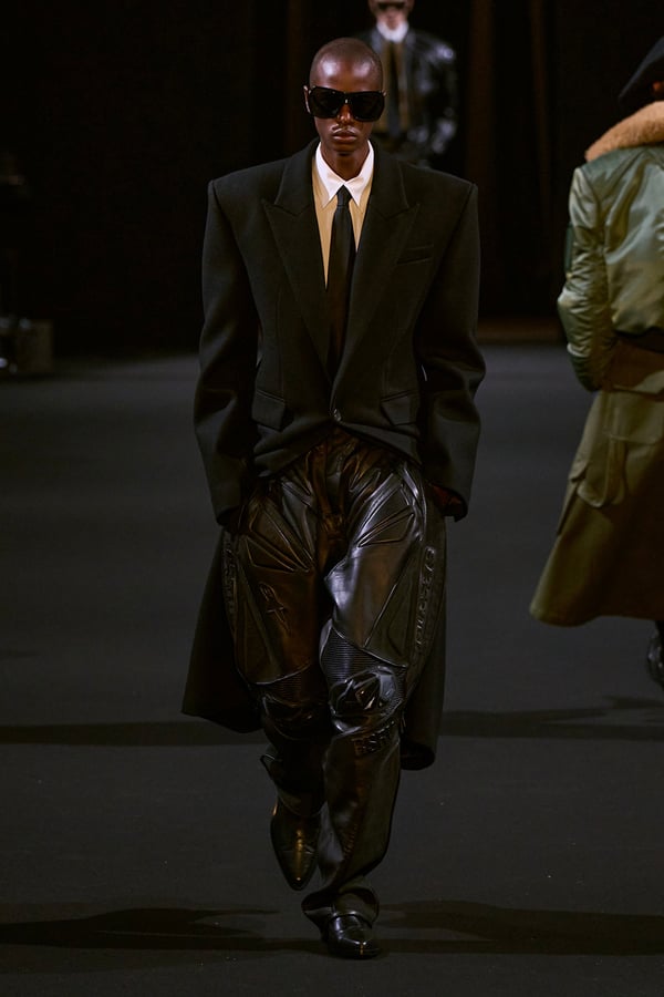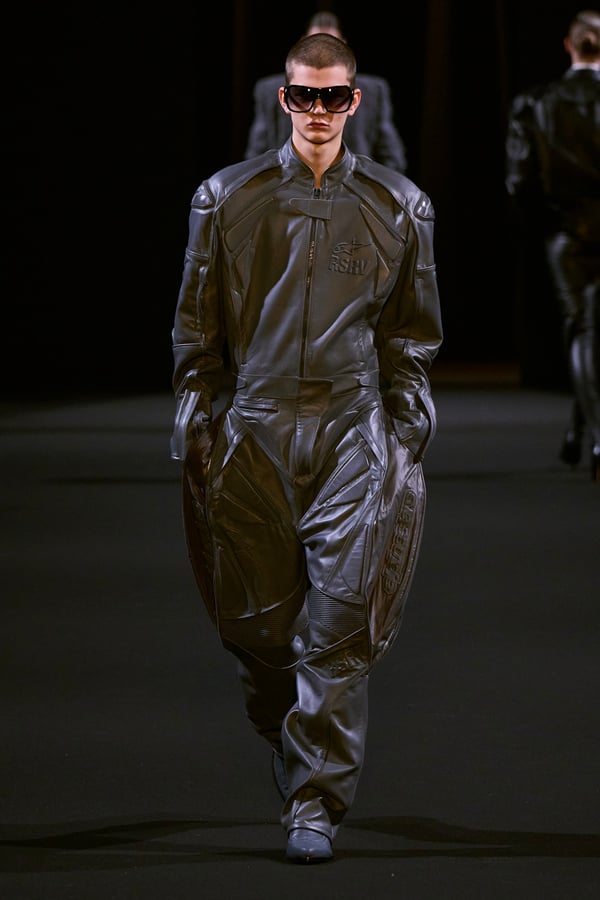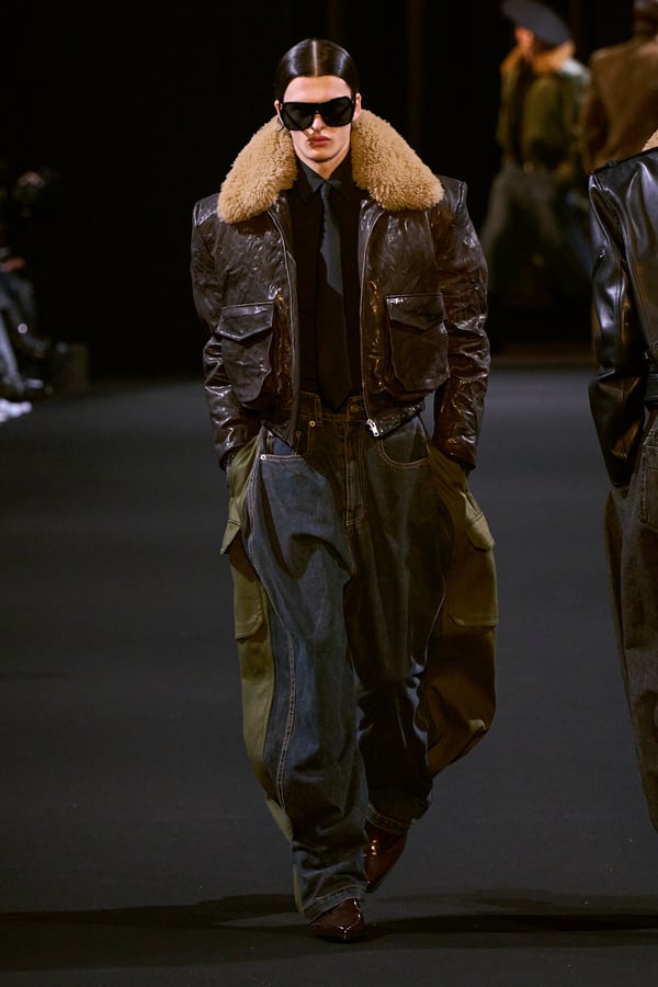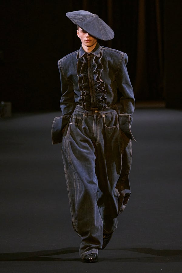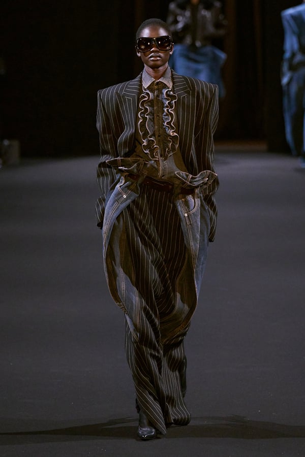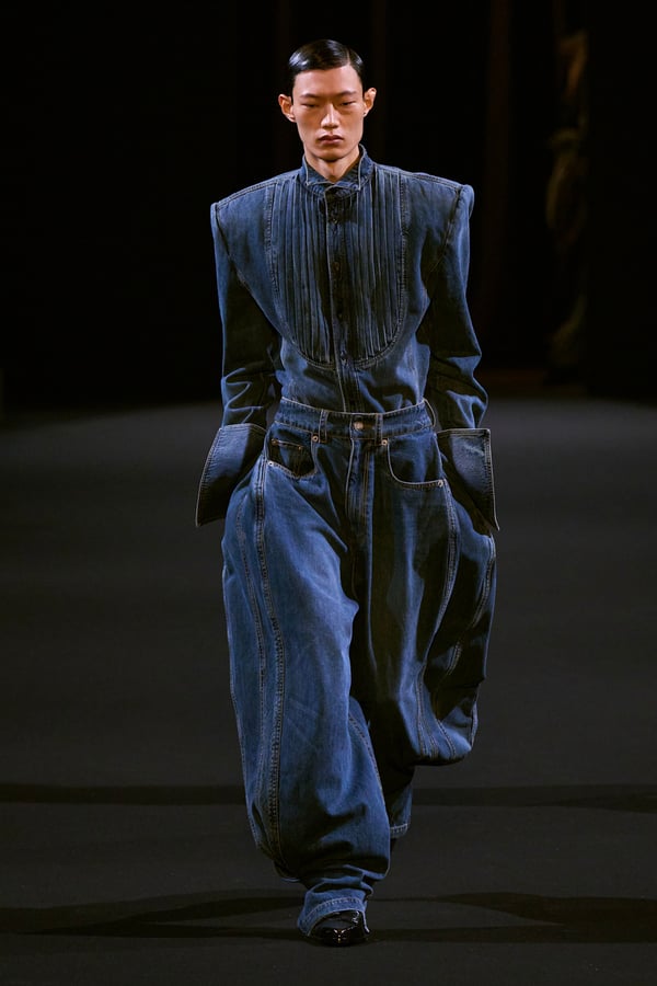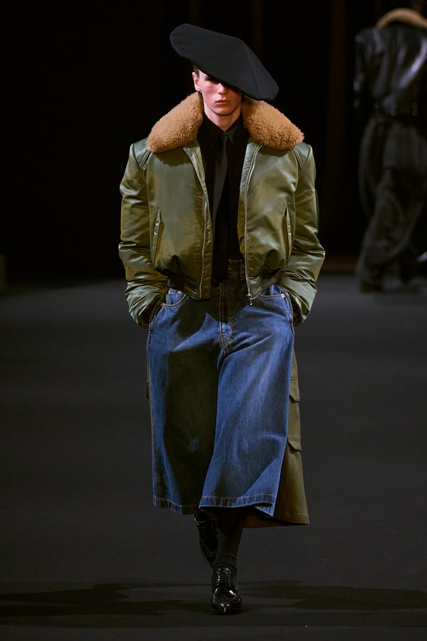 コレクションを通じて視線を集めたのは、2026年春夏コレクションでも取り入れられたパワーショルダーの意匠。だが、全シーズンと比べてより幅広で、力強さが増した印象だ。ベースとなっているのは、トレンチコートやピークドラペルジャケット、フリルシャツ、ショートスカートなどのクラシックなアイテム。いずれのアイテムも過剰なまでの装飾やドッキングの手法を取り入れるなど、新鮮さを感じるデザインに昇華させた。顔を隠すプロフィールハットは、ウール地だけでなくデニムでも製作され、スタイリングのアクセントとして機能した。ショー後半では、モータースポーツと伝統の融合を掲げるファッションブランド「アルパインスターズ リザーブ(ALPINESTARS RSRV)」とのコラボレーションアイテムが登場した。