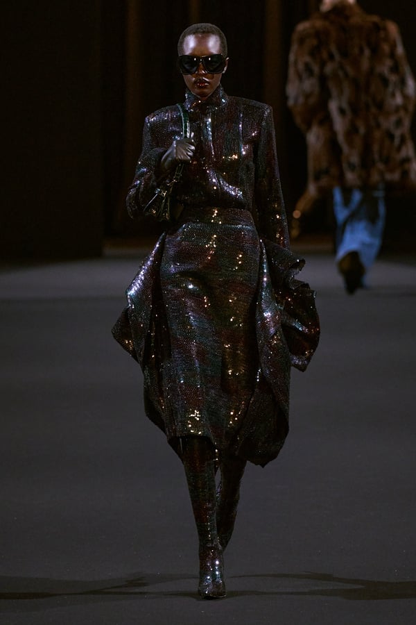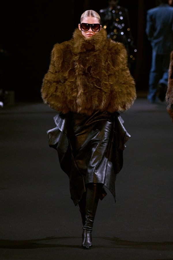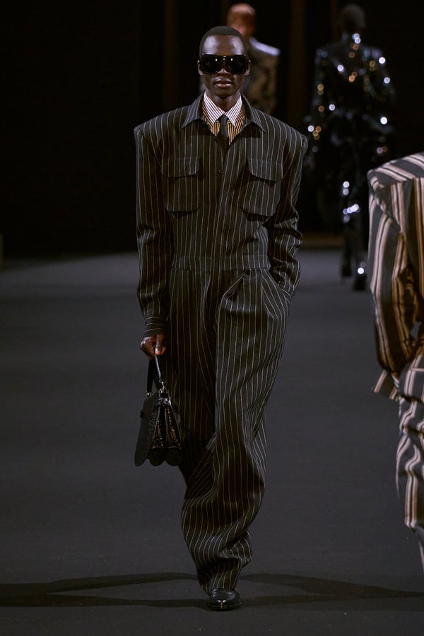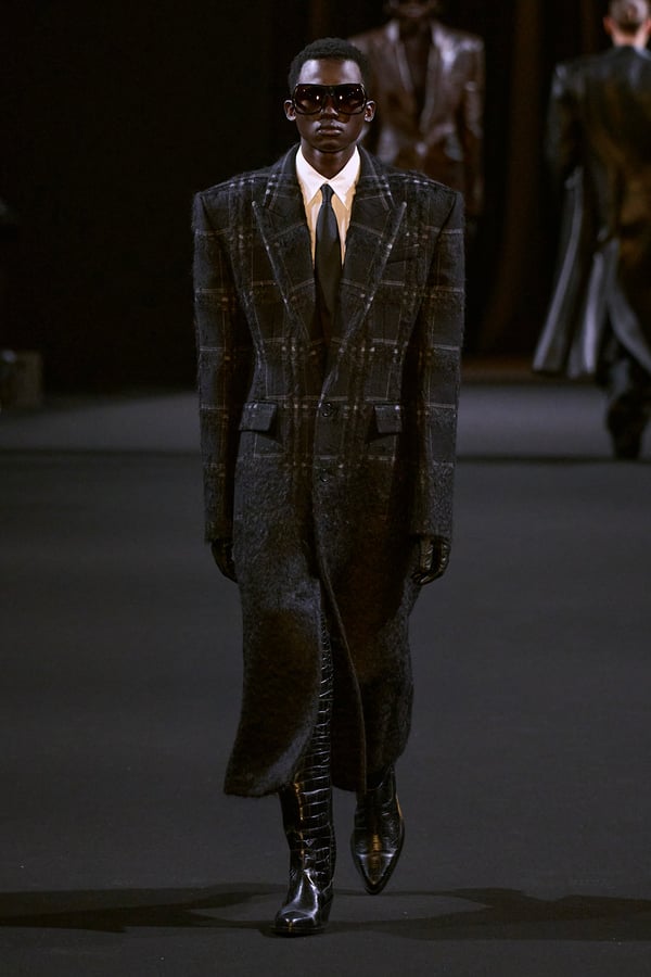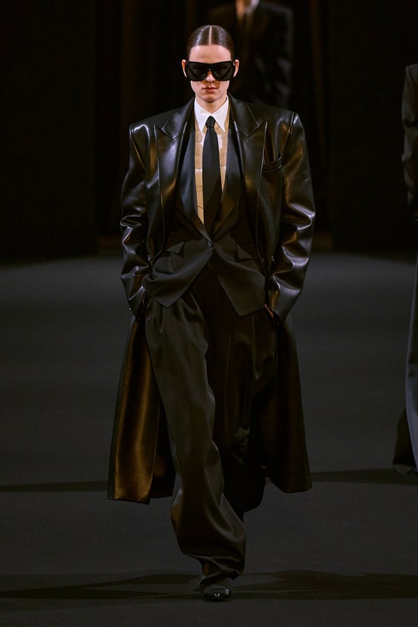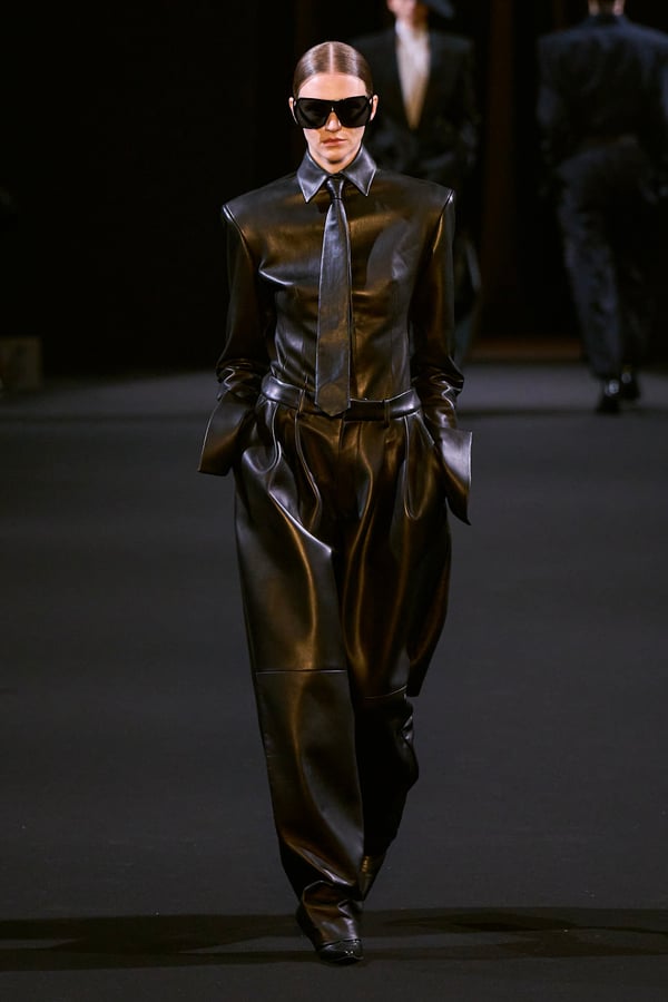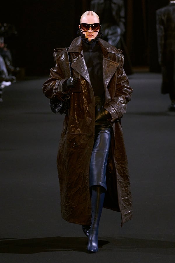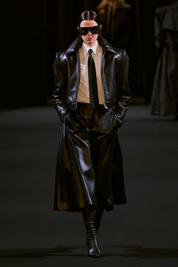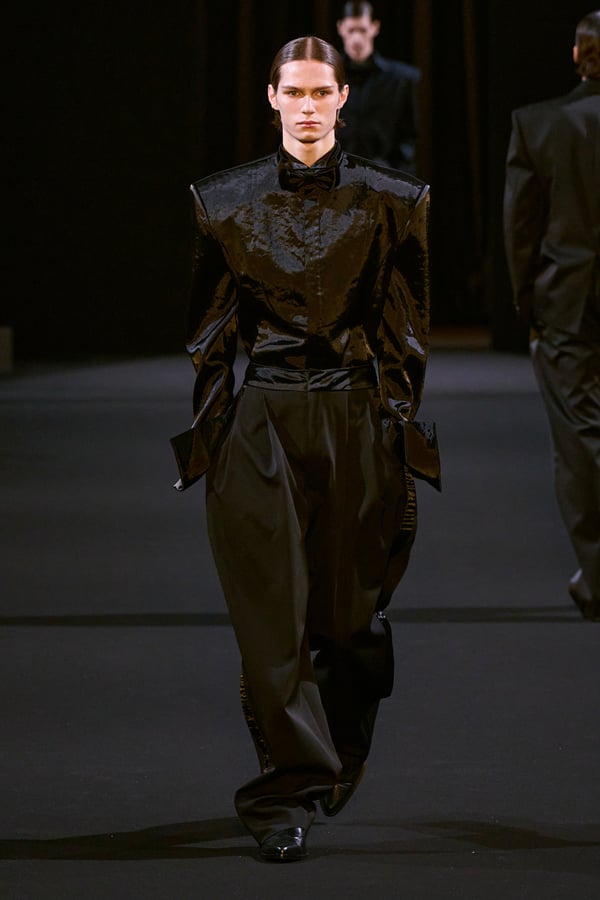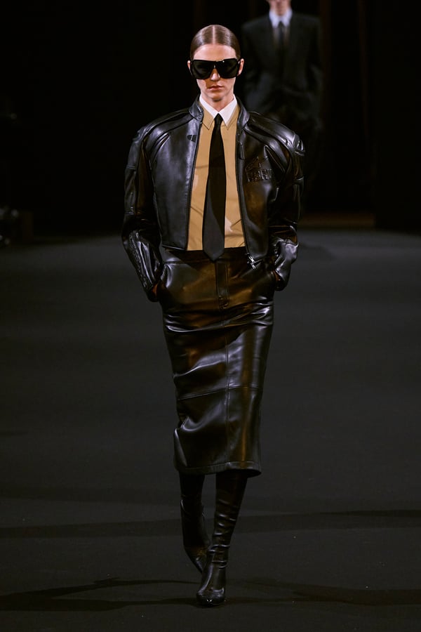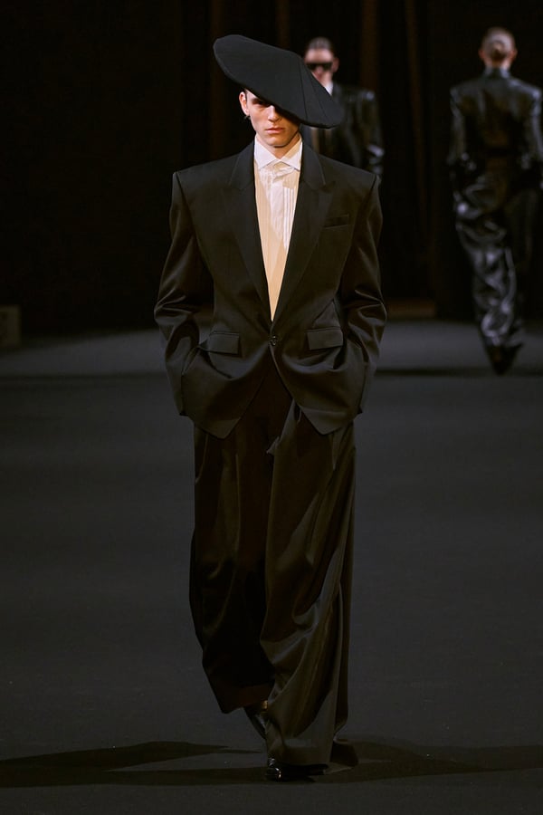 コレクションを通じて視線を集めたのは、2026年春夏コレクションでも取り入れられたパワーショルダーの意匠。だが、全シーズンと比べてより幅広で、力強さが増した印象だ。ベースとなっているのは、トレンチコートやピークドラペルジャケット、フリルシャツ、ショートスカートなどのクラシックなアイテム。いずれのアイテムも過剰なまでの装飾やドッキングの手法を取り入れるなど、新鮮さを感じるデザインに昇華させた。顔を隠すプロフィールハットは、ウール地だけでなくデニムでも製作され、スタイリングのアクセントとして機能した。ショー後半では、モータースポーツと伝統の融合を掲げるファッションブランド「アルパインスターズ リザーブ(ALPINESTARS RSRV)」とのコラボレーションアイテムが登場した。