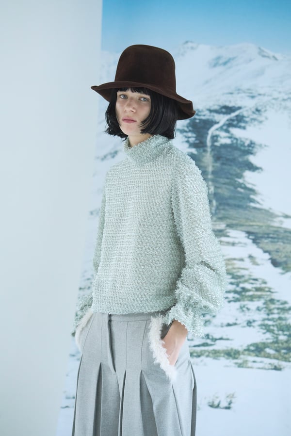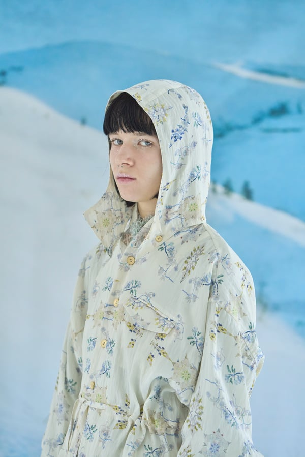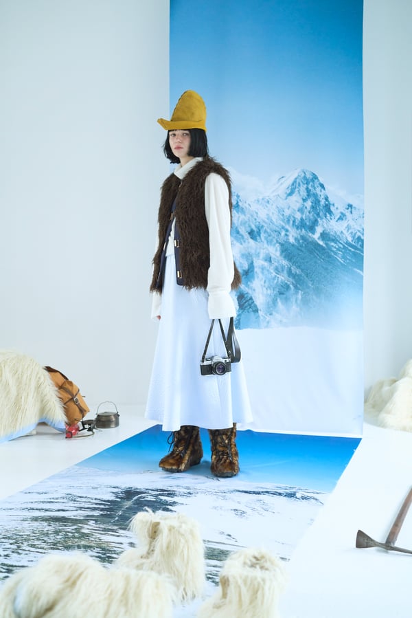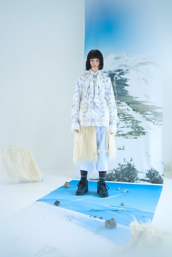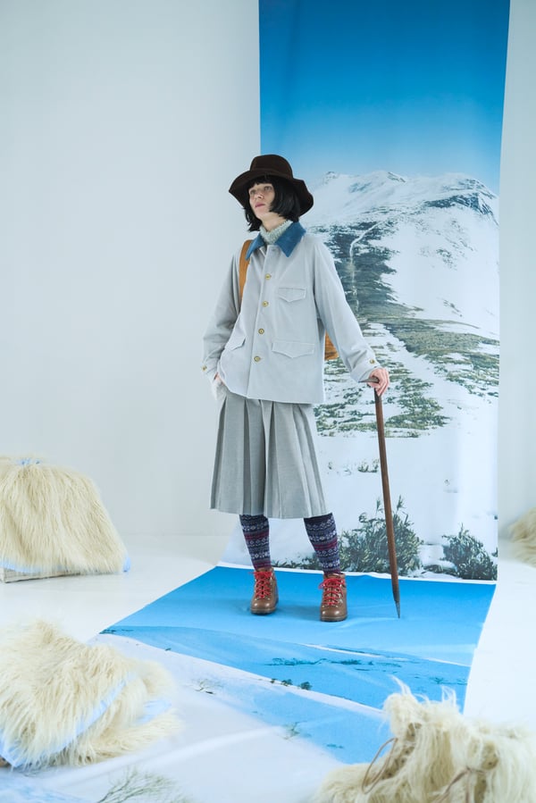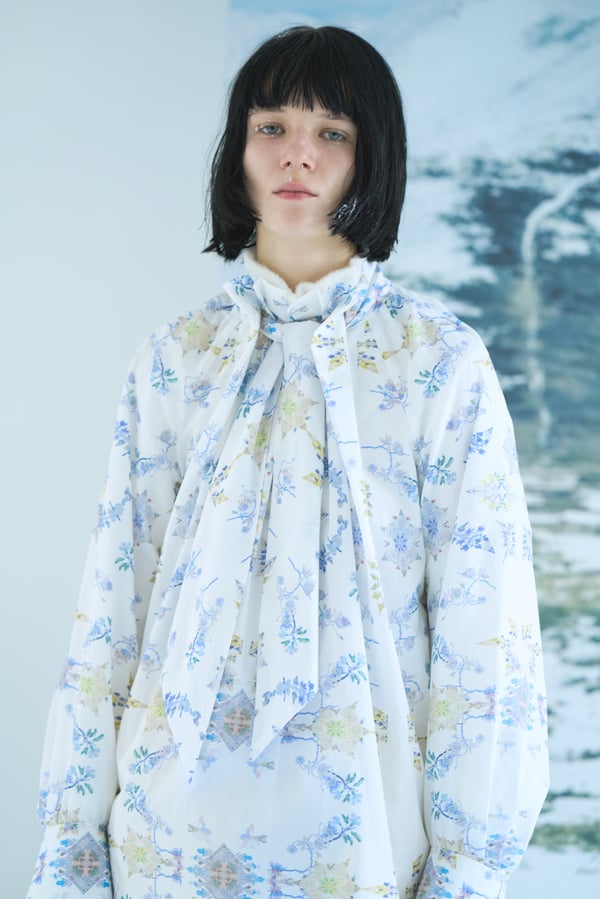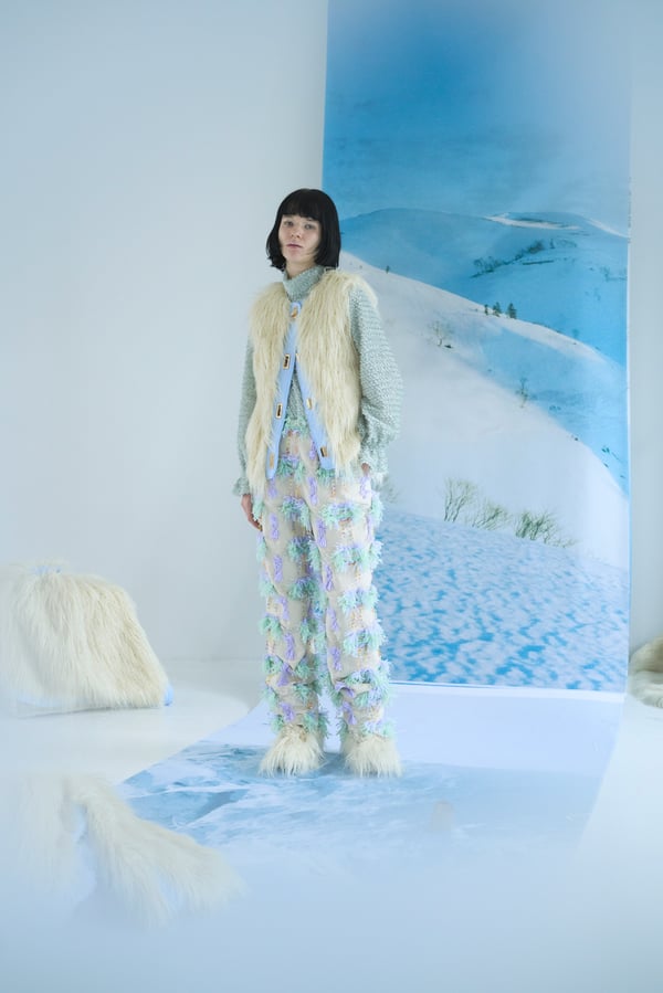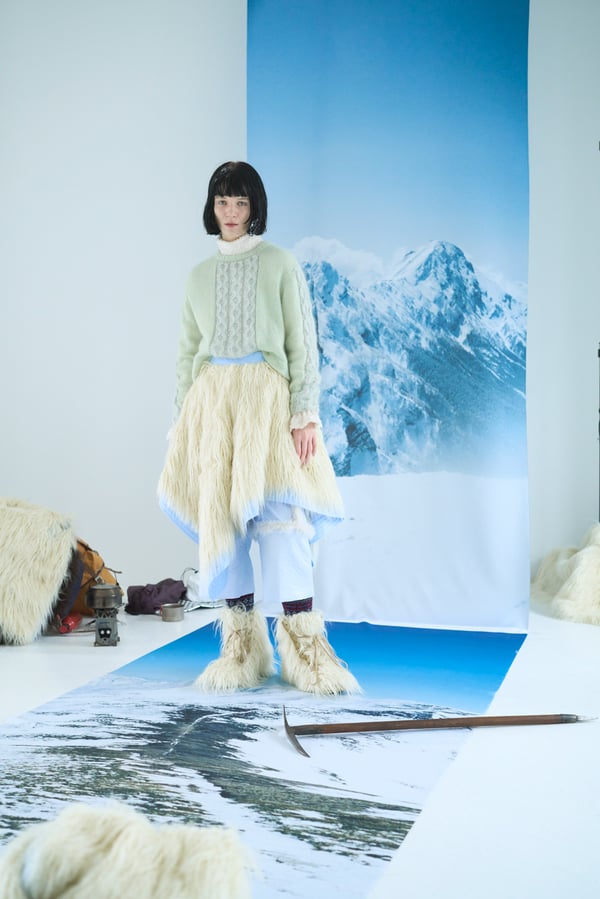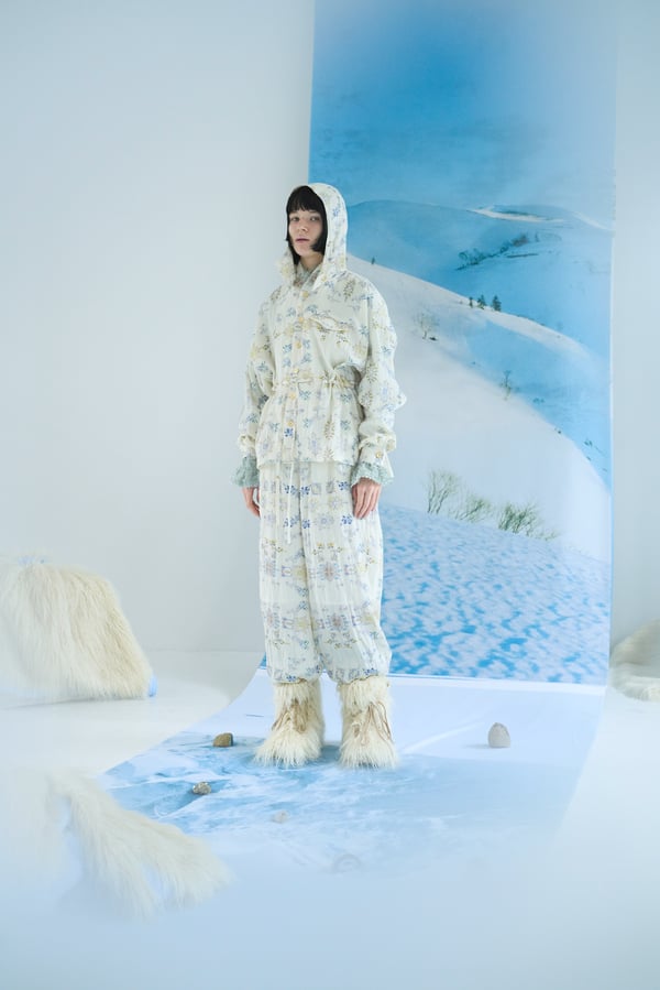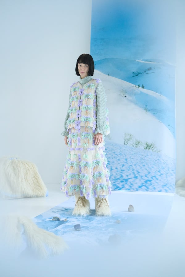 「ケイコ ニシヤマ(KEIKO NISHIYAMA)」が発表した2026年秋冬コレクション「- Cartography of Curiosity - 好奇心の地図製作」。氷の現象から着想を得た世界観を、尾州のカナーレジャパンとの協業で手掛けたオリジナルテキスタイルなどを用いて表現。
