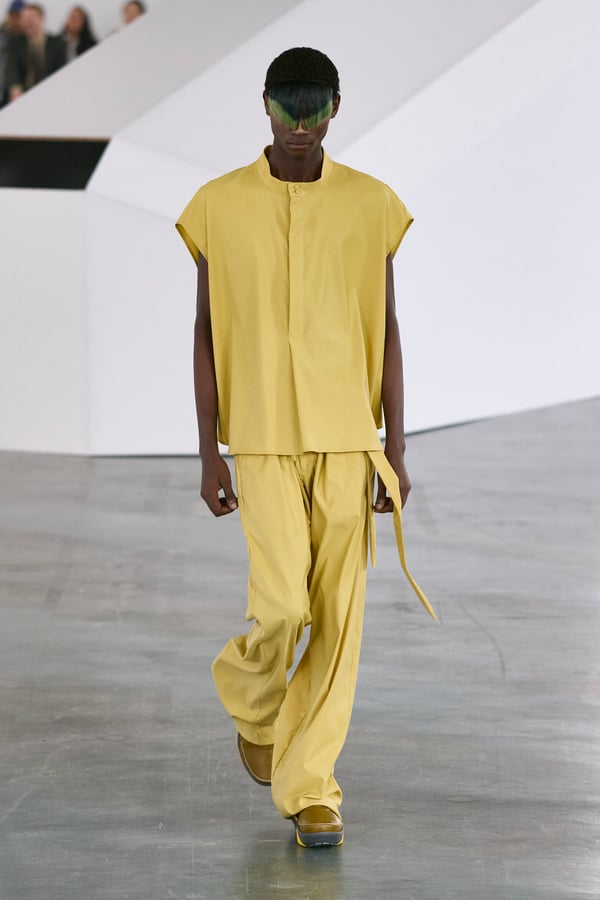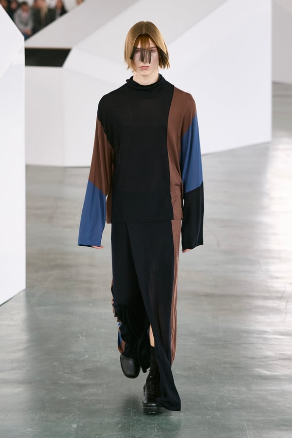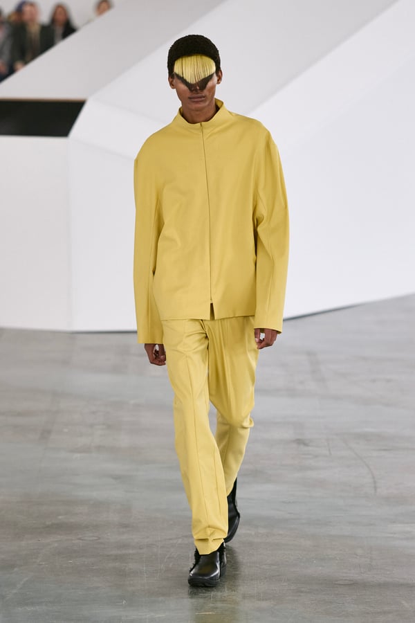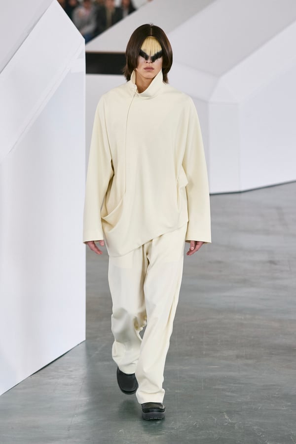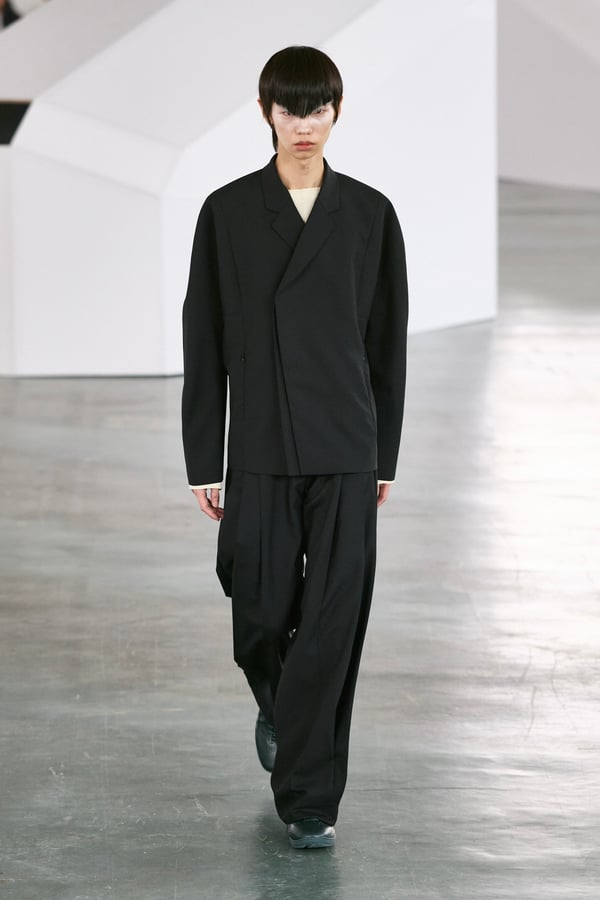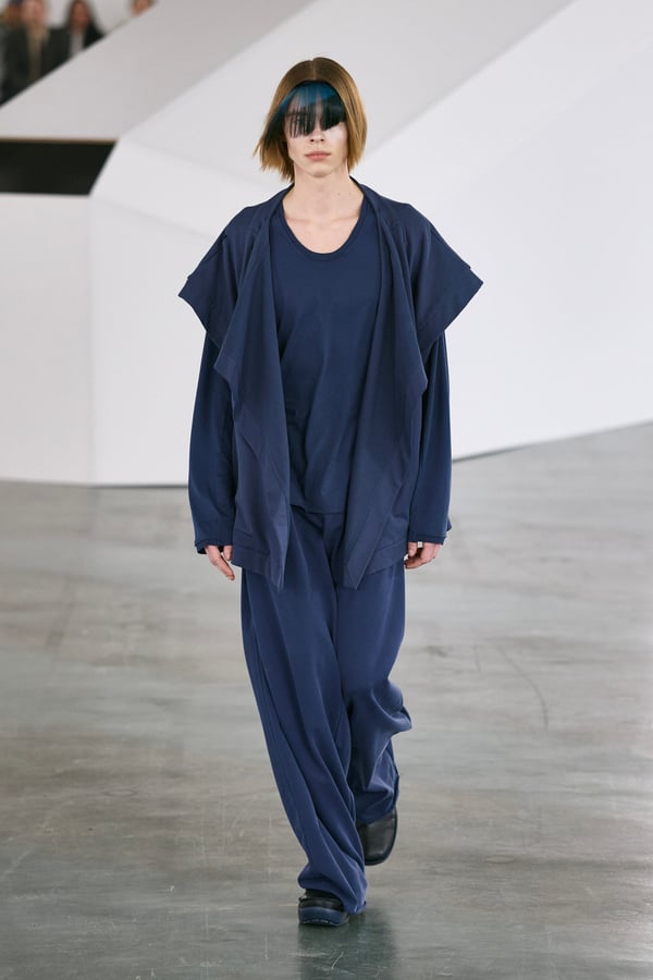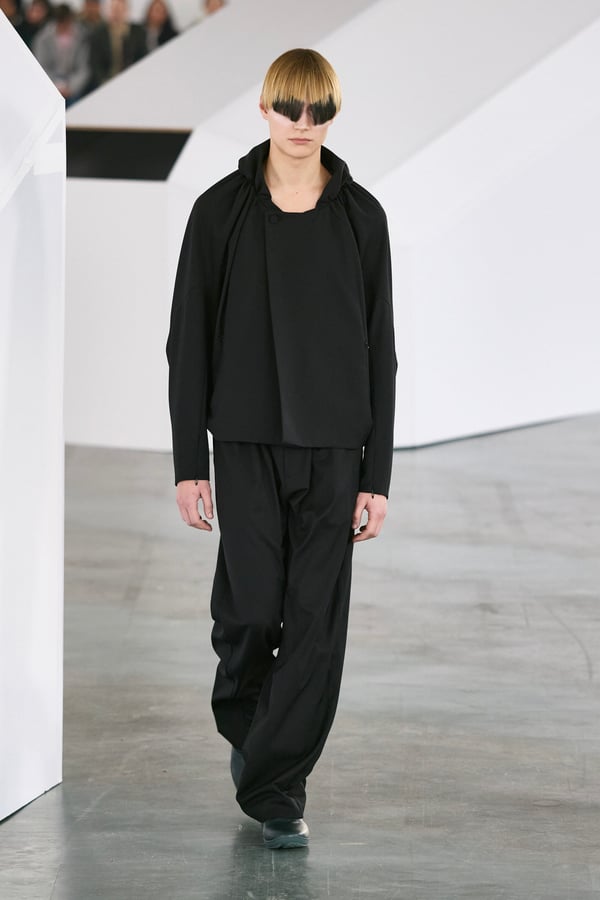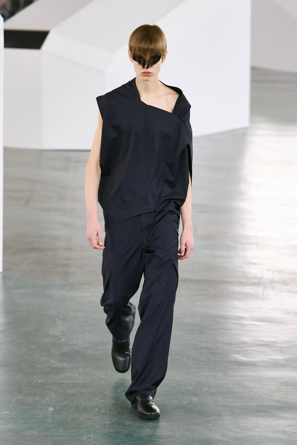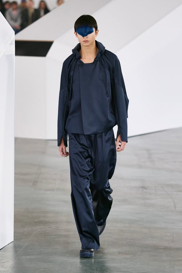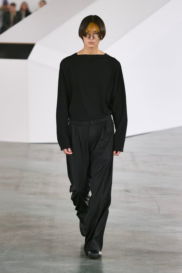 アイテムは既存のカテゴライズを拒むものが多く、プルオーバーとシャツの中間に位置するトップスや、スカートの要素を持つトラウザーズなどが登場。視覚的なノイズを排除するため、ジッパーは一切露出せず、ボタンも比翼や共布で隠された。素材は加工よりも質感を優先し、シルク、カシミア、ロロ・ピアーナ社のウールを多用。黒、青、グレーを基調に、朱色や硫黄色が差し色として機能した。
