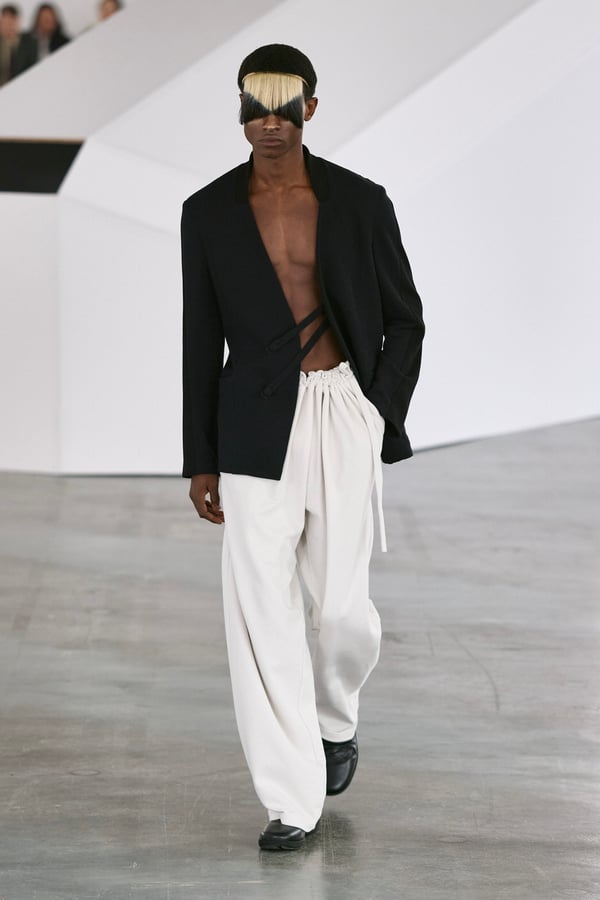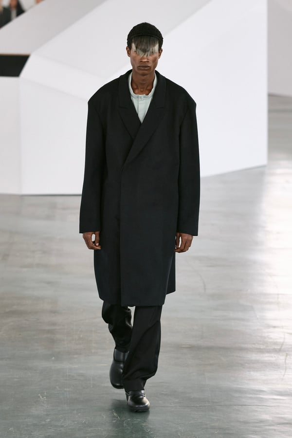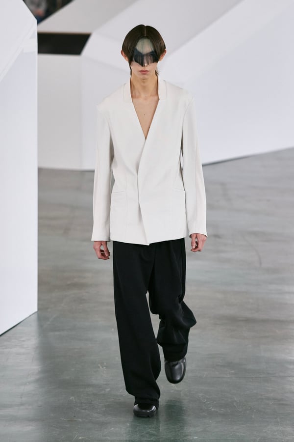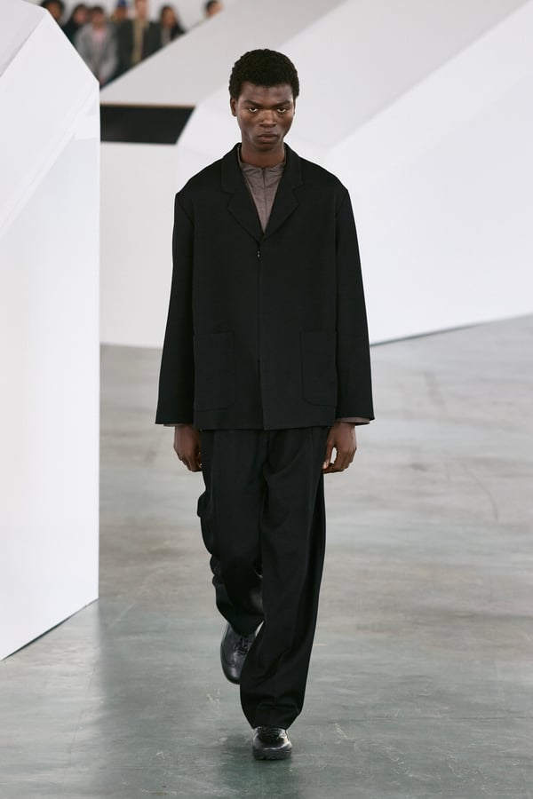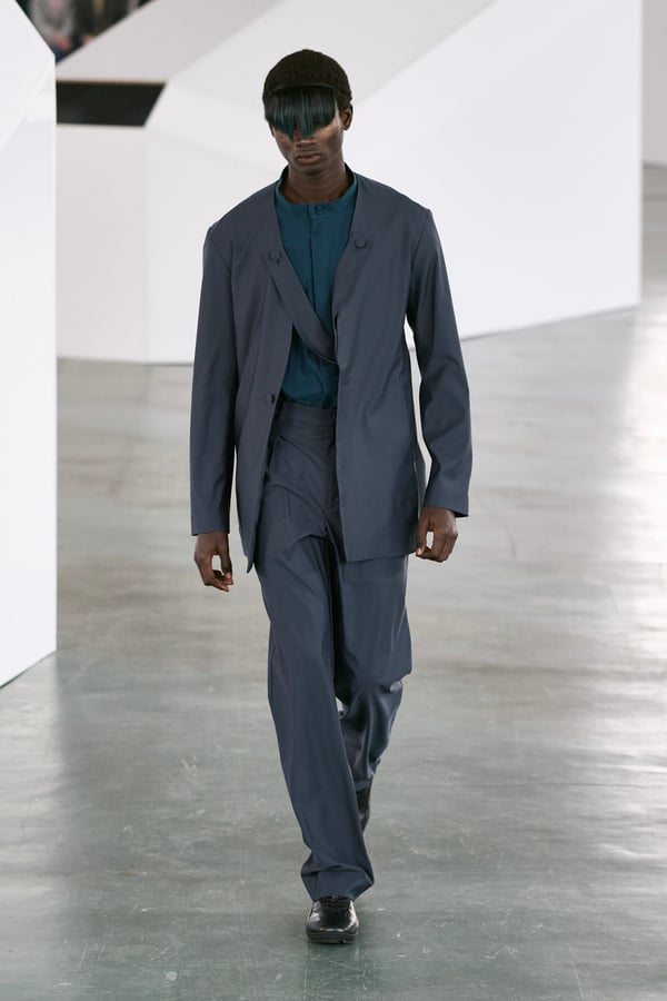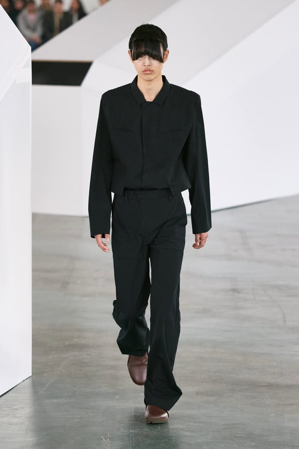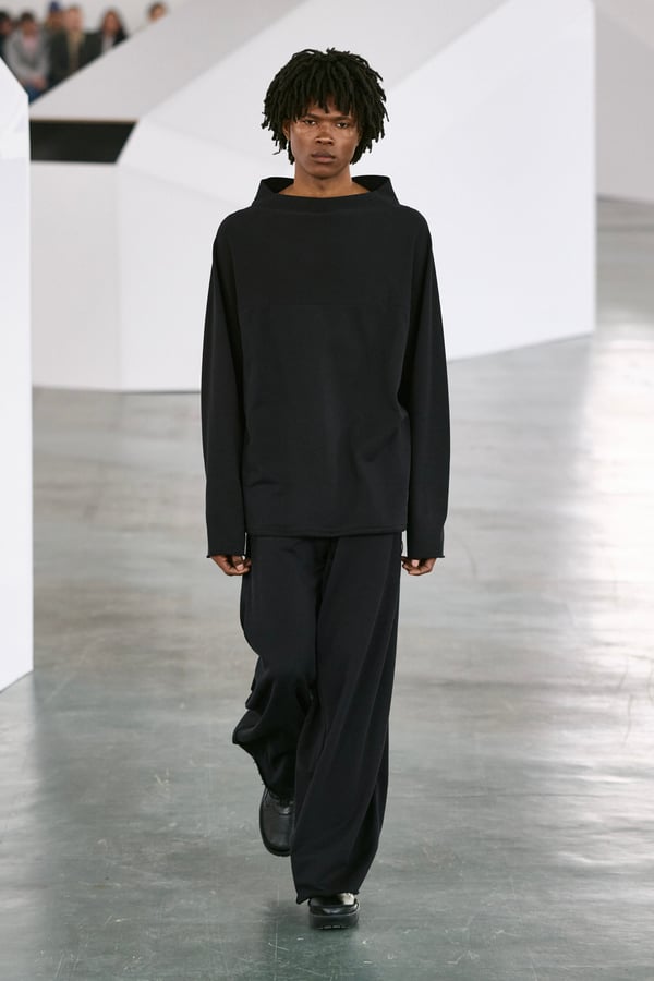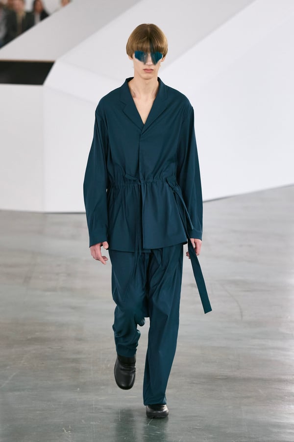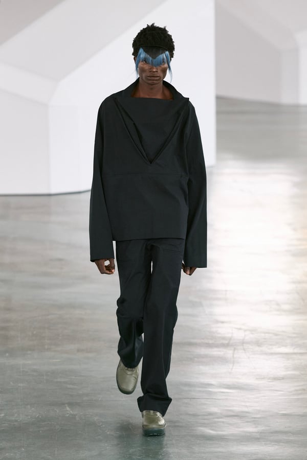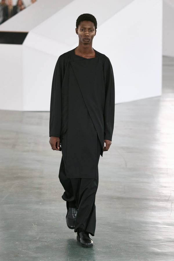 アイテムは既存のカテゴライズを拒むものが多く、プルオーバーとシャツの中間に位置するトップスや、スカートの要素を持つトラウザーズなどが登場。視覚的なノイズを排除するため、ジッパーは一切露出せず、ボタンも比翼や共布で隠された。素材は加工よりも質感を優先し、シルク、カシミア、ロロ・ピアーナ社のウールを多用。黒、青、グレーを基調に、朱色や硫黄色が差し色として機能した。