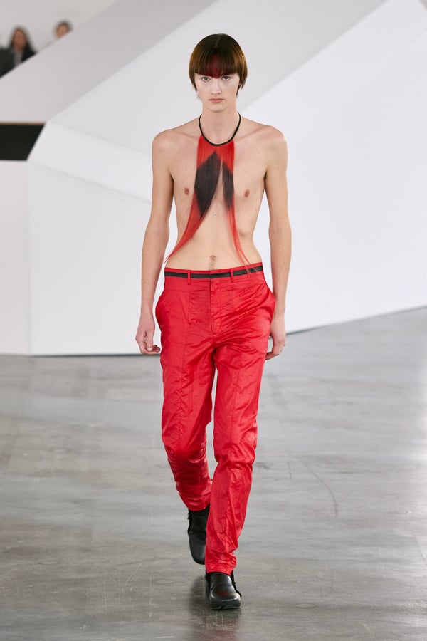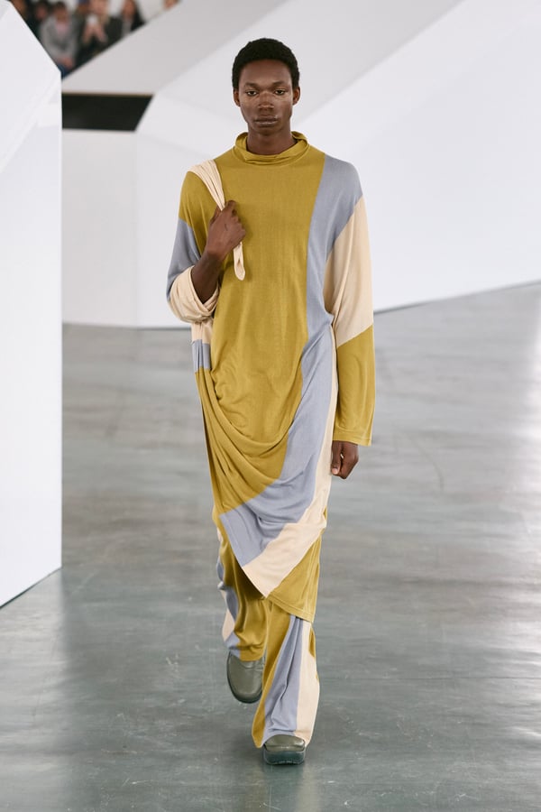 また、ウィッグアーティストの河野富広によるカラーウィッグバンドが幾何学的モチーフを強調。フットウェアでは「クロックス(Crocs)」とのコラボレーションとして、ハトメを排したミニマルかつ建築的なシューズを発表した。