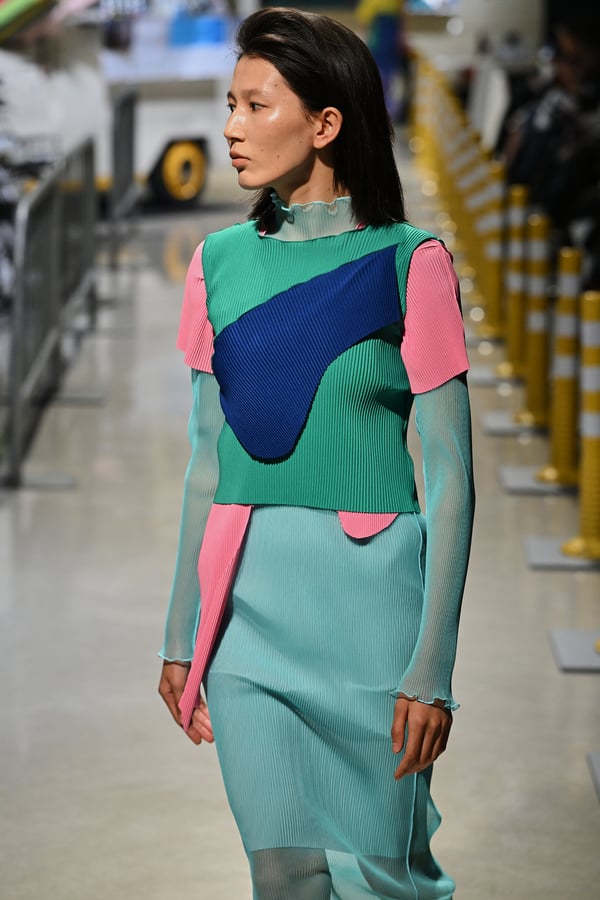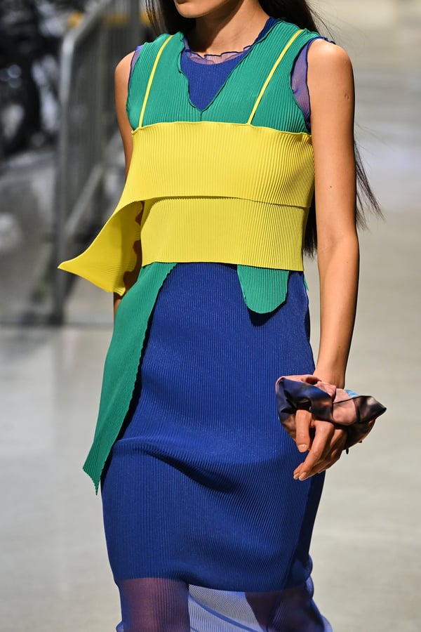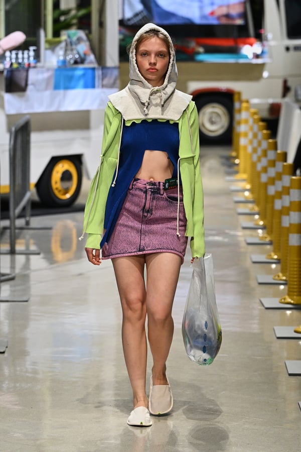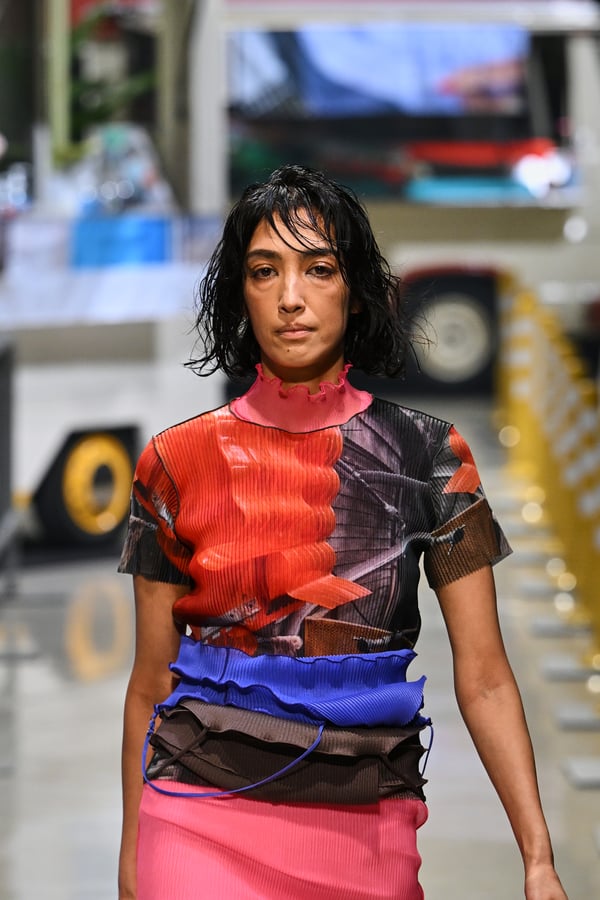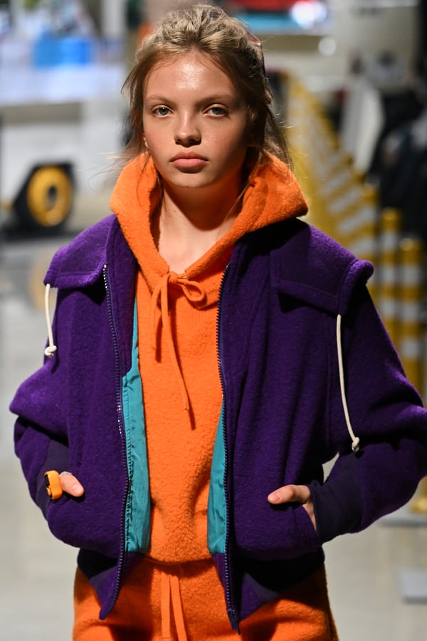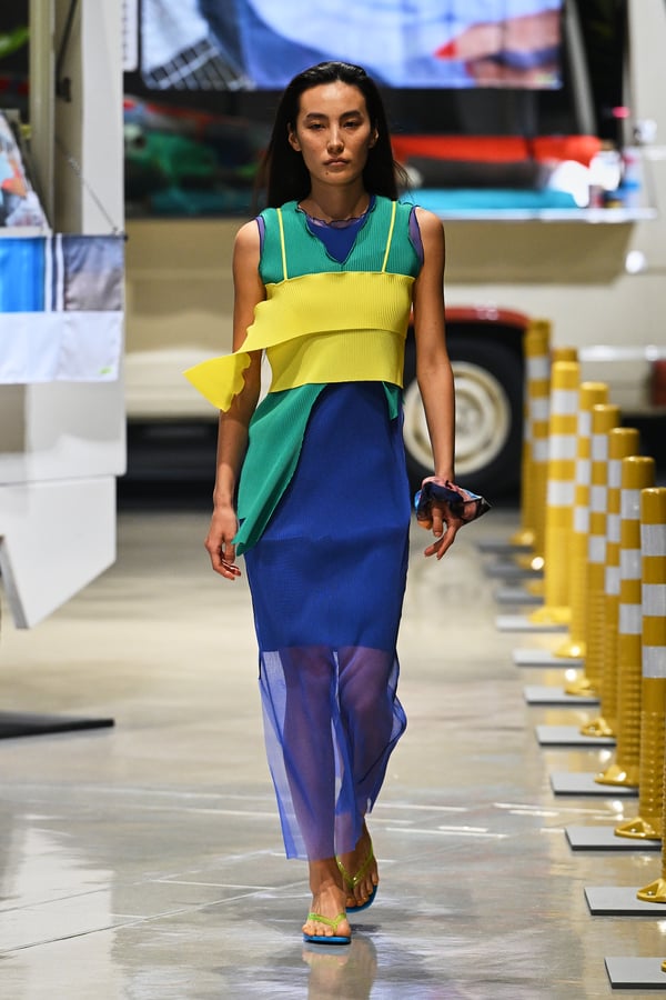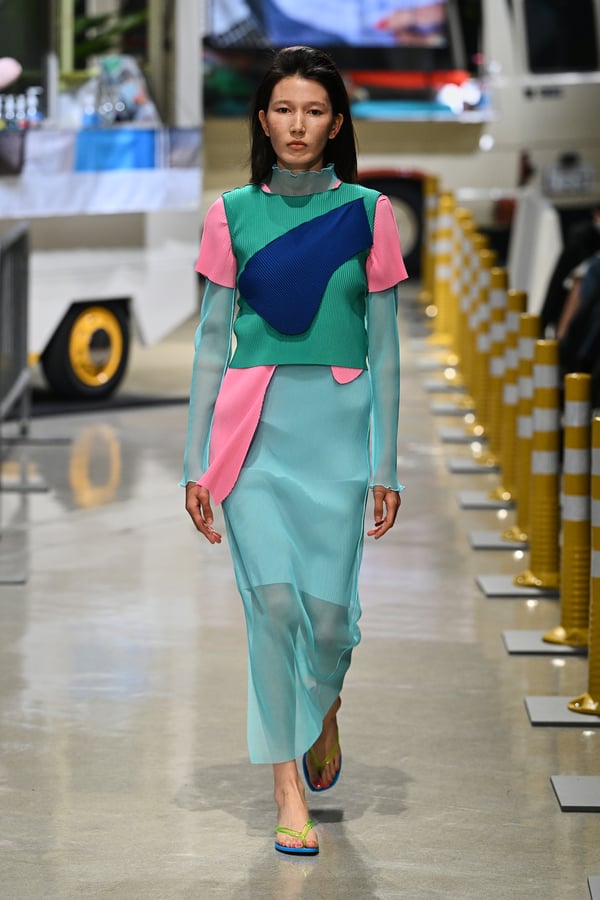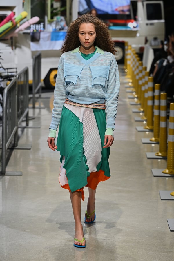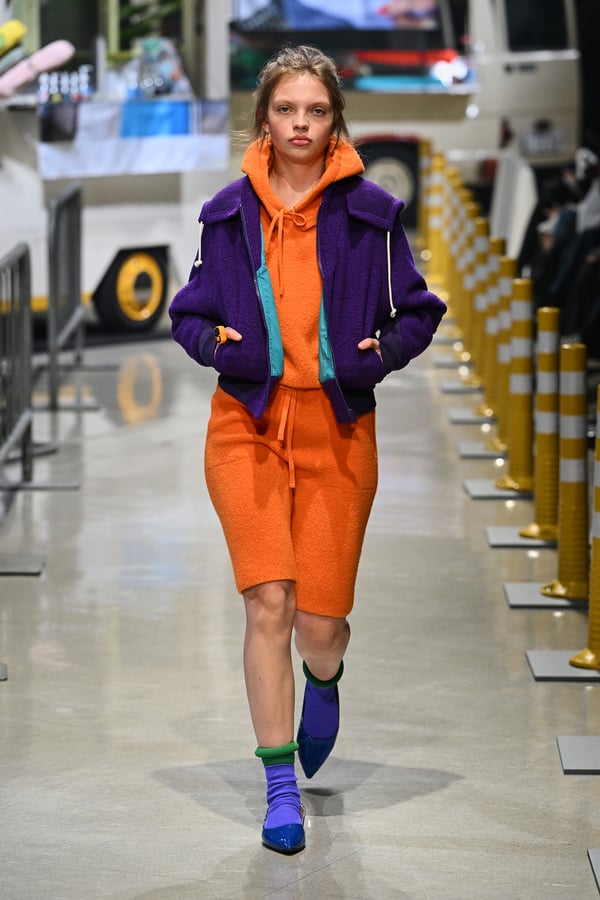 コレクションでは、東京マラソンのランナーがまとう蛍光カラーや、旅行者の機能的でエフォートレスなファッション、ビーチウェアを手に取り自由に組み合わせたような、カラフルで「ちぐはぐな」レイヤードをスタイルを提案。ブランドのシグネチャーであるプリーツやデニム、スウェットといったアイテムを軸に、ビーチタオルを巻きつけたようなスカートや、スイムウェア素材を用いたコンパクトなトップス、ランニングウェアのようなカラフルでタイトなトップスやレギンスなど、今季のテーマを感じるエッセンスを随所に散りばめた。秋冬らしからぬカラフルな色彩と薄手のファブリック、柄が幾重にも重なる、コトハヨコザワらしい明るく開放感あふれるワードローブを、過去数シーズンのアーカイヴも交えながら披露した。