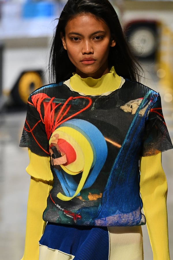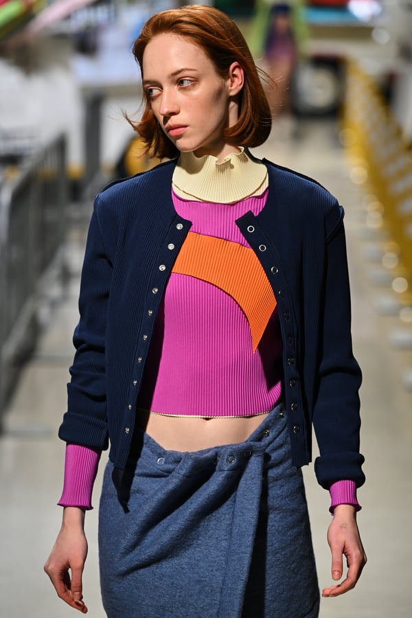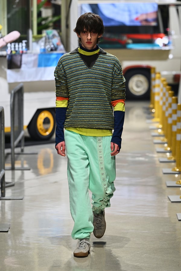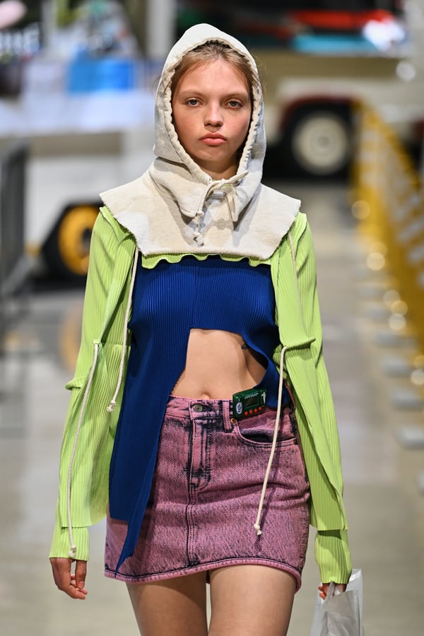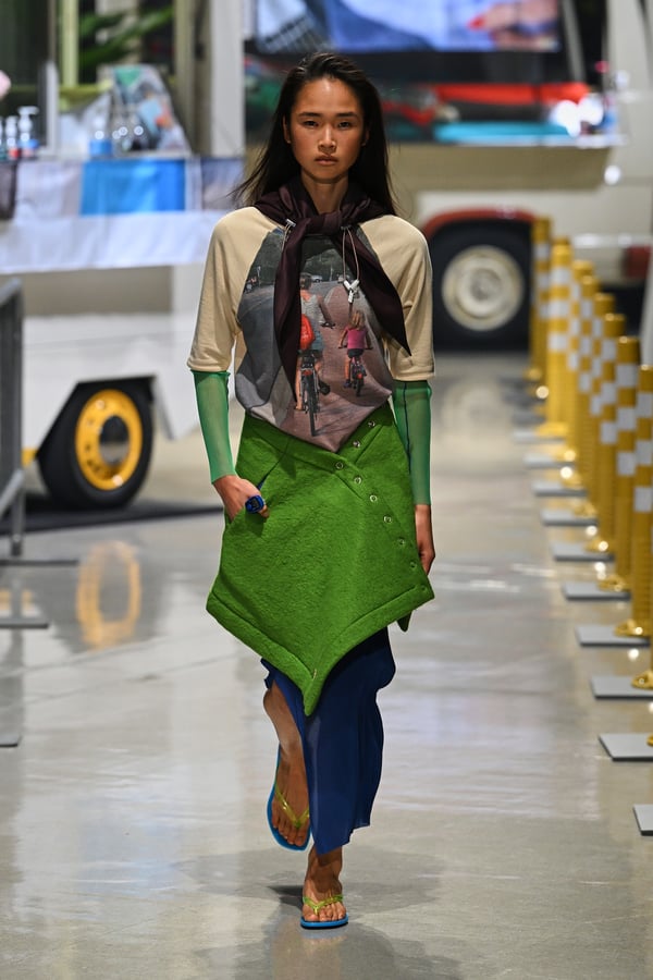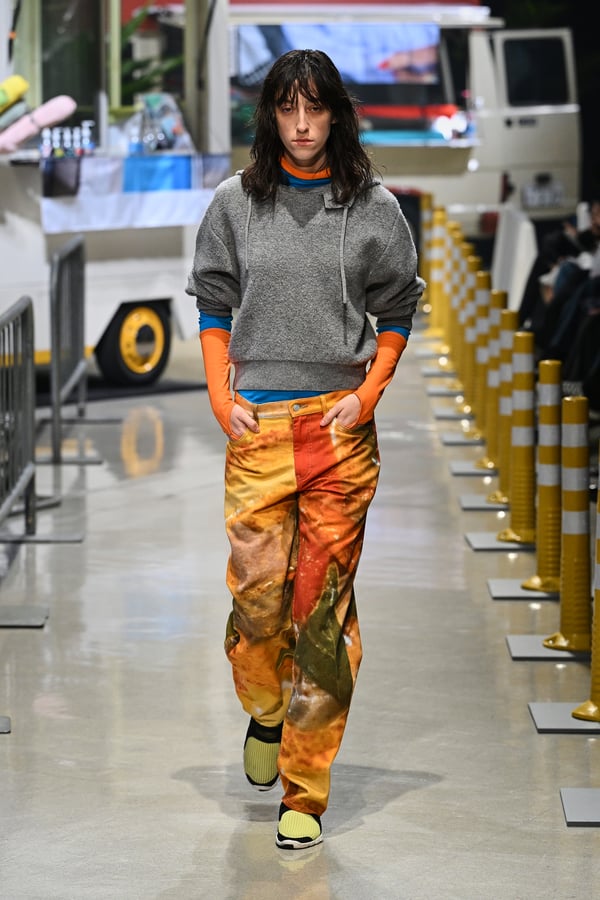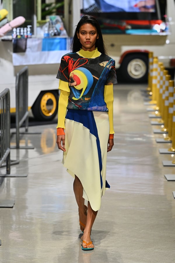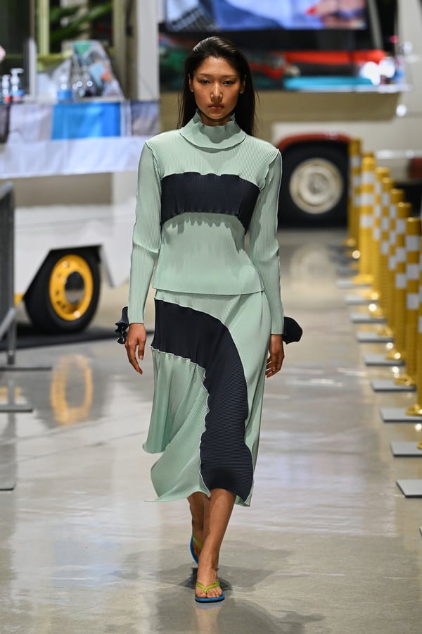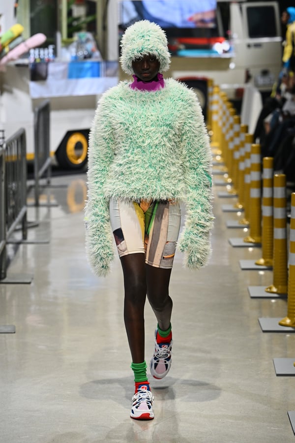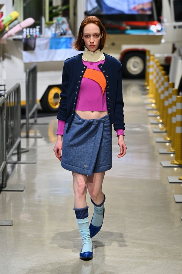 コレクションでは、東京マラソンのランナーがまとう蛍光カラーや、旅行者の機能的でエフォートレスなファッション、ビーチウェアを手に取り自由に組み合わせたような、カラフルで「ちぐはぐな」レイヤードをスタイルを提案。ブランドのシグネチャーであるプリーツやデニム、スウェットといったアイテムを軸に、ビーチタオルを巻きつけたようなスカートや、スイムウェア素材を用いたコンパクトなトップス、ランニングウェアのようなカラフルでタイトなトップスやレギンスなど、今季のテーマを感じるエッセンスを随所に散りばめた。秋冬らしからぬカラフルな色彩と薄手のファブリック、柄が幾重にも重なる、コトハヨコザワらしい明るく開放感あふれるワードローブを、過去数シーズンのアーカイヴも交えながら披露した。