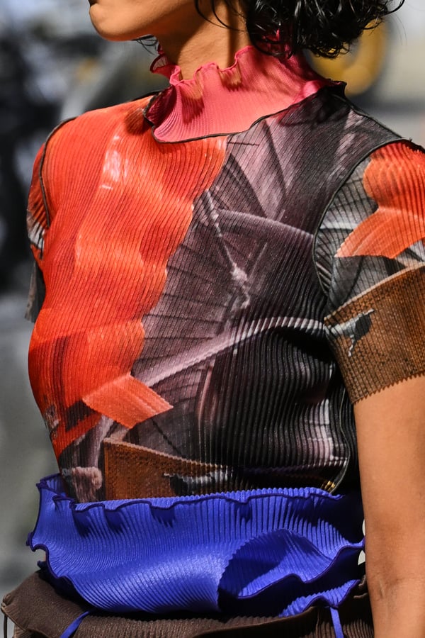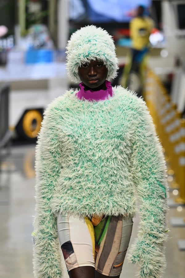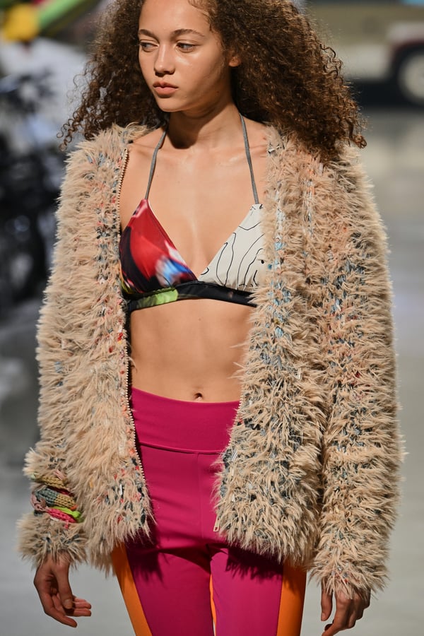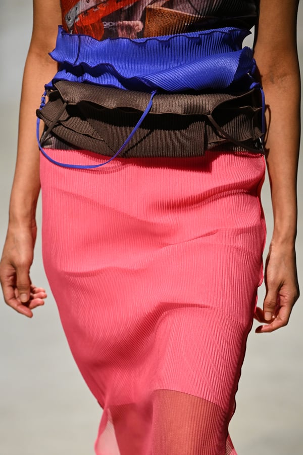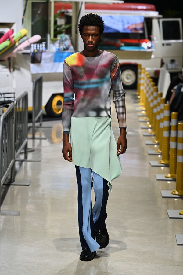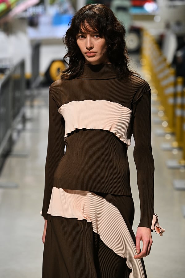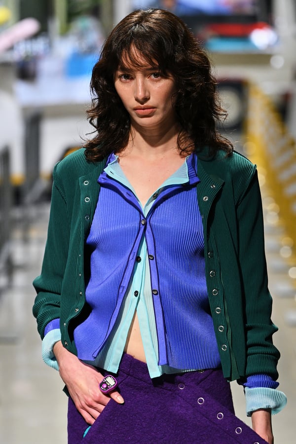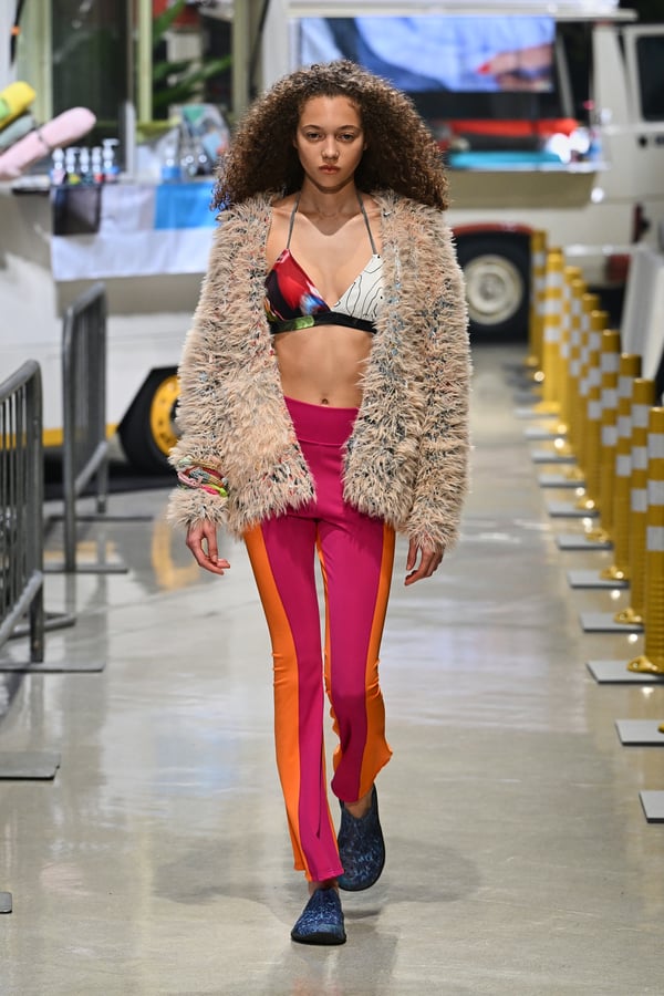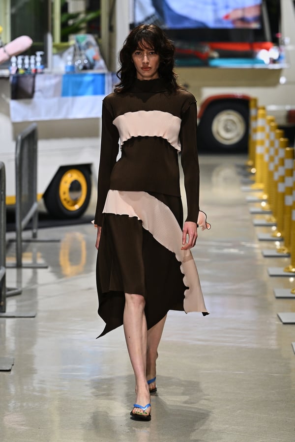 コレクションでは、東京マラソンのランナーがまとう蛍光カラーや、旅行者の機能的でエフォートレスなファッション、ビーチウェアを手に取り自由に組み合わせたような、カラフルで「ちぐはぐな」レイヤードをスタイルを提案。ブランドのシグネチャーであるプリーツやデニム、スウェットといったアイテムを軸に、ビーチタオルを巻きつけたようなスカートや、スイムウェア素材を用いたコンパクトなトップス、ランニングウェアのようなカラフルでタイトなトップスやレギンスなど、今季のテーマを感じるエッセンスを随所に散りばめた。秋冬らしからぬカラフルな色彩と薄手のファブリック、柄が幾重にも重なる、コトハヨコザワらしい明るく開放感あふれるワードローブを、過去数シーズンのアーカイヴも交えながら披露した。