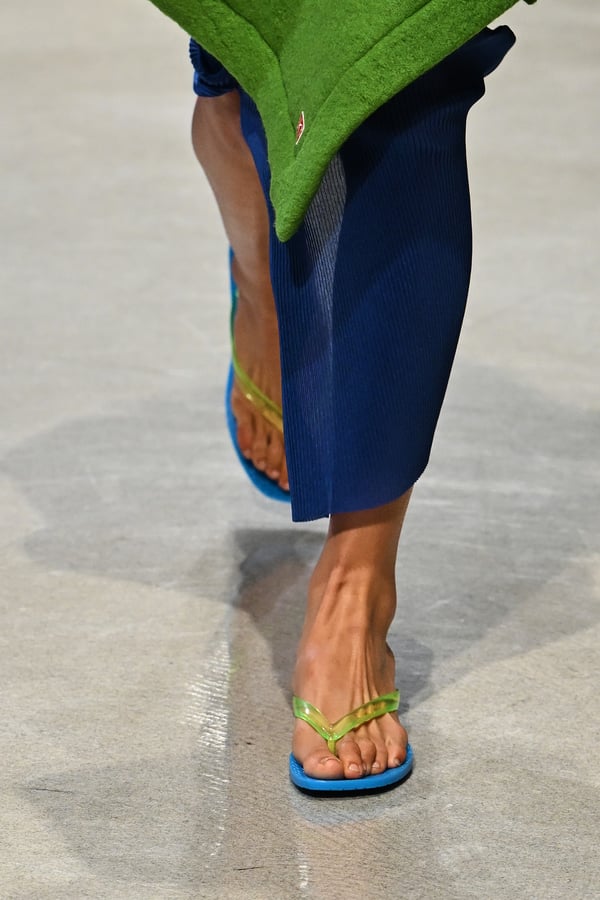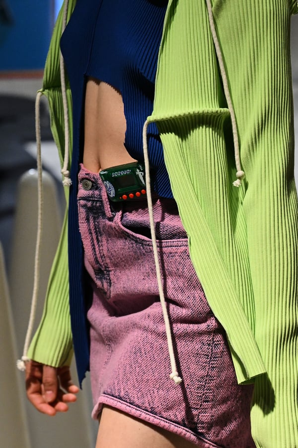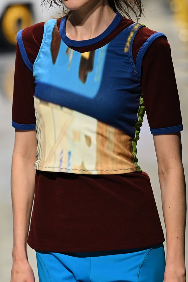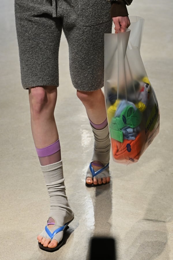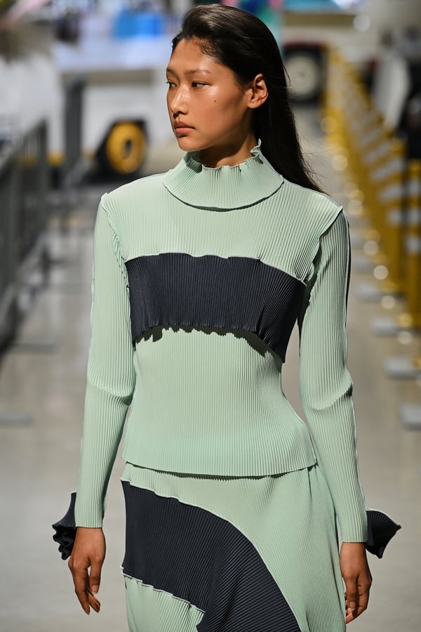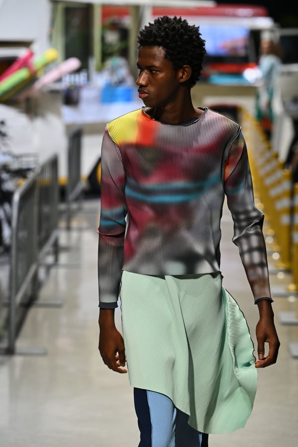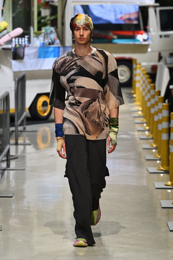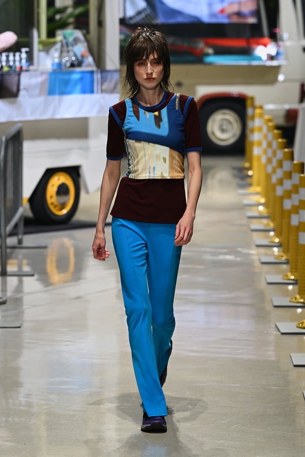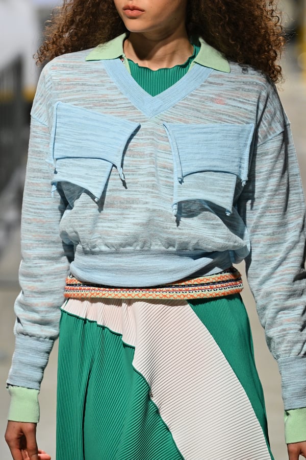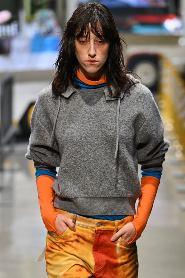 コレクションでは、東京マラソンのランナーがまとう蛍光カラーや、旅行者の機能的でエフォートレスなファッション、ビーチウェアを手に取り自由に組み合わせたような、カラフルで「ちぐはぐな」レイヤードをスタイルを提案。ブランドのシグネチャーであるプリーツやデニム、スウェットといったアイテムを軸に、ビーチタオルを巻きつけたようなスカートや、スイムウェア素材を用いたコンパクトなトップス、ランニングウェアのようなカラフルでタイトなトップスやレギンスなど、今季のテーマを感じるエッセンスを随所に散りばめた。秋冬らしからぬカラフルな色彩と薄手のファブリック、柄が幾重にも重なる、コトハヨコザワらしい明るく開放感あふれるワードローブを、過去数シーズンのアーカイヴも交えながら披露した。
