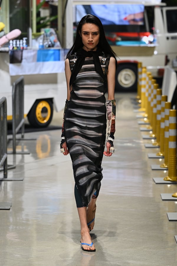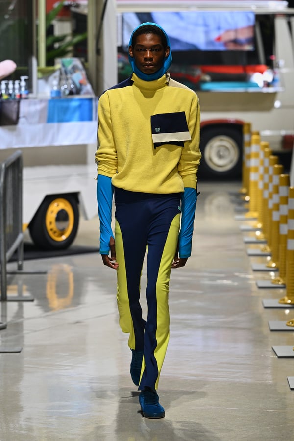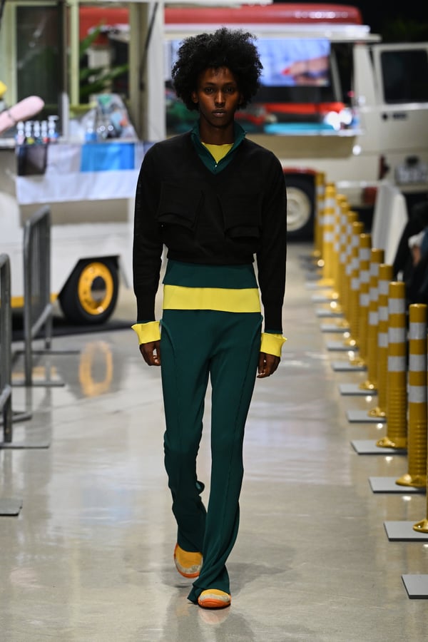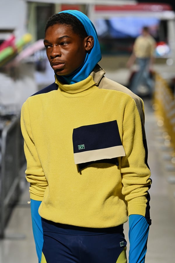 今季のタイトルは「IN THIS TEMPORARY CITY」。デザイナーの横澤が拠点とする西新宿の、留学生や観光客、ランナーたちが昼夜問わず行き交う風景に異国の旅先で感じる高揚感を重ね合わせ、その自由で活気溢れるムードや風景を服に落とし込んだ。