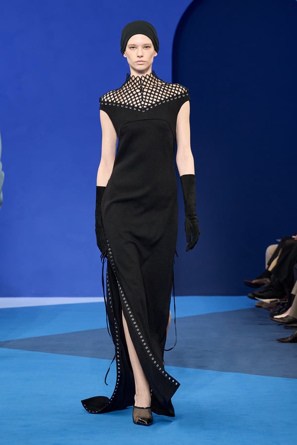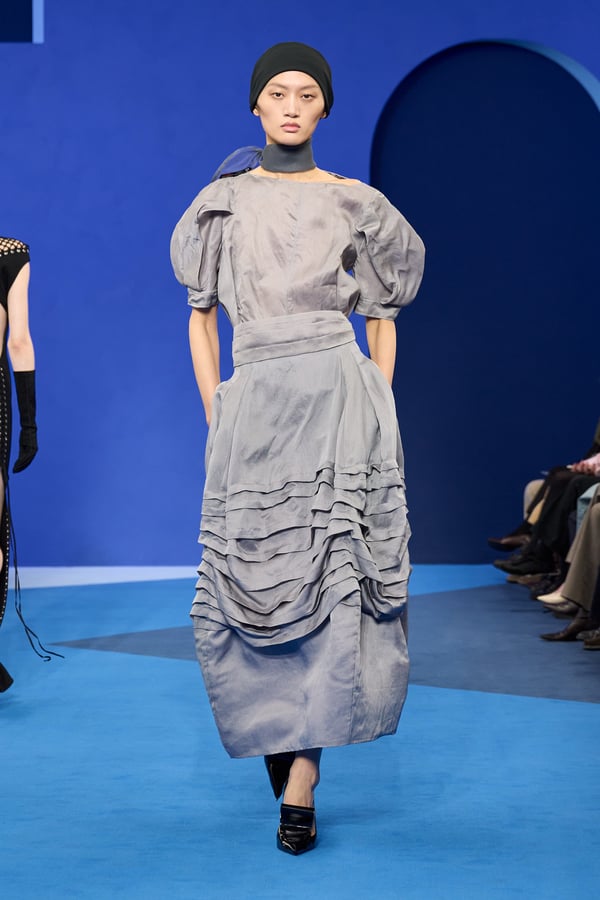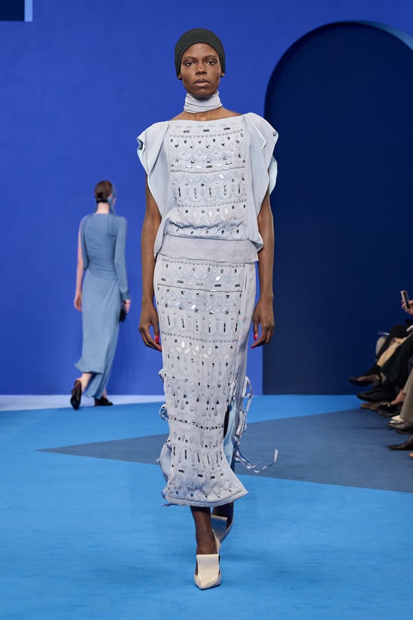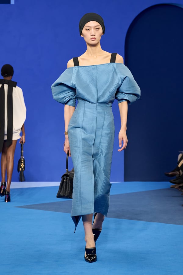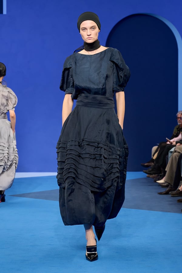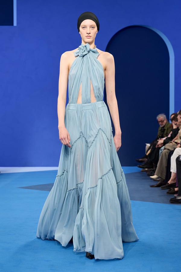 モノトーンのクラシカルなドレスからスタートしたコレクションは、グレーやさまざまなブルー、そして鮮やかなレッドやオレンジ、イエローグリーンに展開。シグネチャーのグログランリボンを、装飾としてだけではなく構造の一部として多用し、ドレスやテーラリングの裏側を強調するスタイルはクチュールメゾンの技術やプロセスを讃える。