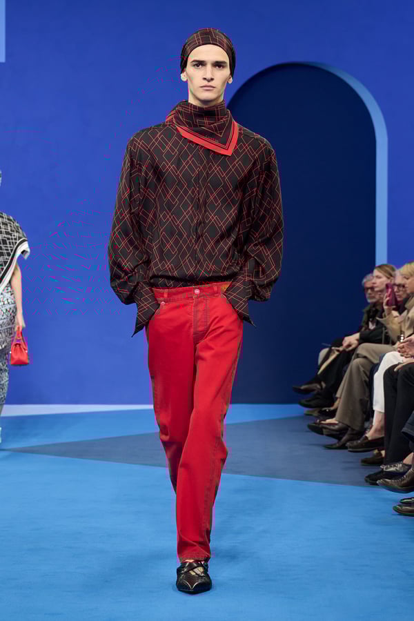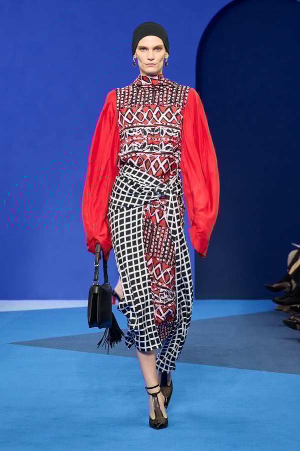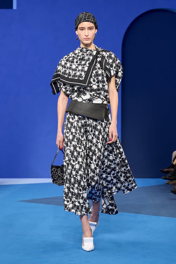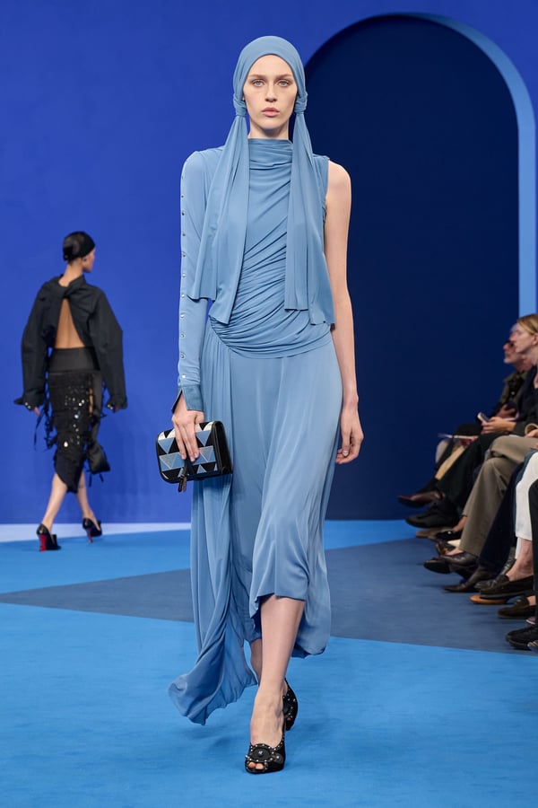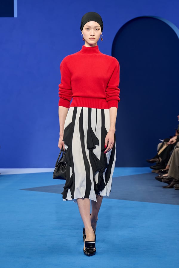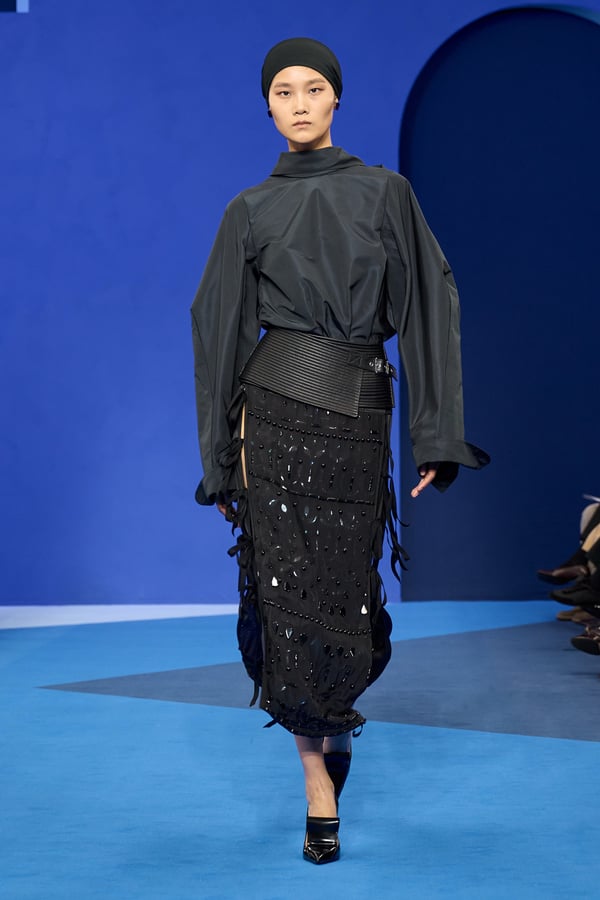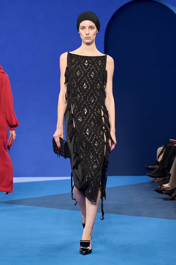 モノトーンのクラシカルなドレスからスタートしたコレクションは、グレーやさまざまなブルー、そして鮮やかなレッドやオレンジ、イエローグリーンに展開。シグネチャーのグログランリボンを、装飾としてだけではなく構造の一部として多用し、ドレスやテーラリングの裏側を強調するスタイルはクチュールメゾンの技術やプロセスを讃える。
