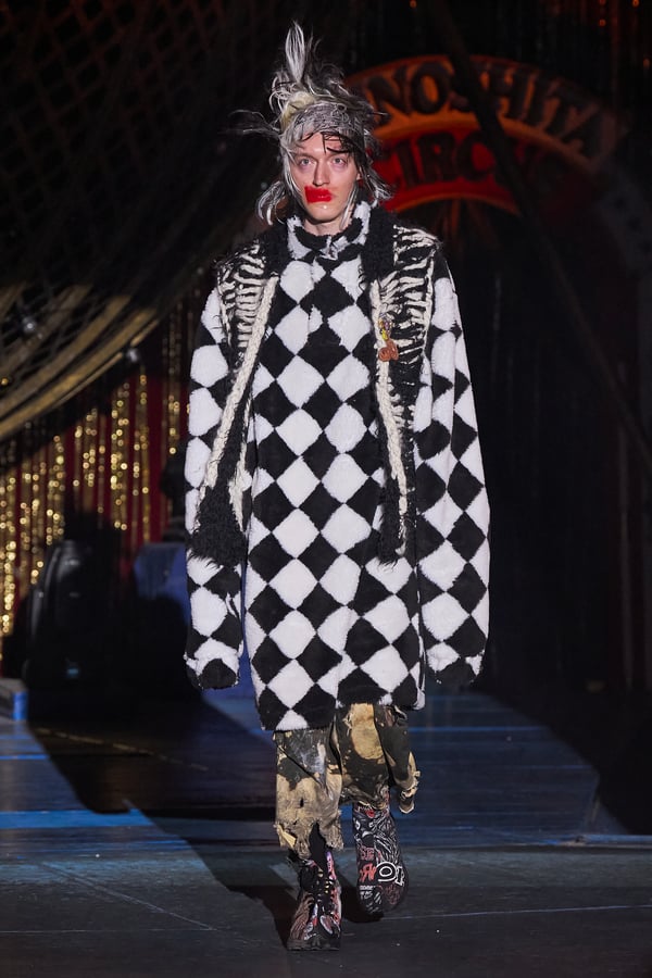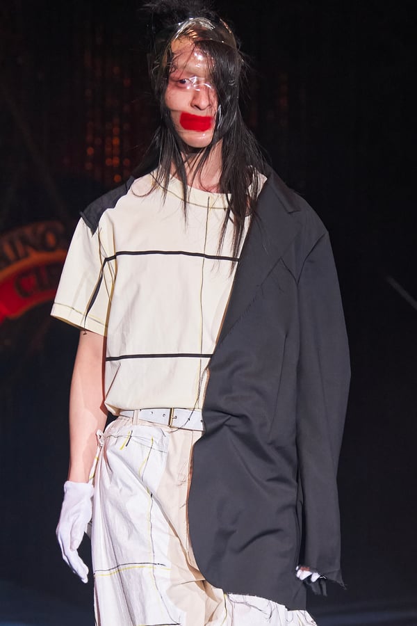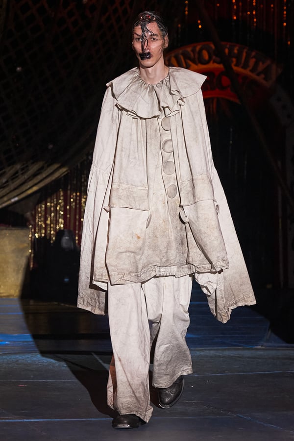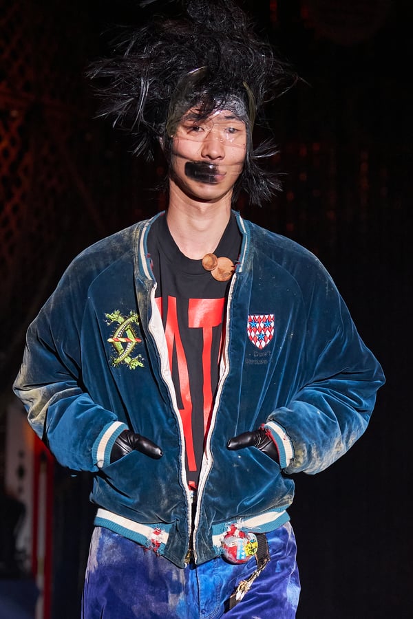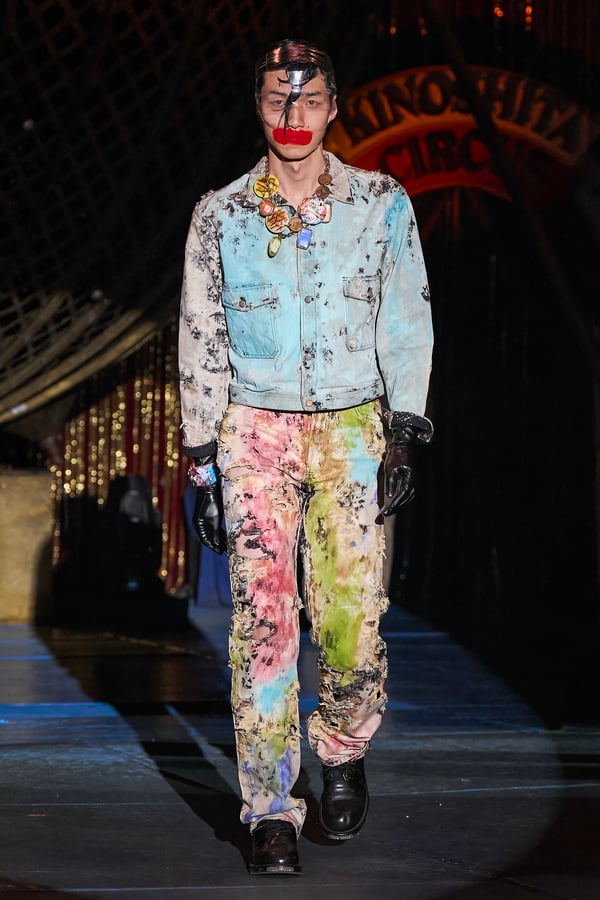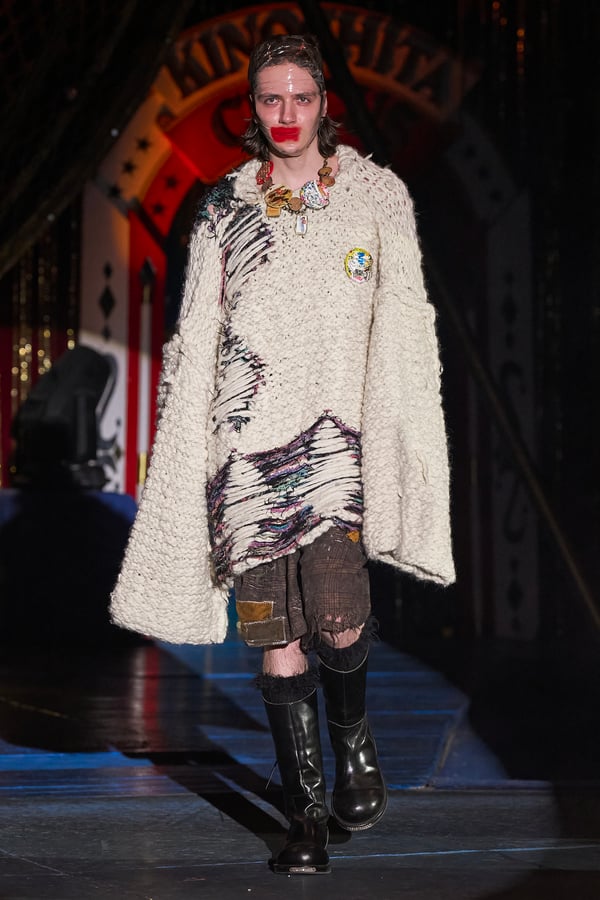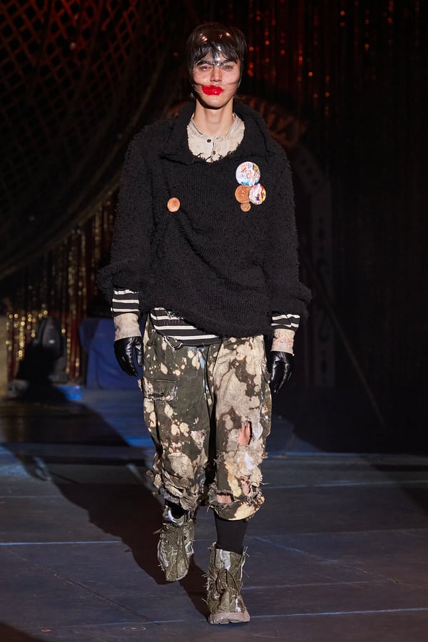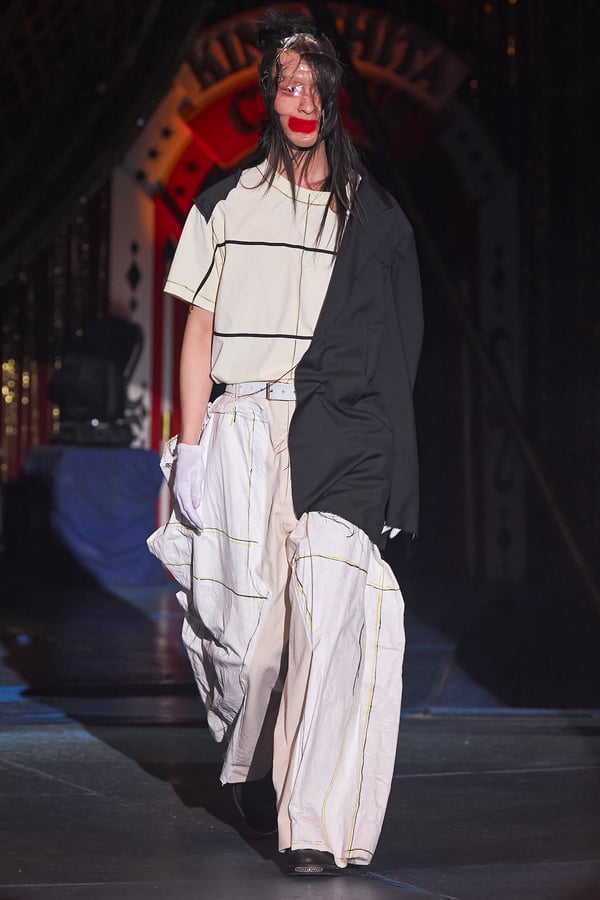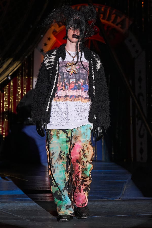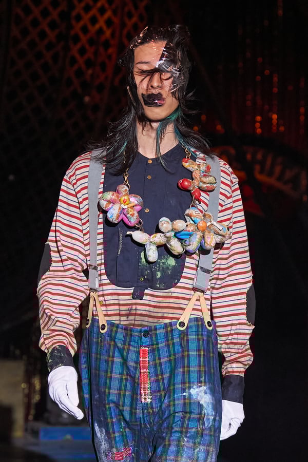今季のテーマは「MADNESS IS LIKE GRAVITY」。デザイナー川西が20年前ロンドンに渡った際に抱いたファッションの世界への憧れと、それからの20年間に経験したことを融合させ、クリエイションに落とし込んだ。ランウェイでは、ペイントやダメージ加工のデニム、ラメ、フリンジ、ハーレクイン柄など、装飾性が高いルックをピエロを彷彿とさせるヘアメイクと合わせて発表した。