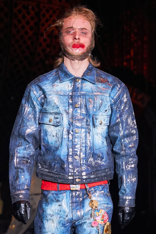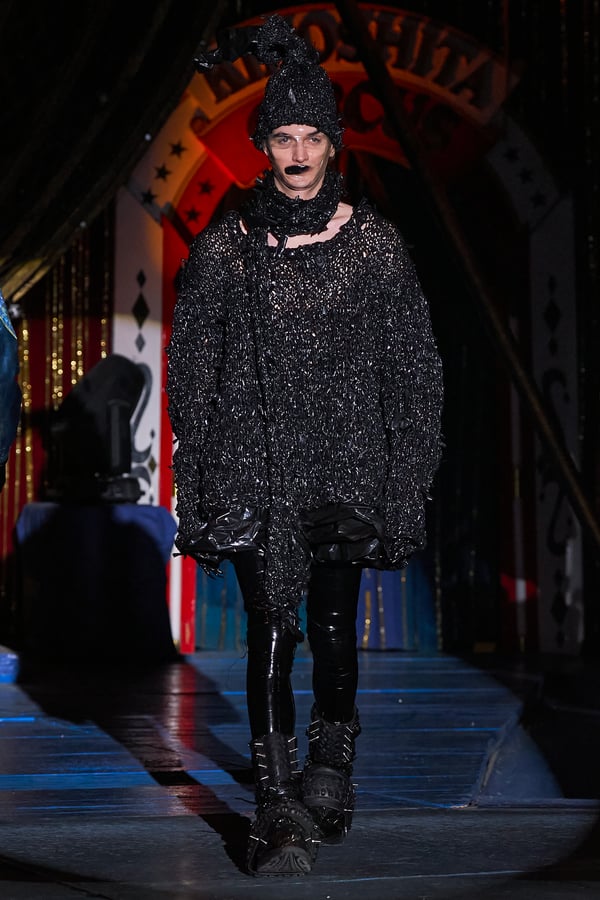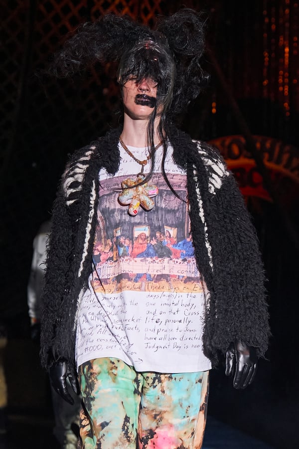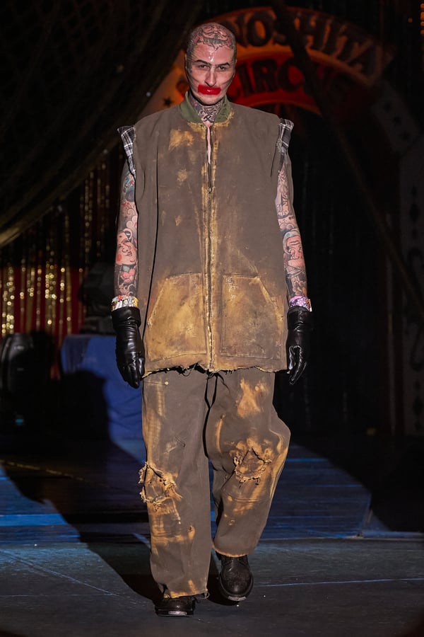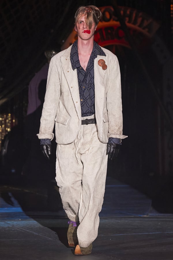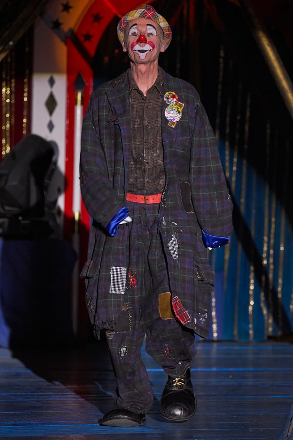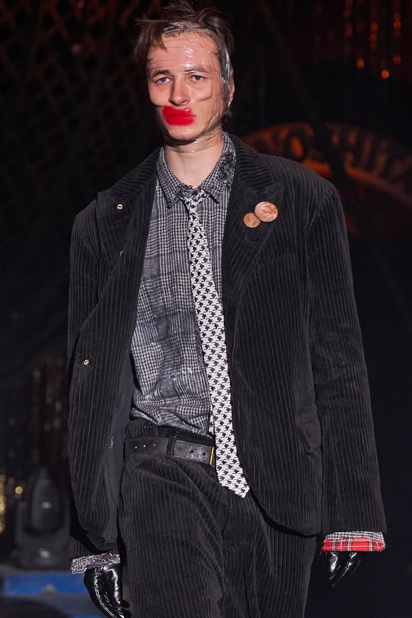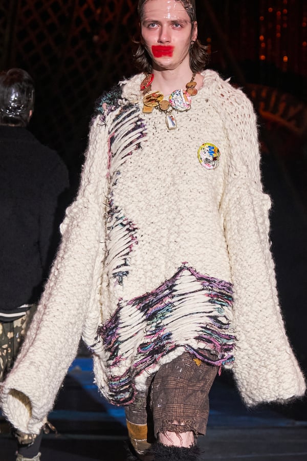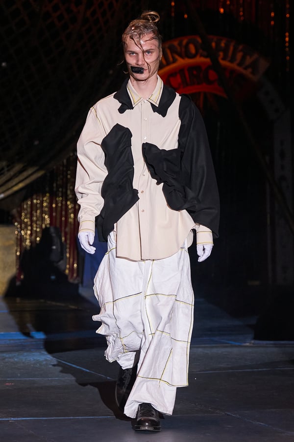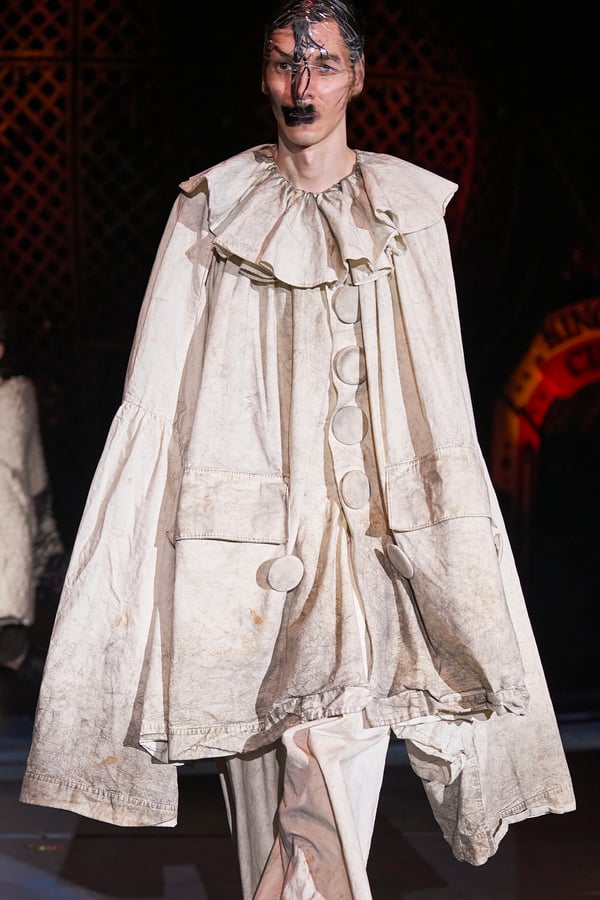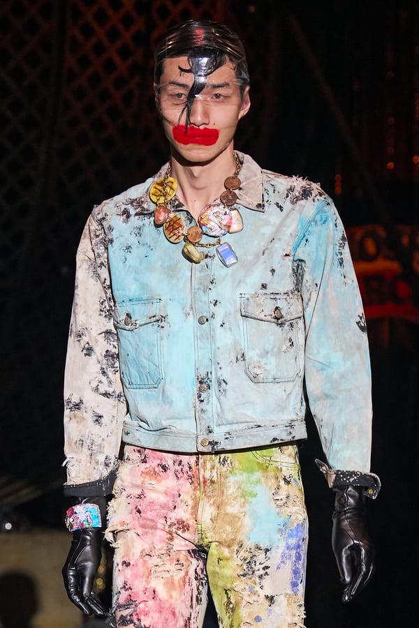 今季のテーマは「MADNESS IS LIKE GRAVITY」。デザイナー川西が20年前ロンドンに渡った際に抱いたファッションの世界への憧れと、それからの20年間に経験したことを融合させ、クリエイションに落とし込んだ。ランウェイでは、ペイントやダメージ加工のデニム、ラメ、フリンジ、ハーレクイン柄など、装飾性が高いルックをピエロを彷彿とさせるヘアメイクと合わせて発表した。