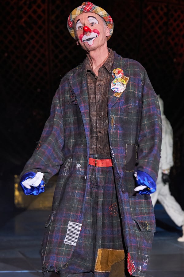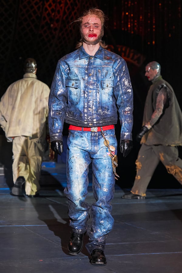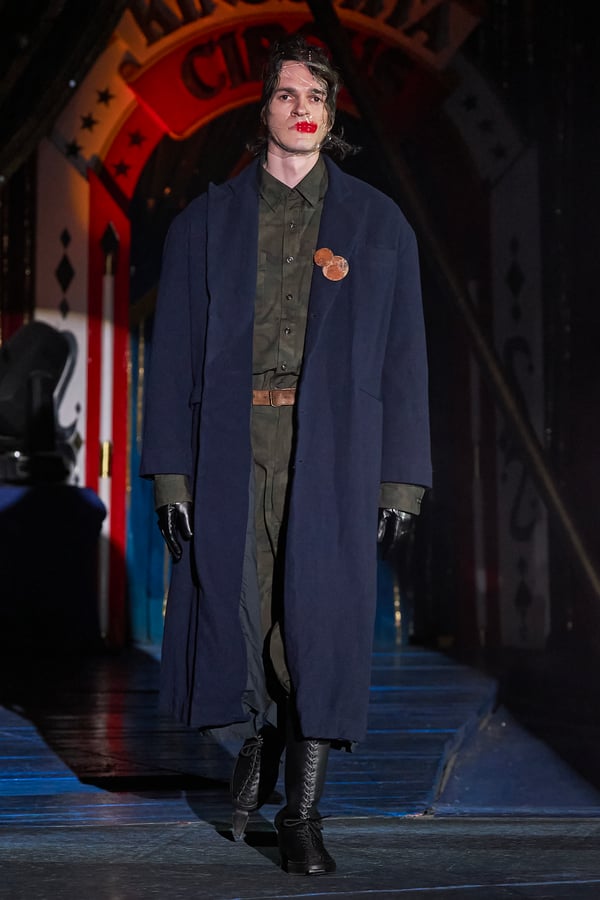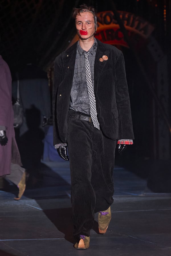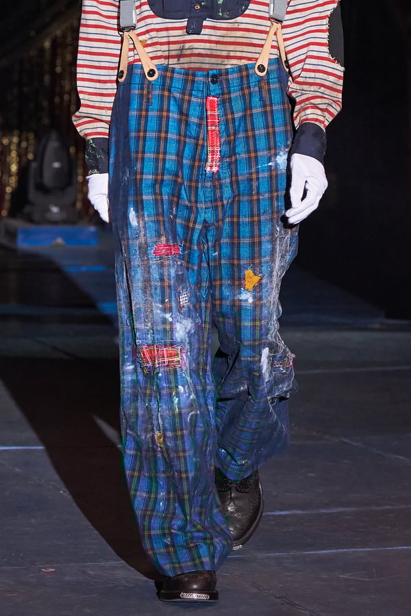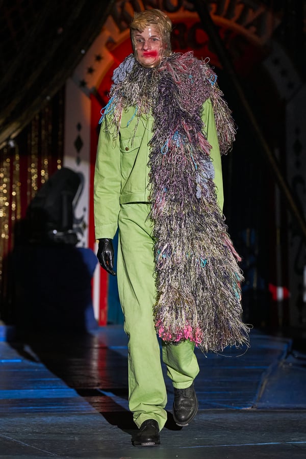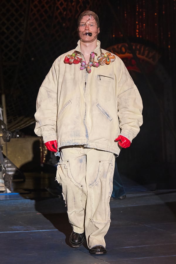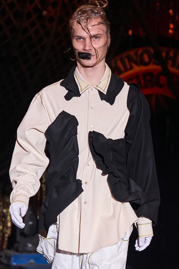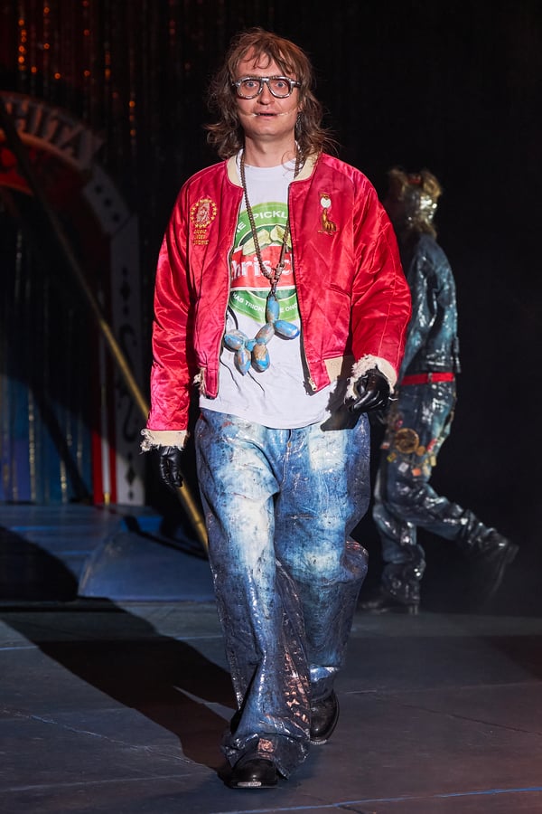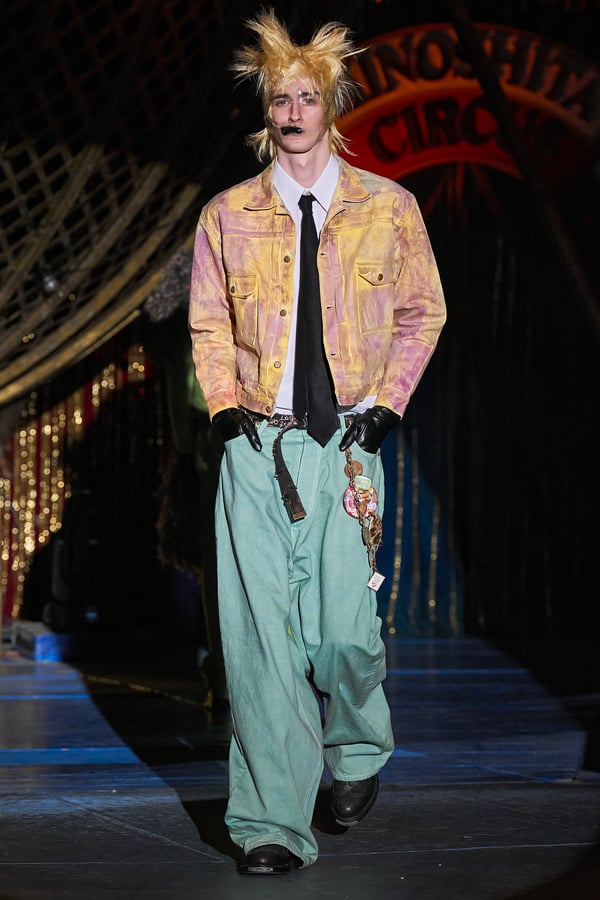 今季のテーマは「MADNESS IS LIKE GRAVITY」。デザイナー川西が20年前ロンドンに渡った際に抱いたファッションの世界への憧れと、それからの20年間に経験したことを融合させ、クリエイションに落とし込んだ。ランウェイでは、ペイントやダメージ加工のデニム、ラメ、フリンジ、ハーレクイン柄など、装飾性が高いルックをピエロを彷彿とさせるヘアメイクと合わせて発表した。