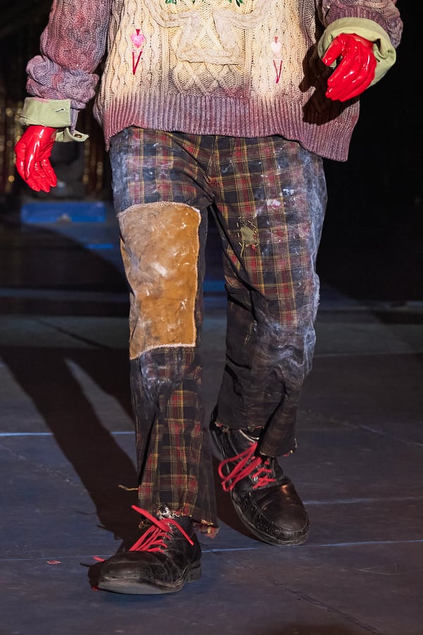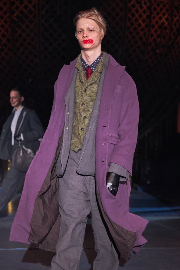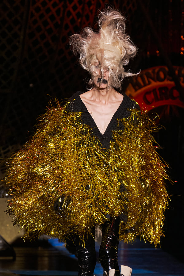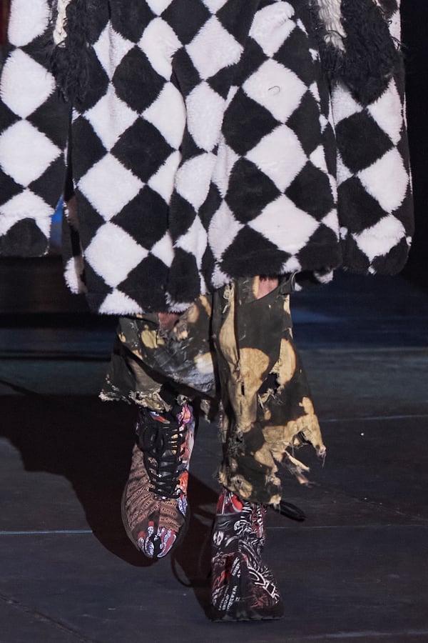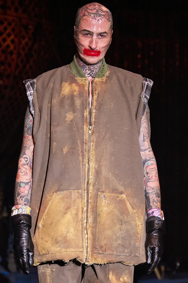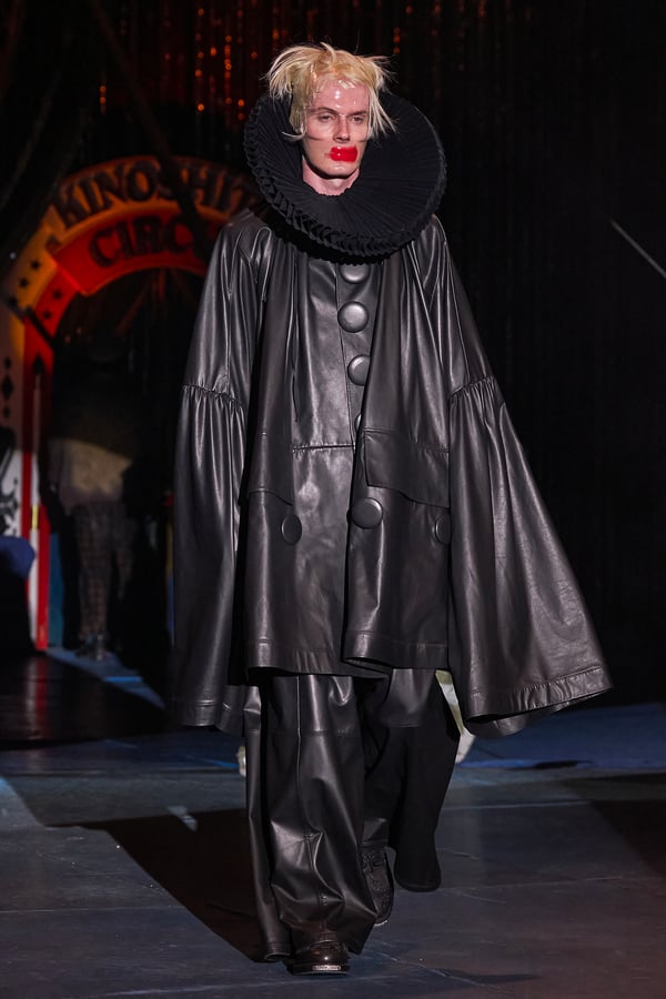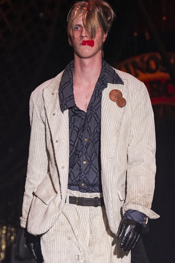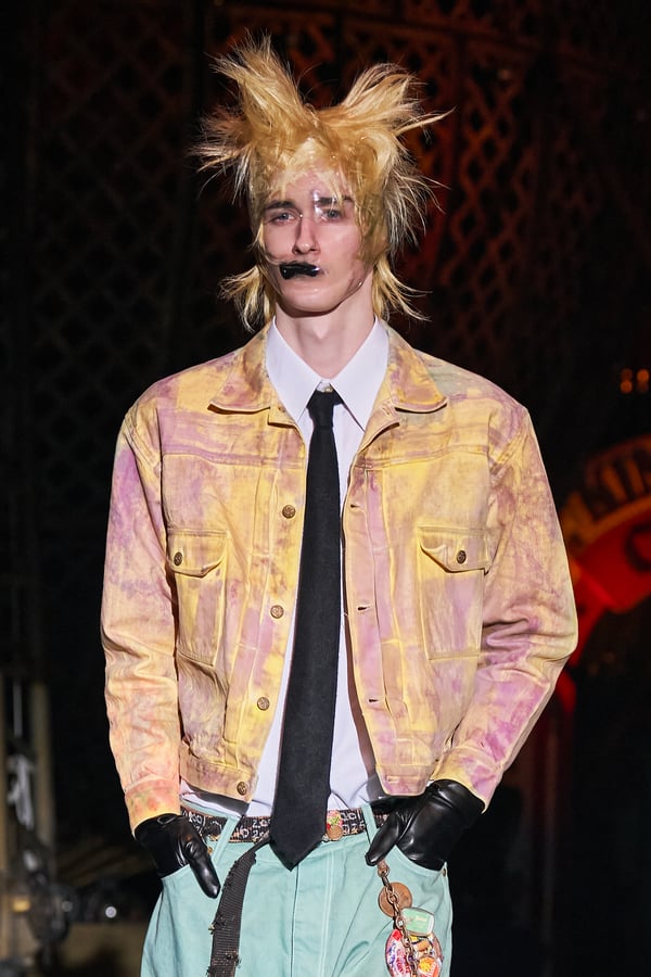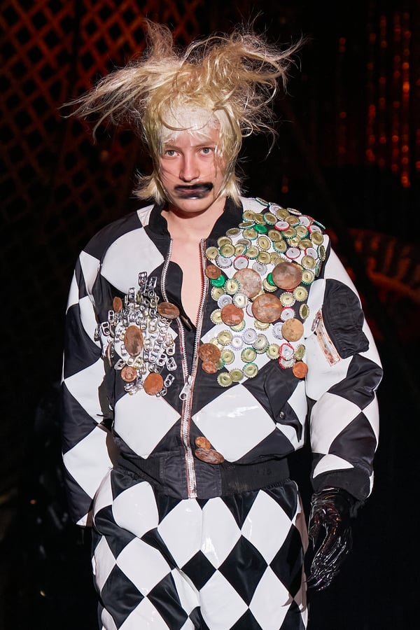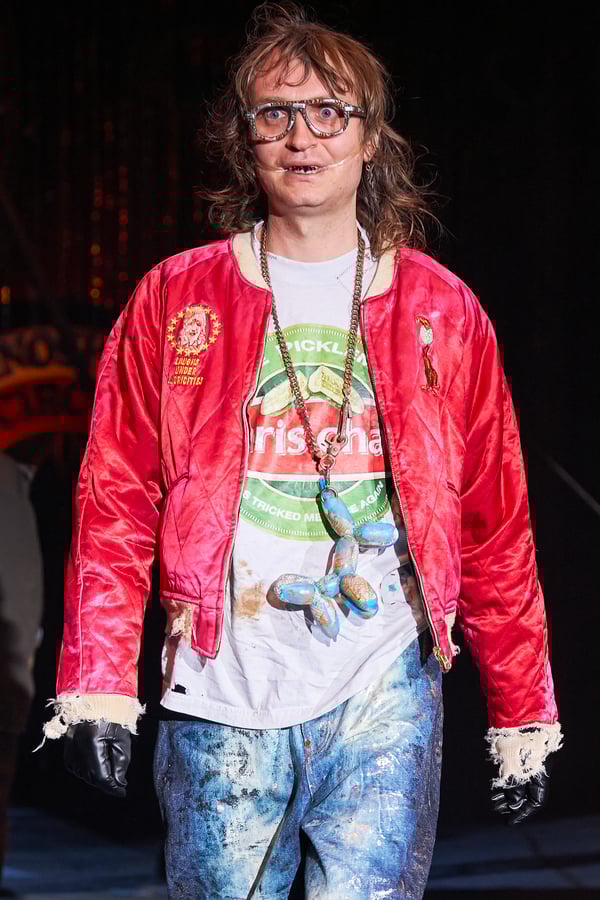 今季のテーマは「MADNESS IS LIKE GRAVITY」。デザイナー川西が20年前ロンドンに渡った際に抱いたファッションの世界への憧れと、それからの20年間に経験したことを融合させ、クリエイションに落とし込んだ。ランウェイでは、ペイントやダメージ加工のデニム、ラメ、フリンジ、ハーレクイン柄など、装飾性が高いルックをピエロを彷彿とさせるヘアメイクと合わせて発表した。