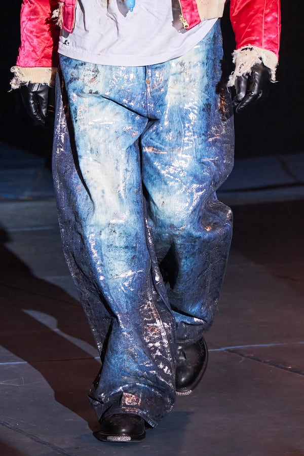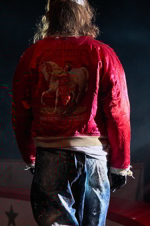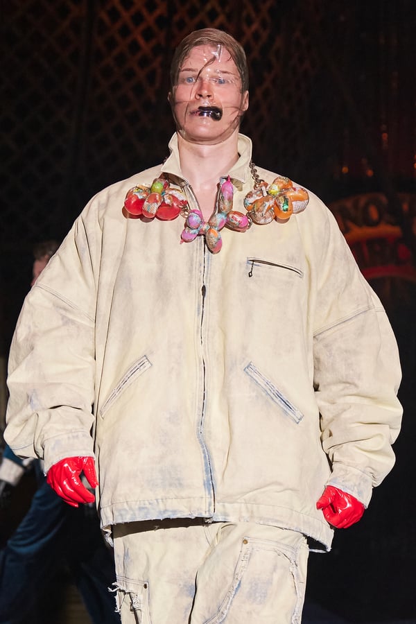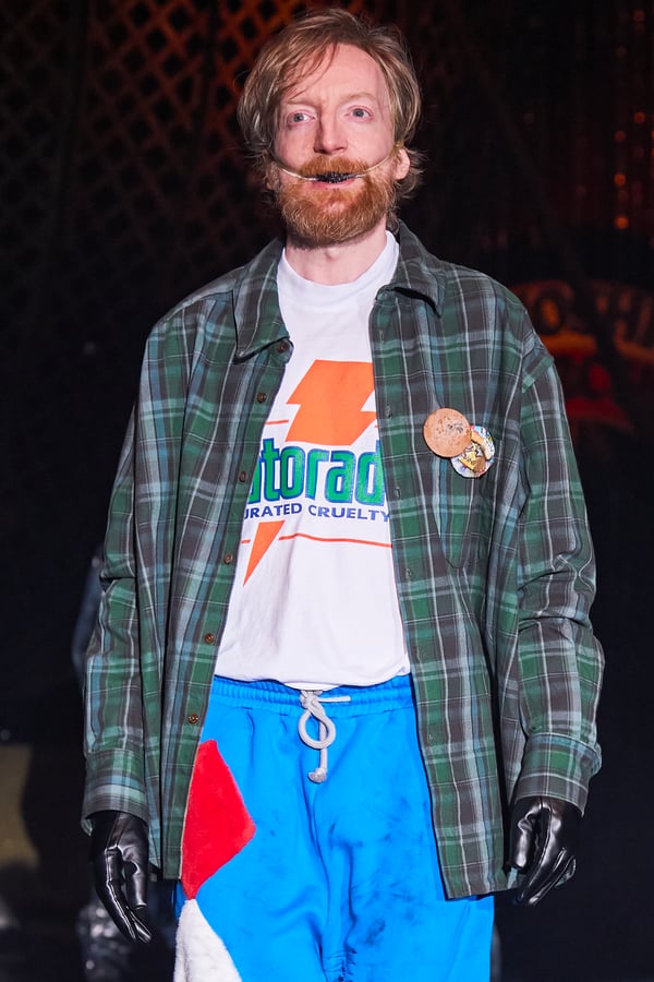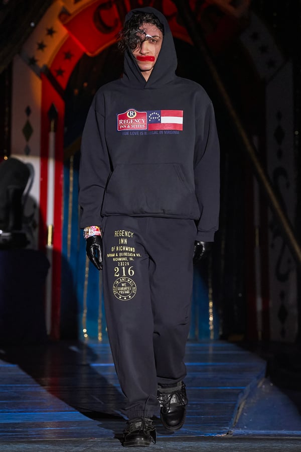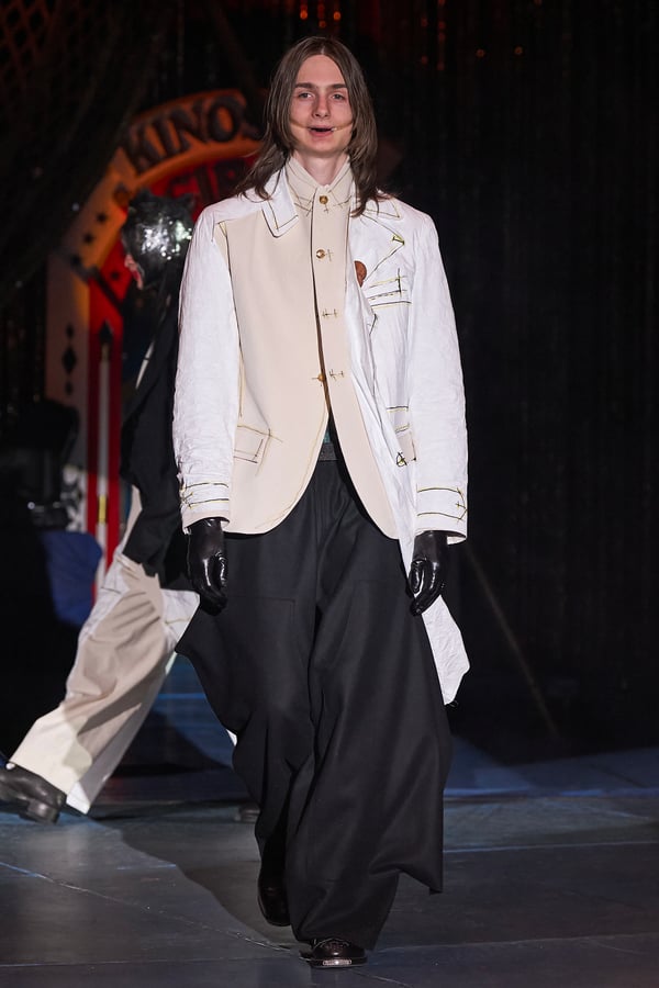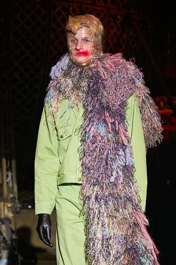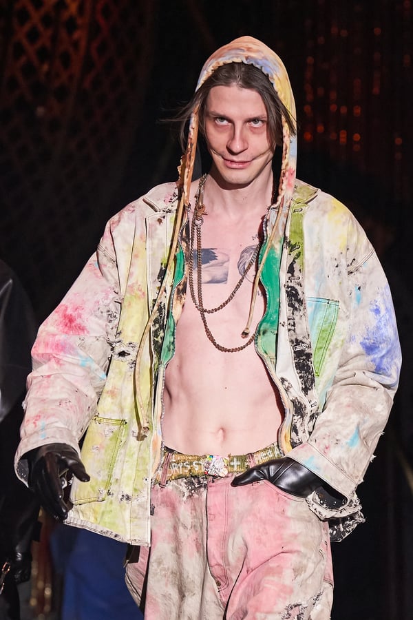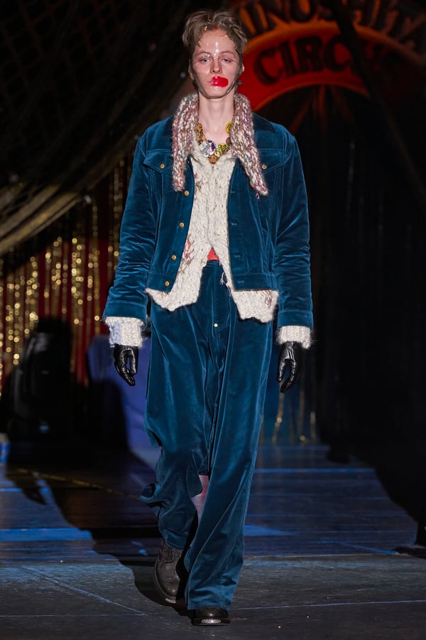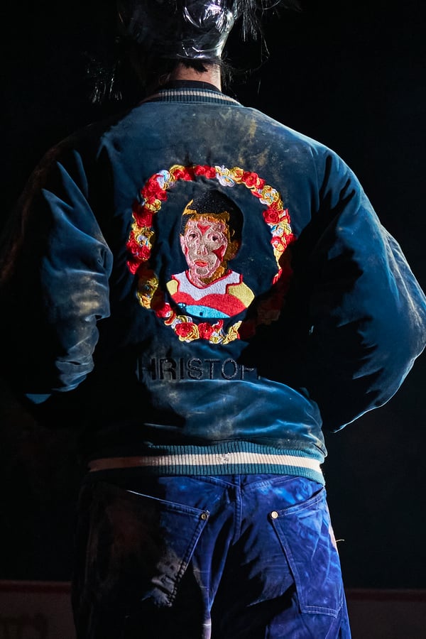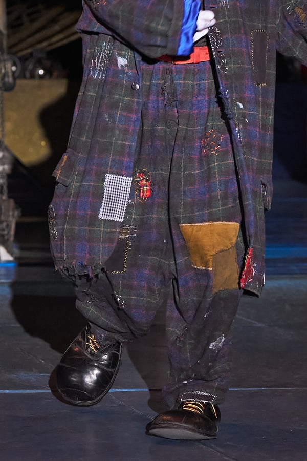 今季のテーマは「MADNESS IS LIKE GRAVITY」。デザイナー川西が20年前ロンドンに渡った際に抱いたファッションの世界への憧れと、それからの20年間に経験したことを融合させ、クリエイションに落とし込んだ。ランウェイでは、ペイントやダメージ加工のデニム、ラメ、フリンジ、ハーレクイン柄など、装飾性が高いルックをピエロを彷彿とさせるヘアメイクと合わせて発表した。
