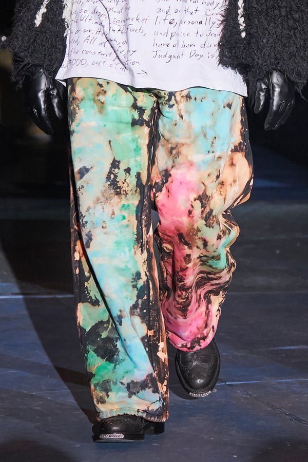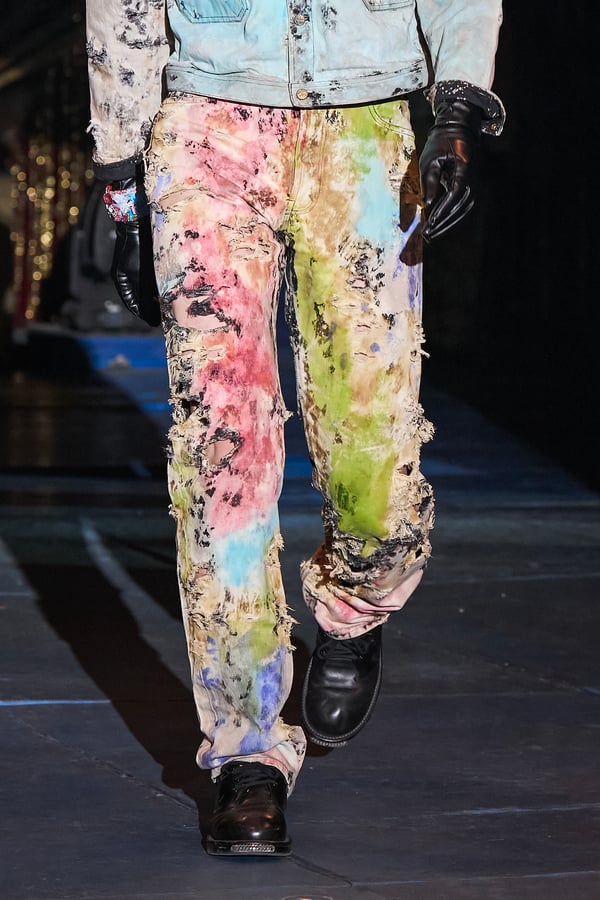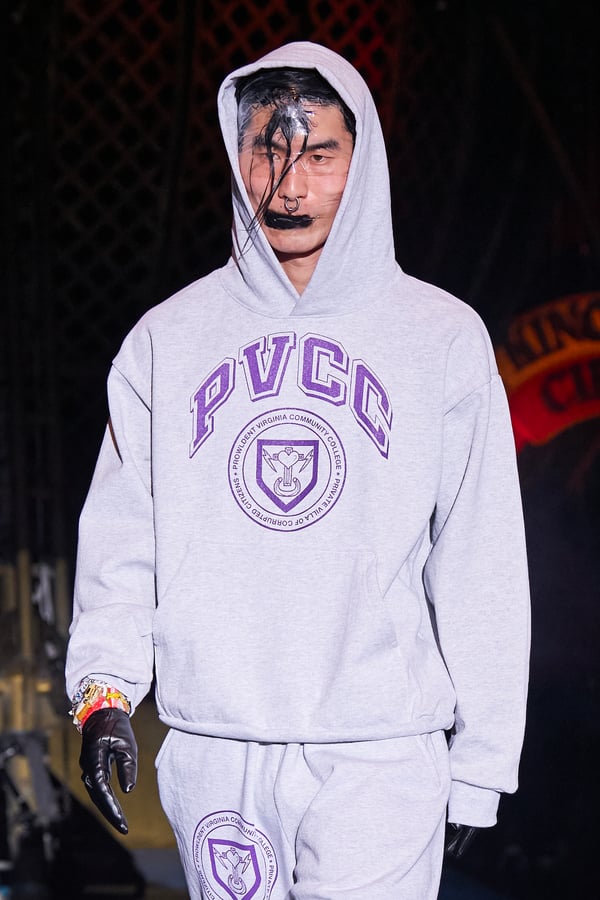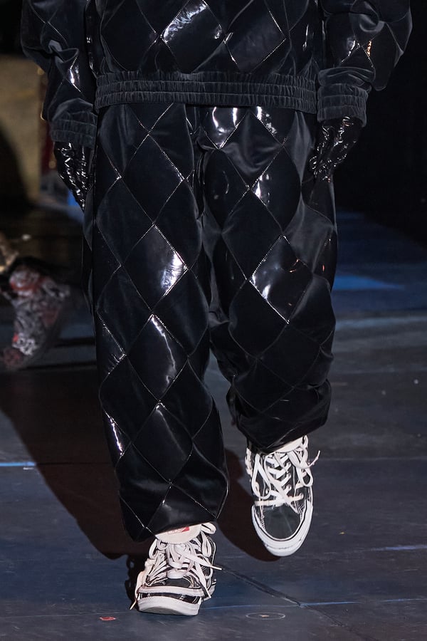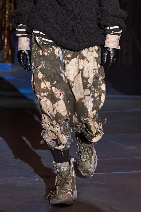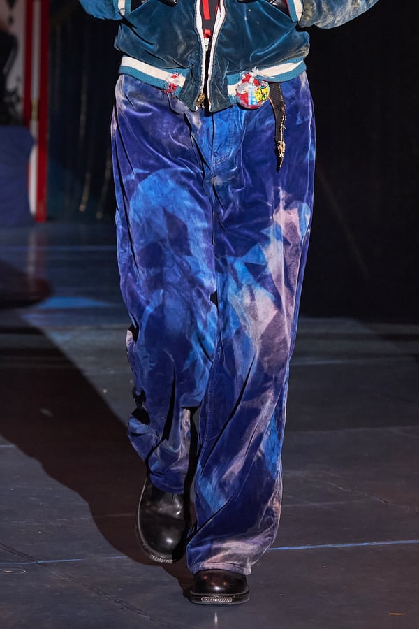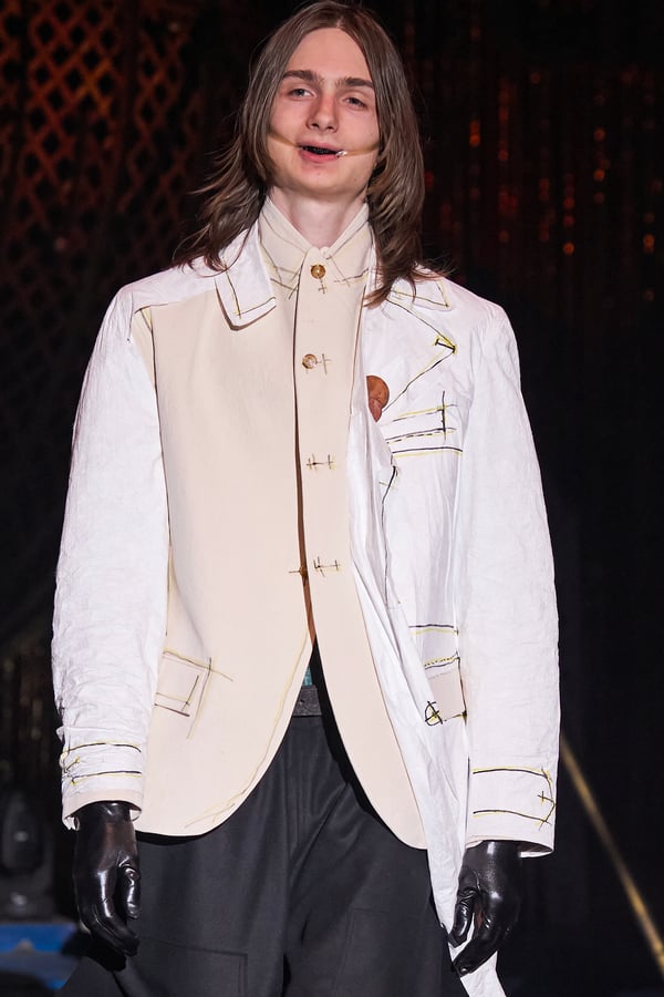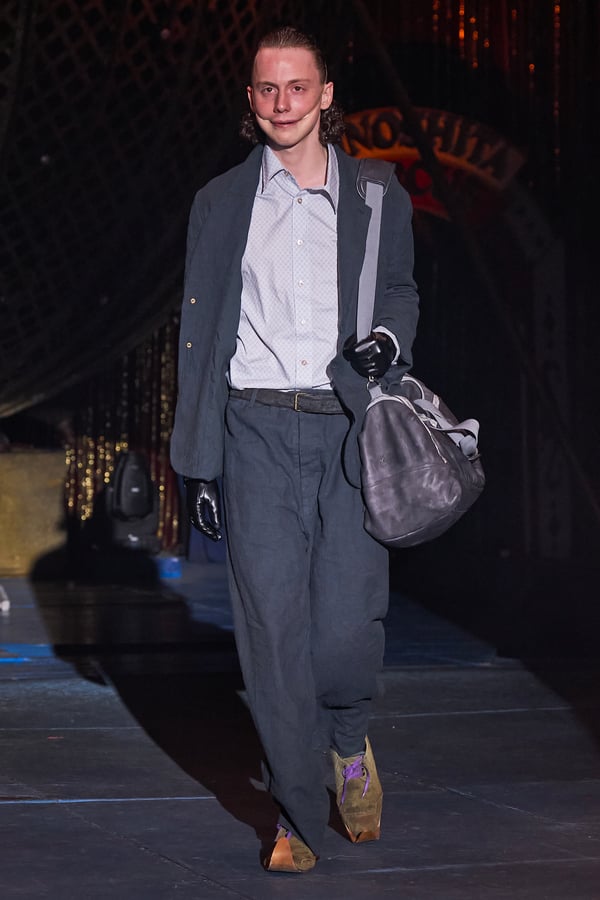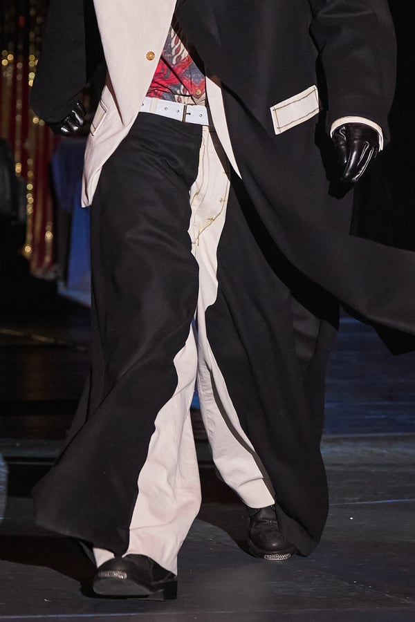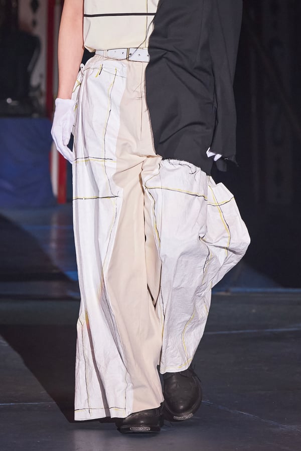 今季のテーマは「MADNESS IS LIKE GRAVITY」。デザイナー川西が20年前ロンドンに渡った際に抱いたファッションの世界への憧れと、それからの20年間に経験したことを融合させ、クリエイションに落とし込んだ。ランウェイでは、ペイントやダメージ加工のデニム、ラメ、フリンジ、ハーレクイン柄など、装飾性が高いルックをピエロを彷彿とさせるヘアメイクと合わせて発表した。