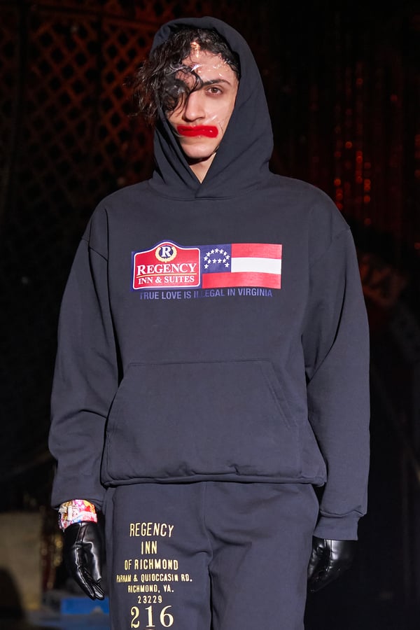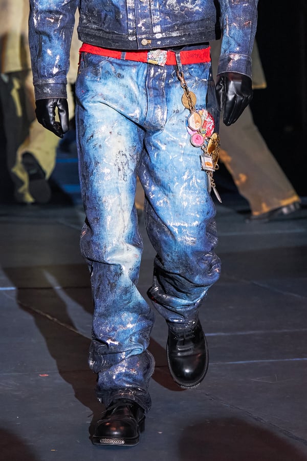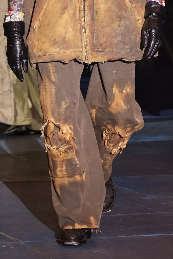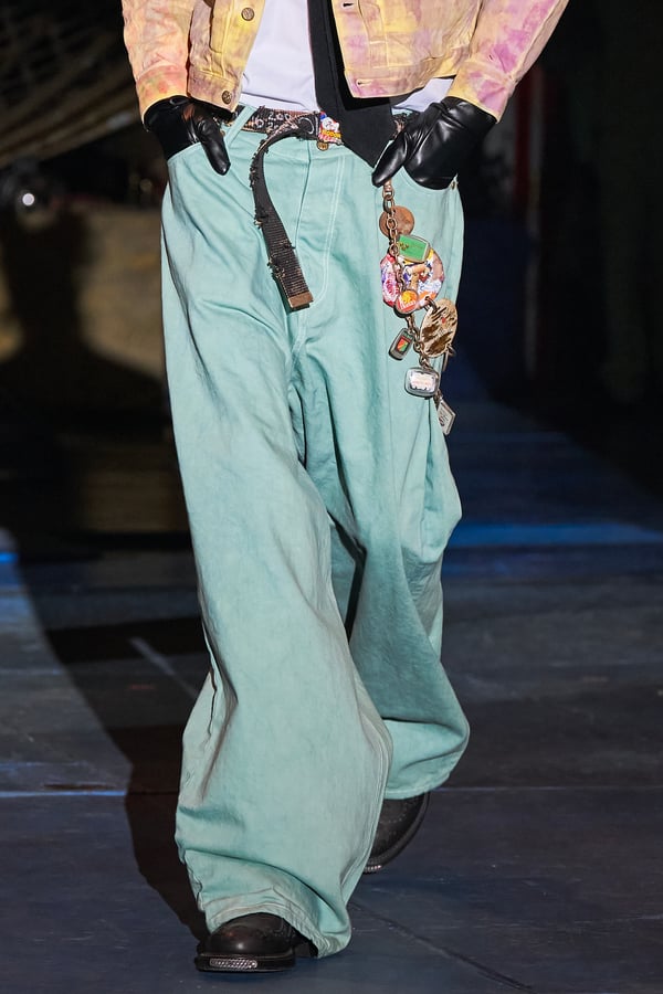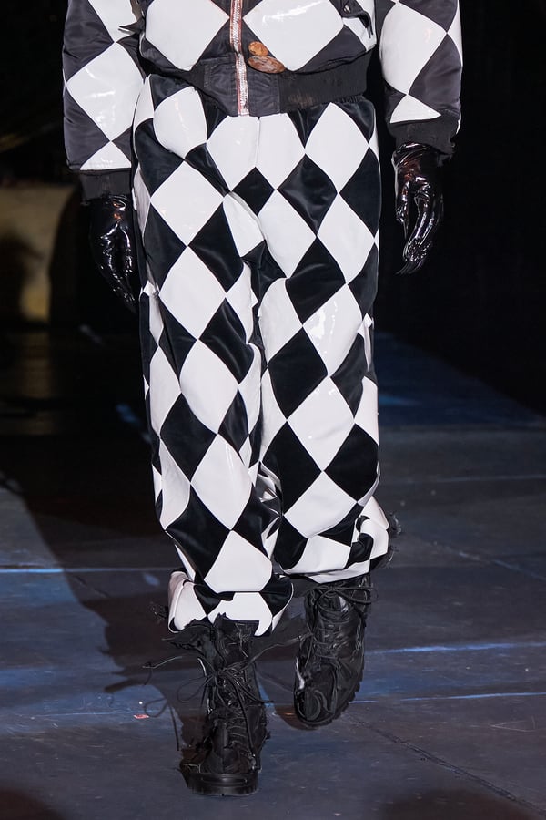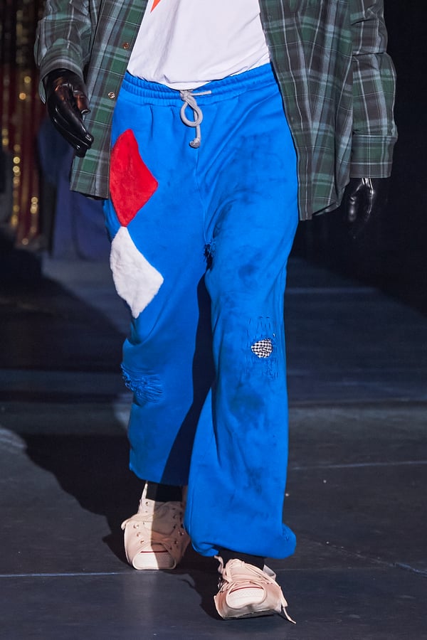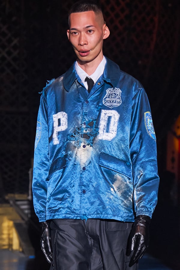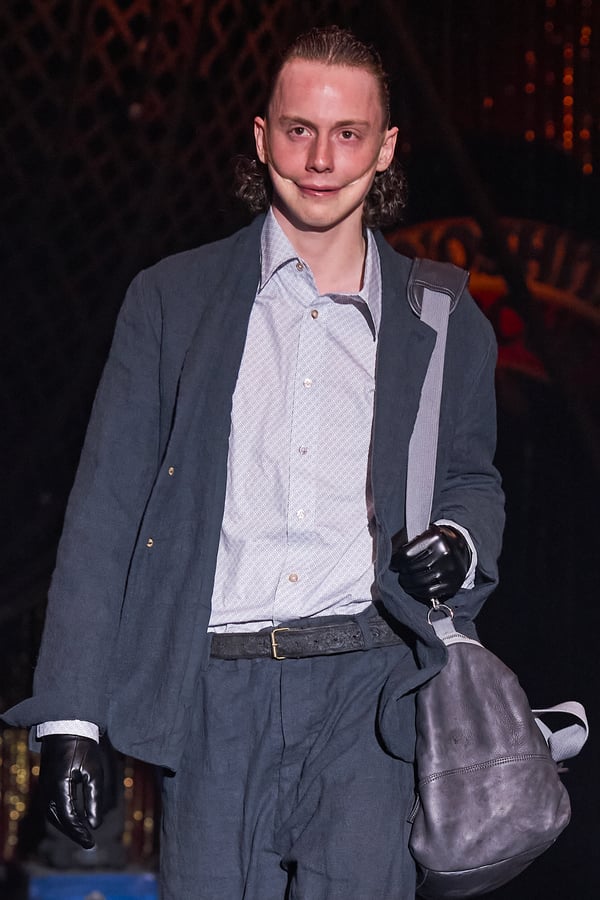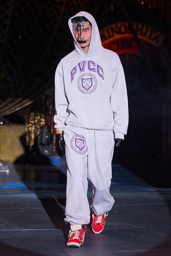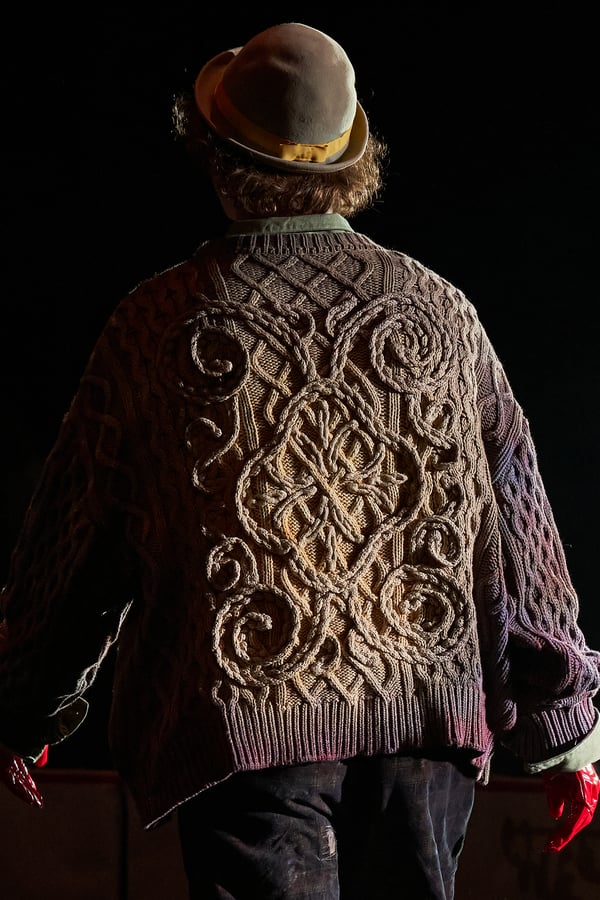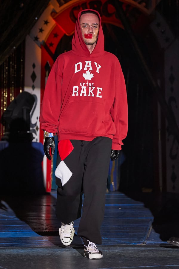 今季のテーマは「MADNESS IS LIKE GRAVITY」。デザイナー川西が20年前ロンドンに渡った際に抱いたファッションの世界への憧れと、それからの20年間に経験したことを融合させ、クリエイションに落とし込んだ。ランウェイでは、ペイントやダメージ加工のデニム、ラメ、フリンジ、ハーレクイン柄など、装飾性が高いルックをピエロを彷彿とさせるヘアメイクと合わせて発表した。
