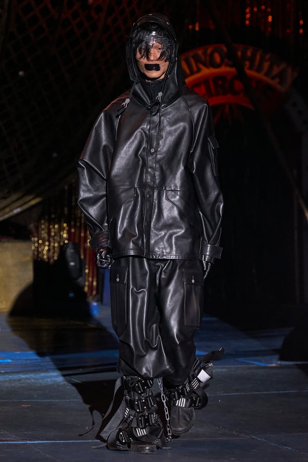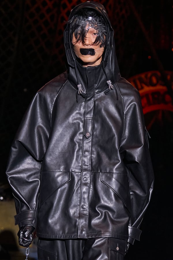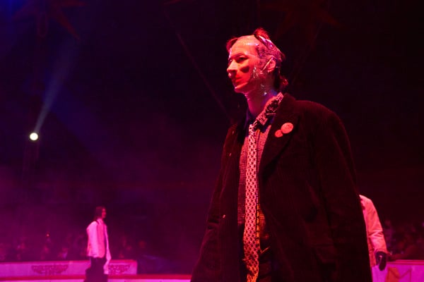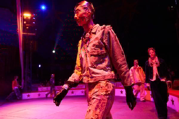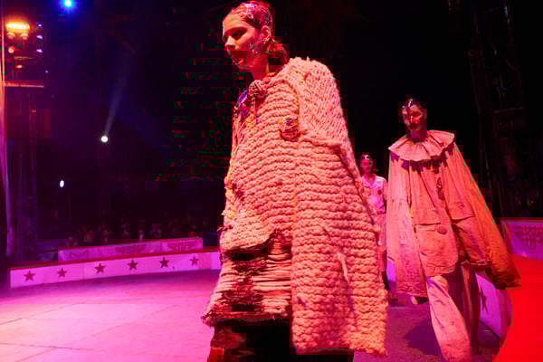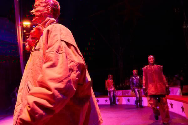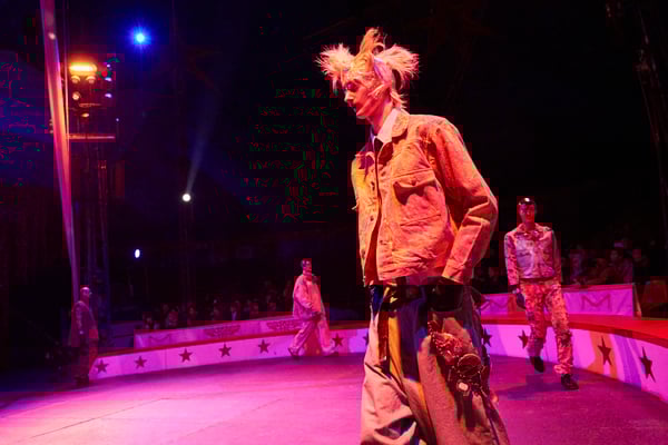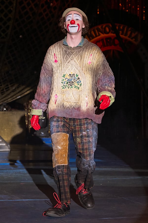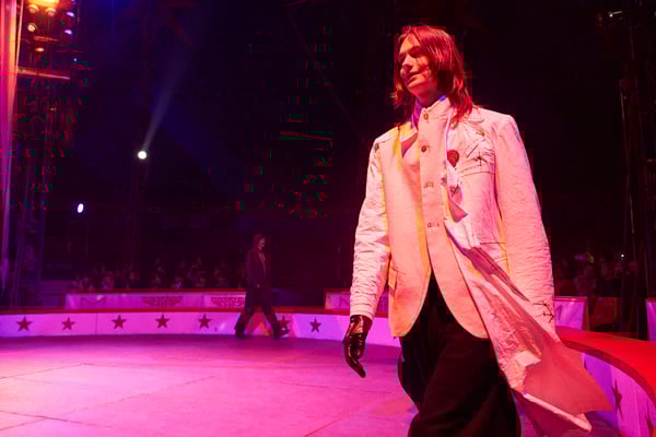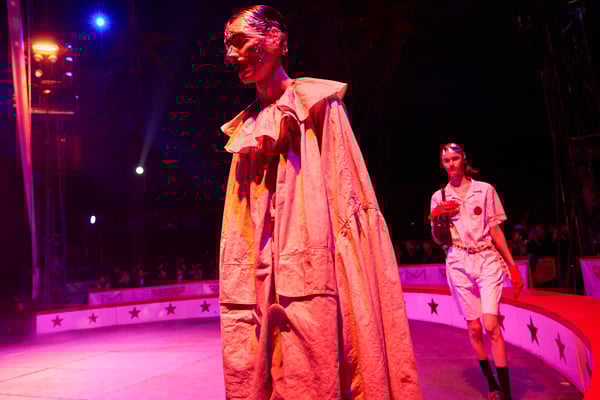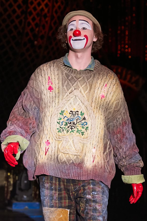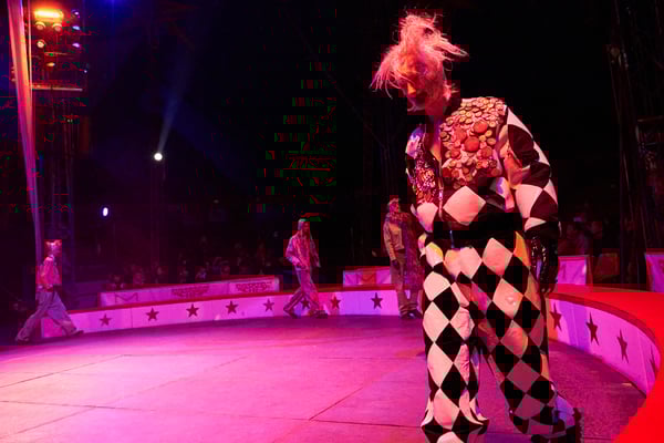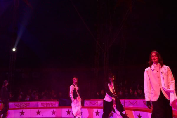 ショーは、2人のピエロによる「It's show time!!」という掛け声からスタート。大きな鉄格子の球体の中をバイクが猛スピードで走り回る曲芸「グローブ・オブ・デス」のパフォーマンスのあと、新作をまとったモデルが登場し、会場内を歩いた。