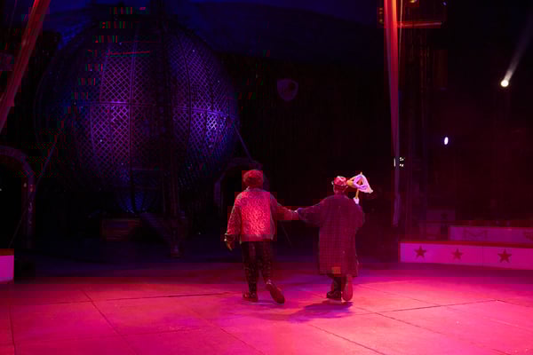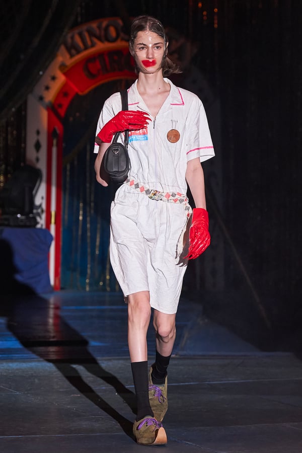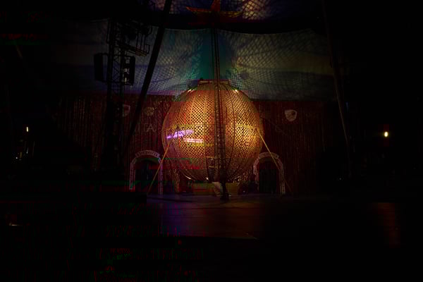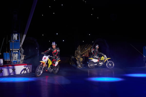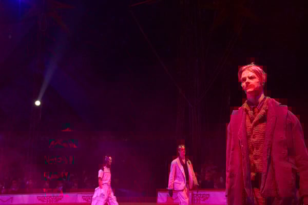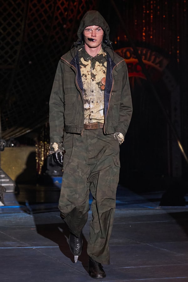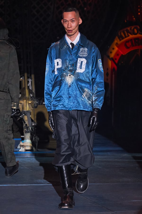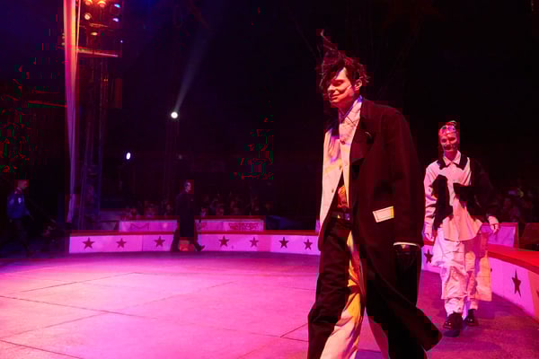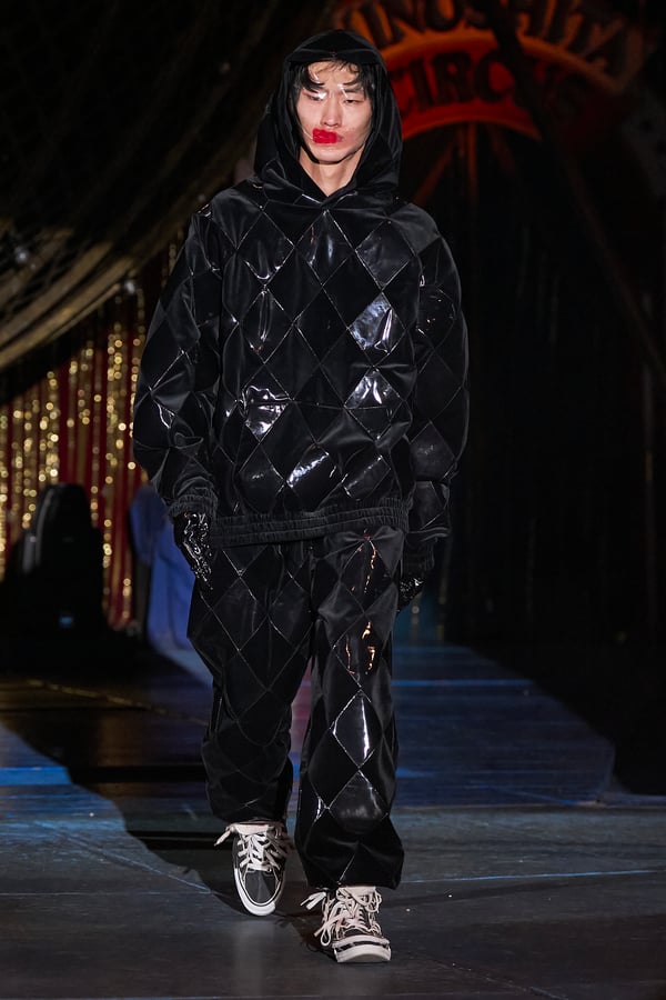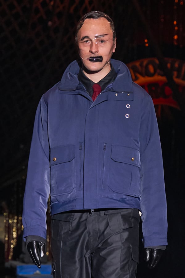 ショーは、2人のピエロによる「It's show time!!」という掛け声からスタート。大きな鉄格子の球体の中をバイクが猛スピードで走り回る曲芸「グローブ・オブ・デス」のパフォーマンスのあと、新作をまとったモデルが登場し、会場内を歩いた。
