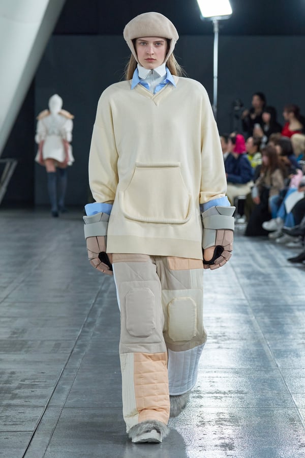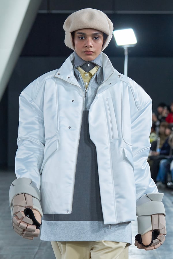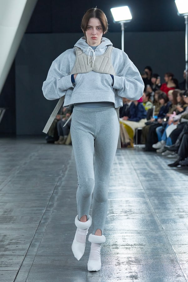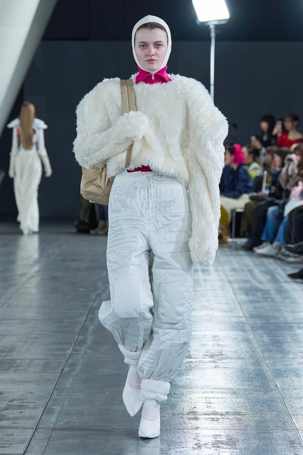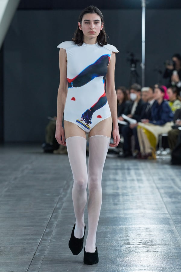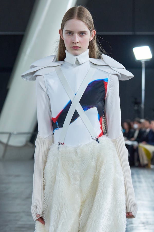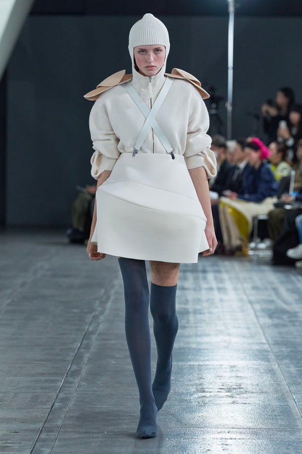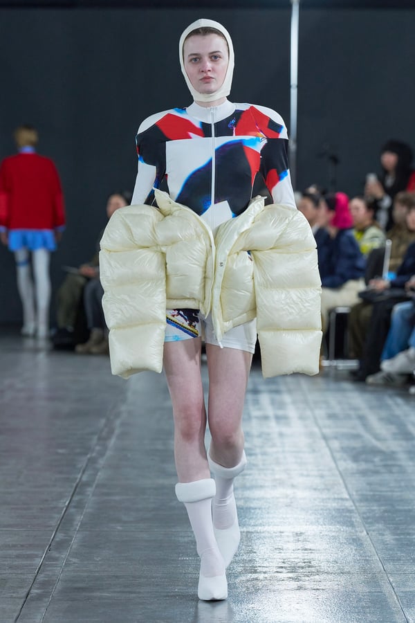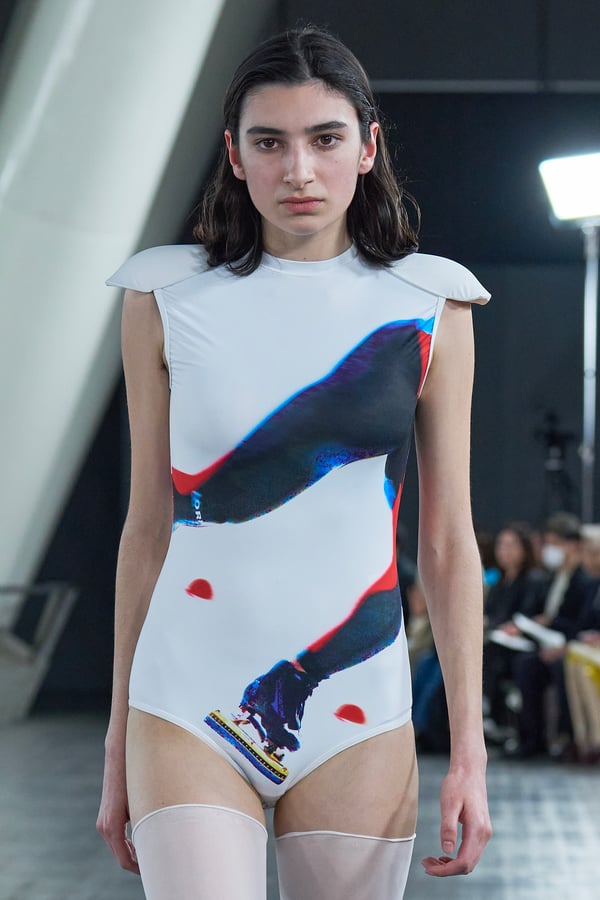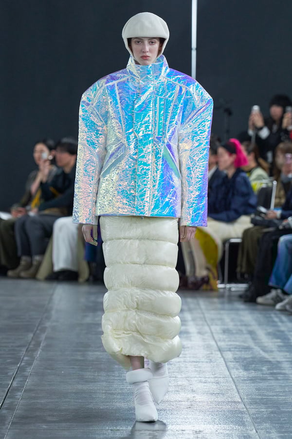 肩パッドやニープロテクターを構築的なフォルムのディテールとして取り入れ、競技用のレーシングスーツのようにフィットするボディスーツなどが登場。直線的なボリュームを備えたスカートは氷山をイメージし、オーロラを彷彿とさせるホログラフィックなジャケットなどに氷原の情景を落とし込んだ。躍動感のあるグラフィックアイテムは、スピードスケート選手の滑走の様子を捉えた写真を再構築した。