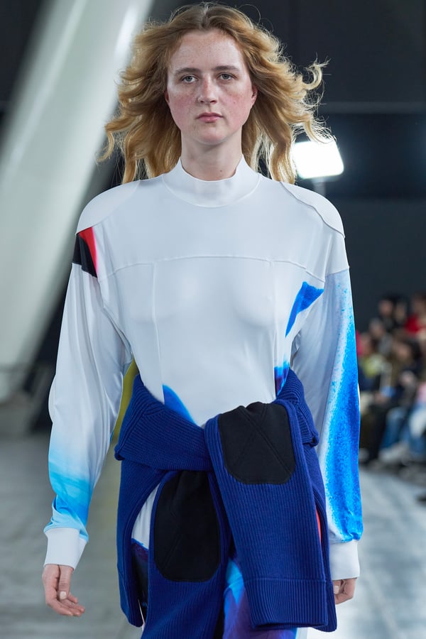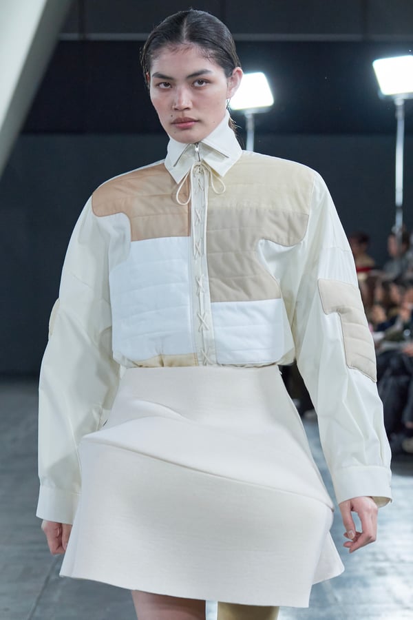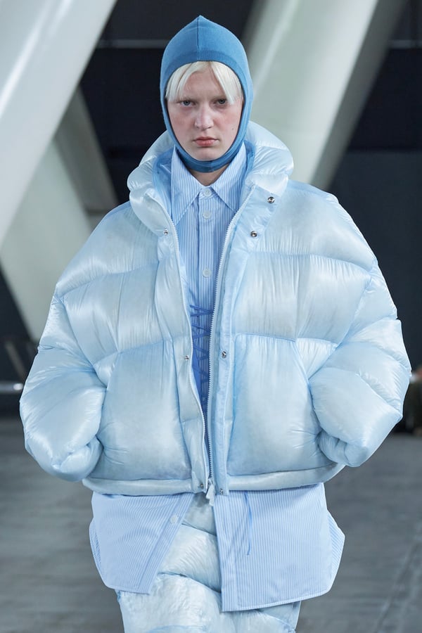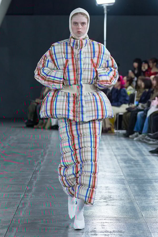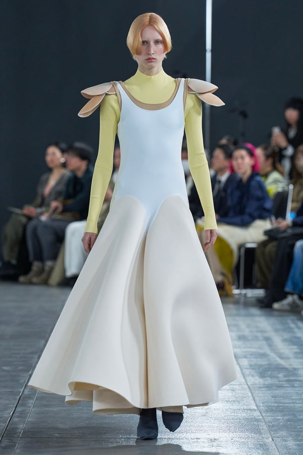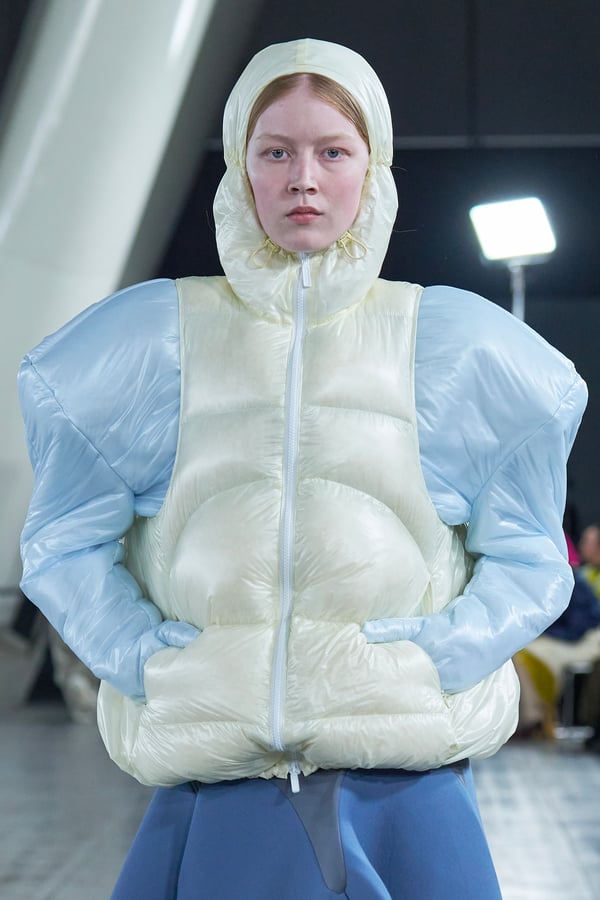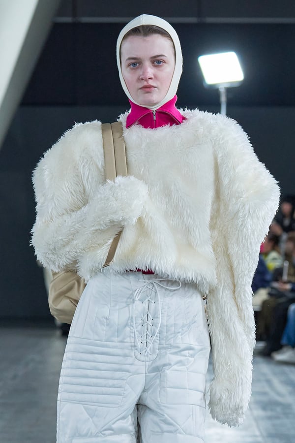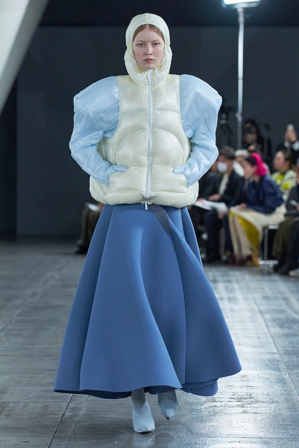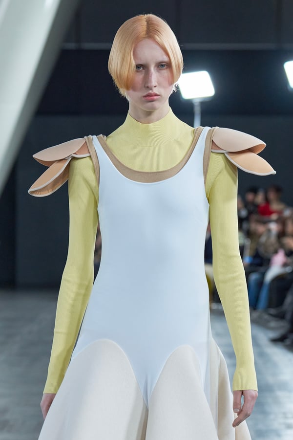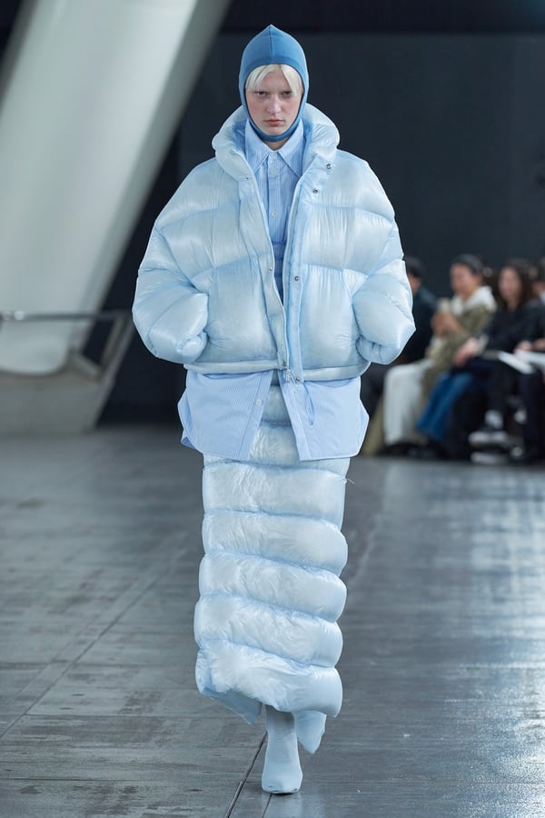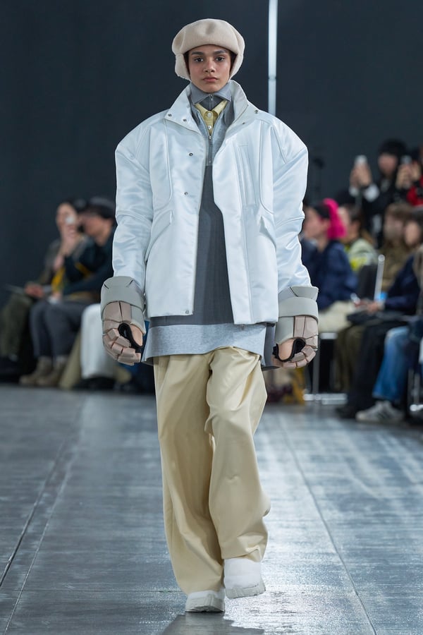肩パッドやニープロテクターを構築的なフォルムのディテールとして取り入れ、競技用のレーシングスーツのようにフィットするボディスーツなどが登場。直線的なボリュームを備えたスカートは氷山をイメージし、オーロラを彷彿とさせるホログラフィックなジャケットなどに氷原の情景を落とし込んだ。躍動感のあるグラフィックアイテムは、スピードスケート選手の滑走の様子を捉えた写真を再構築した。