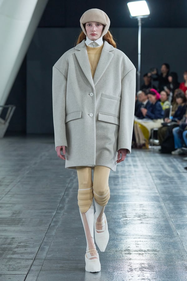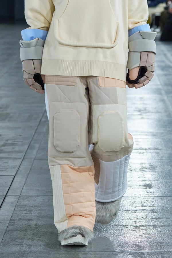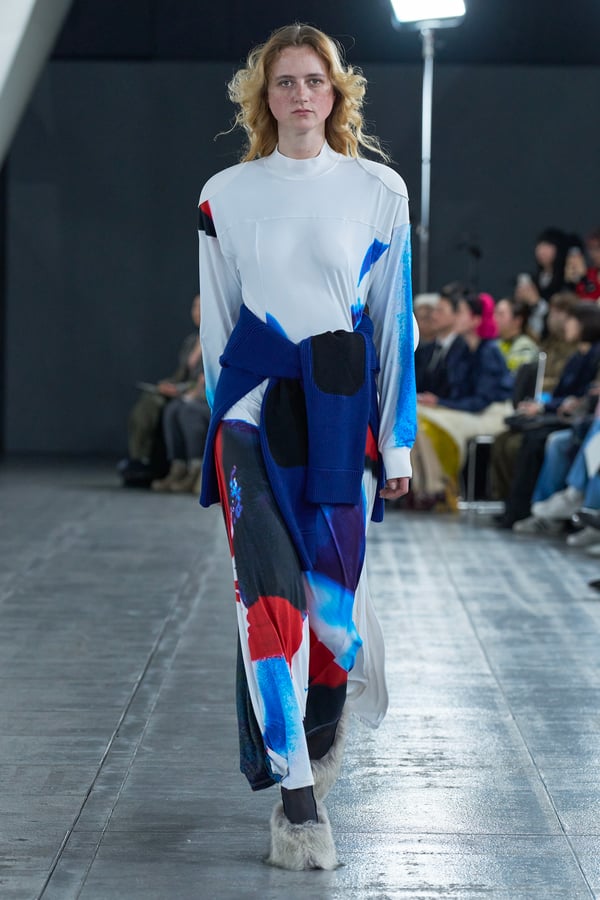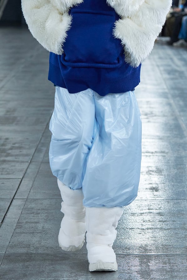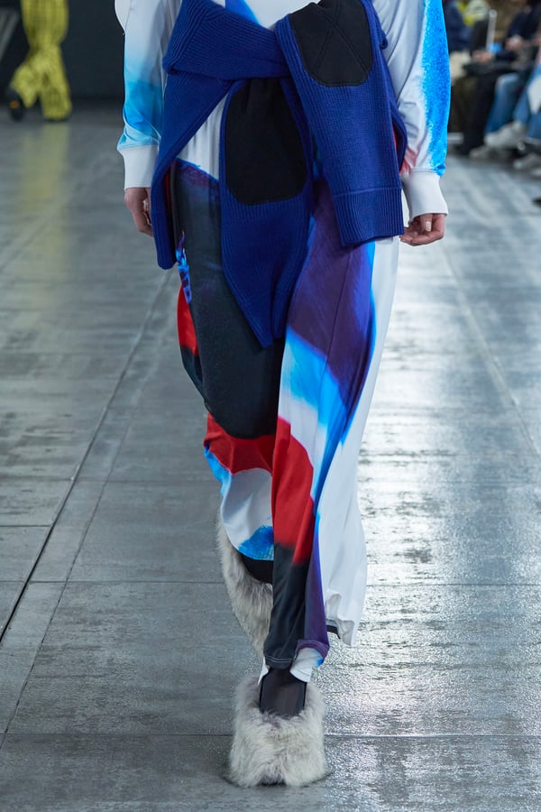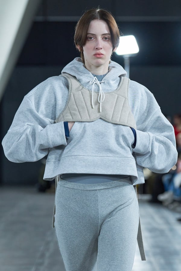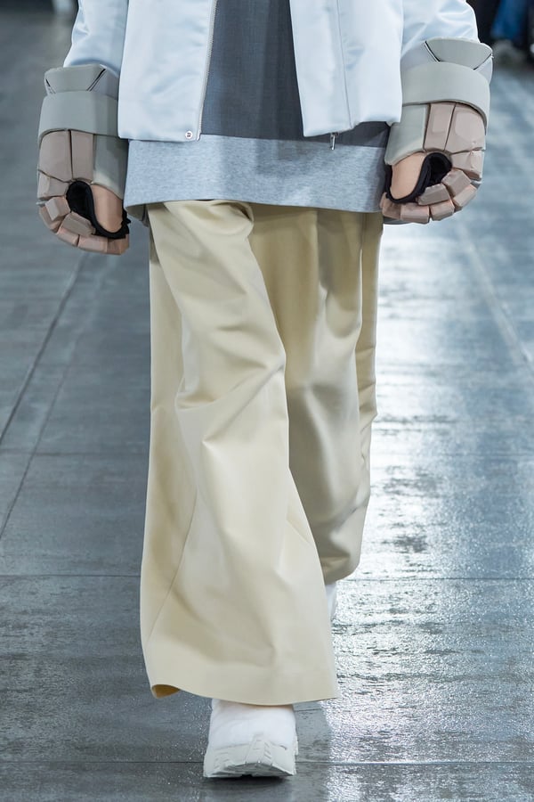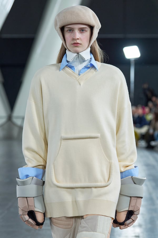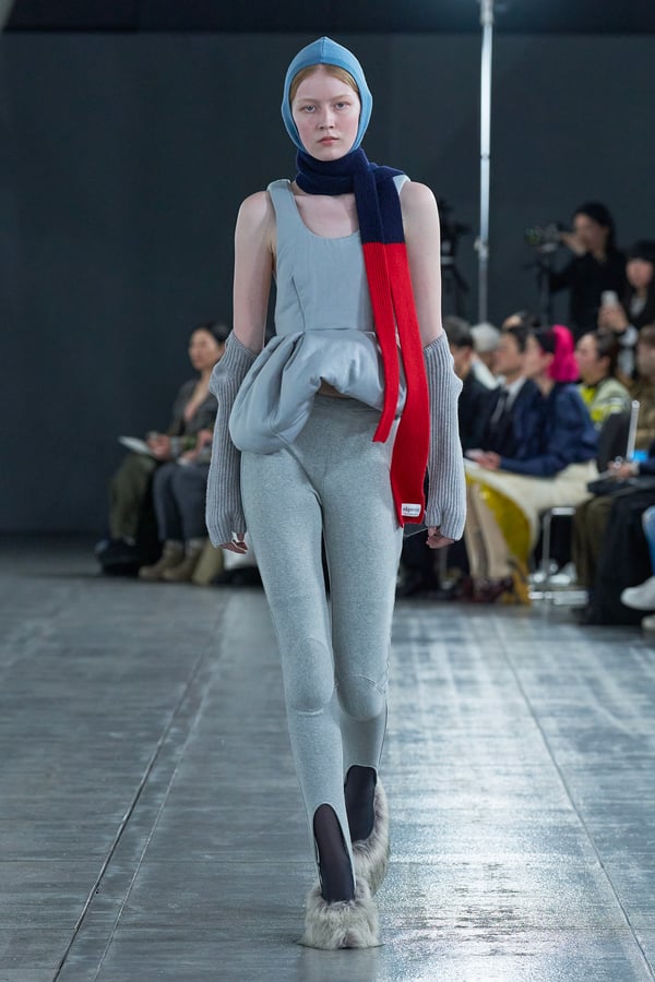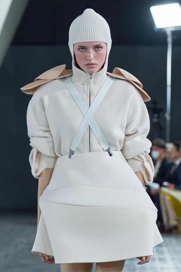 肩パッドやニープロテクターを構築的なフォルムのディテールとして取り入れ、競技用のレーシングスーツのようにフィットするボディスーツなどが登場。直線的なボリュームを備えたスカートは氷山をイメージし、オーロラを彷彿とさせるホログラフィックなジャケットなどに氷原の情景を落とし込んだ。躍動感のあるグラフィックアイテムは、スピードスケート選手の滑走の様子を捉えた写真を再構築した。