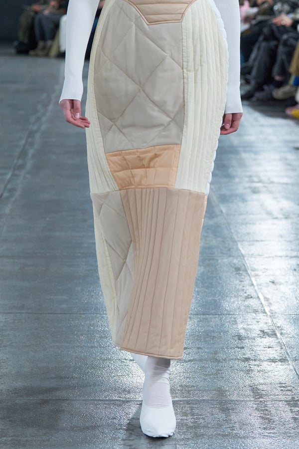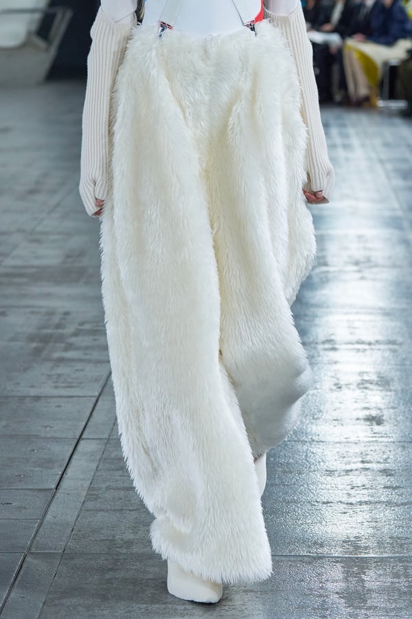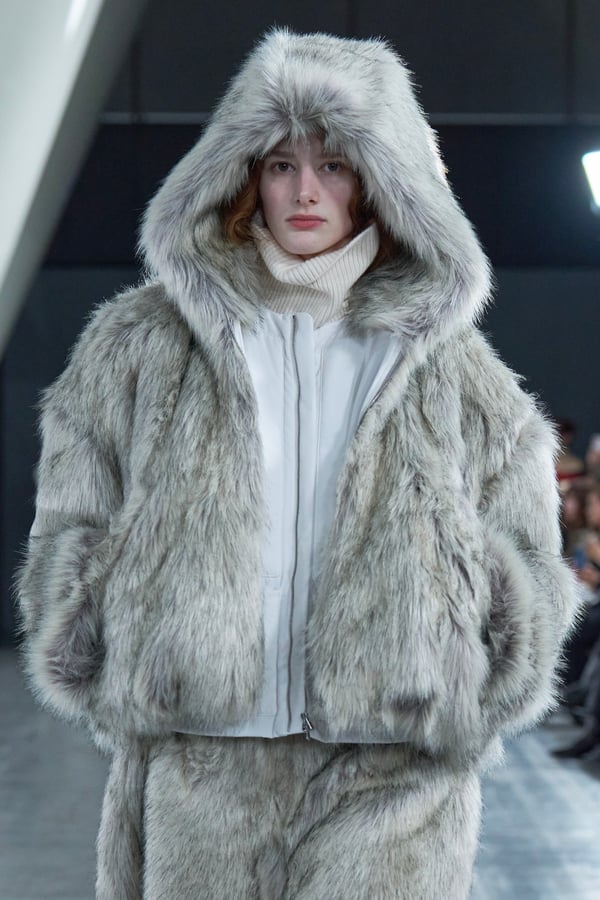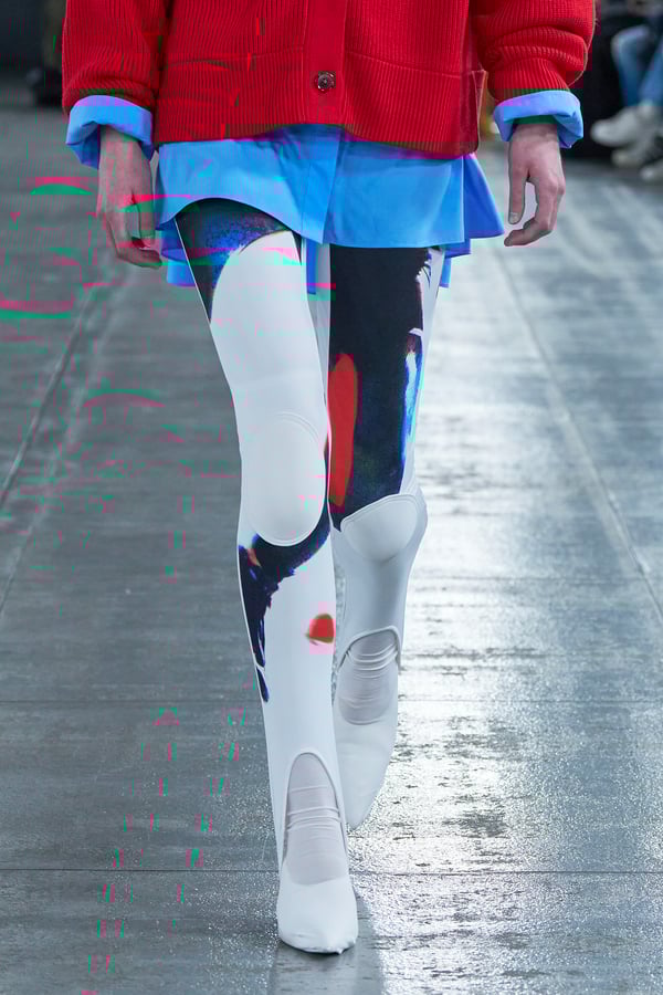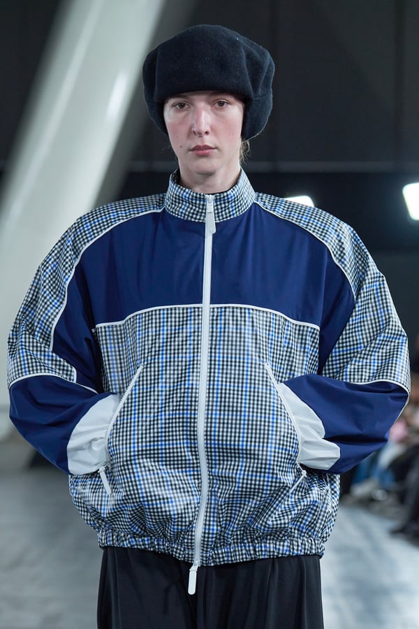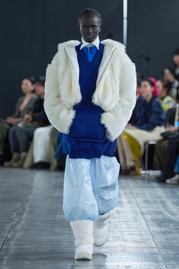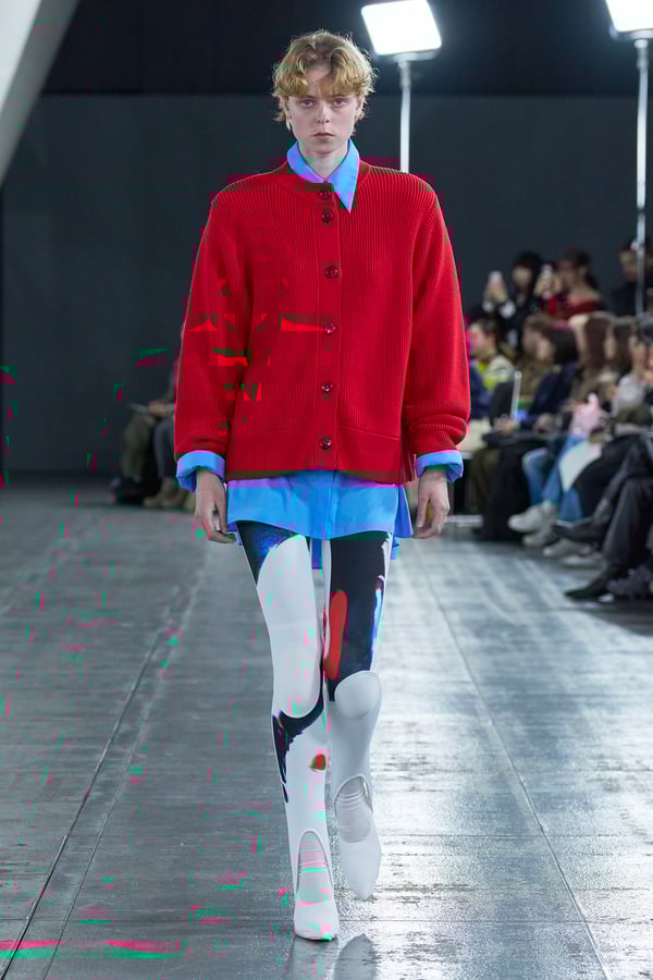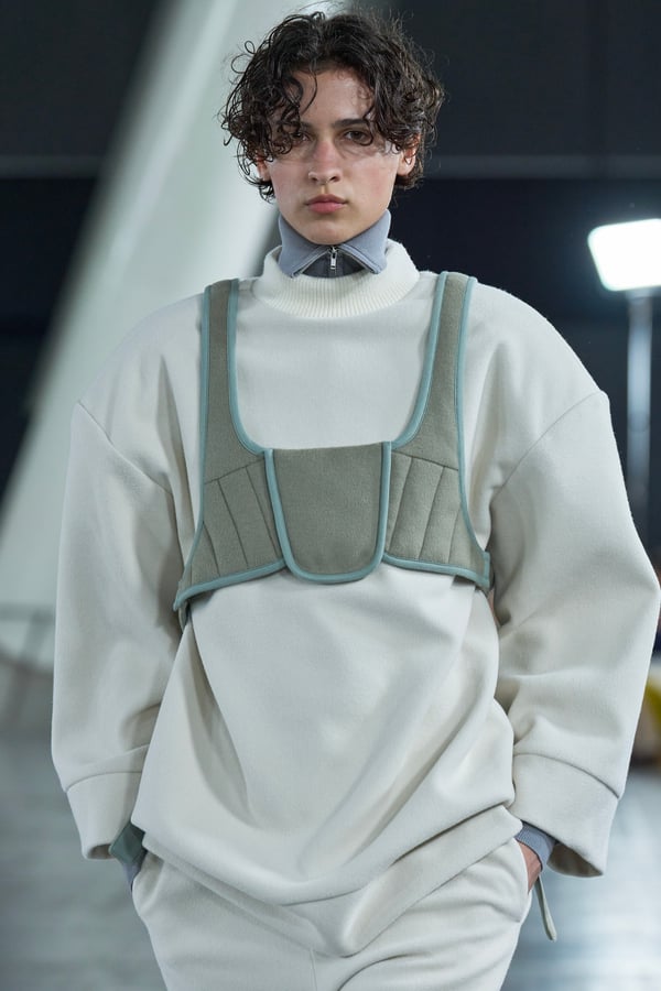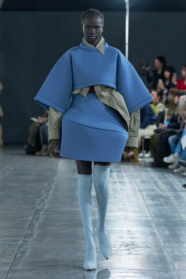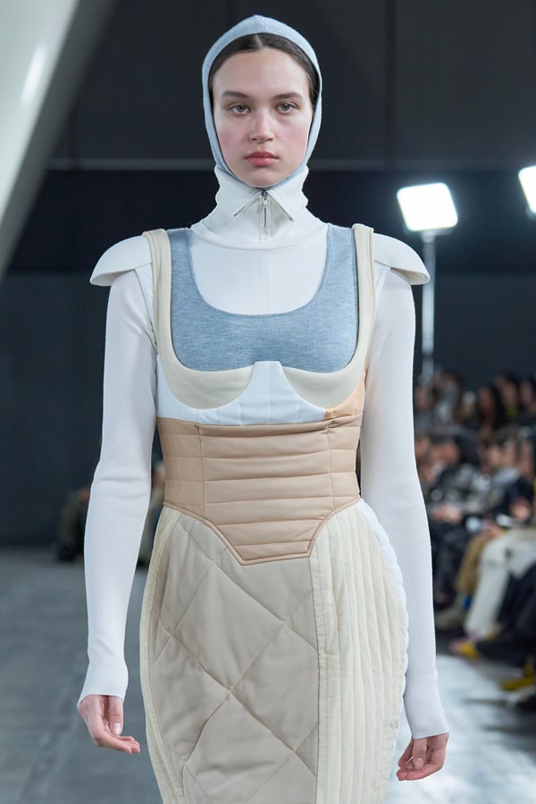 肩パッドやニープロテクターを構築的なフォルムのディテールとして取り入れ、競技用のレーシングスーツのようにフィットするボディスーツなどが登場。直線的なボリュームを備えたスカートは氷山をイメージし、オーロラを彷彿とさせるホログラフィックなジャケットなどに氷原の情景を落とし込んだ。躍動感のあるグラフィックアイテムは、スピードスケート選手の滑走の様子を捉えた写真を再構築した。