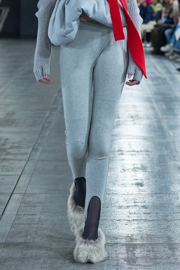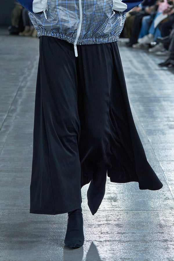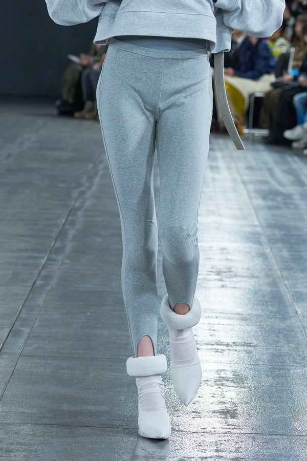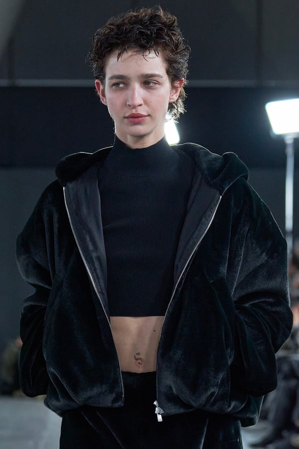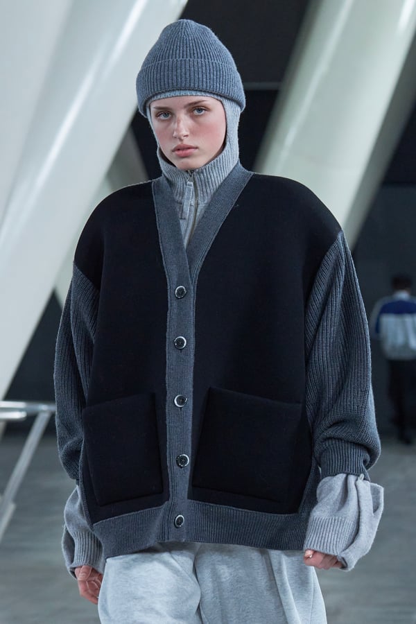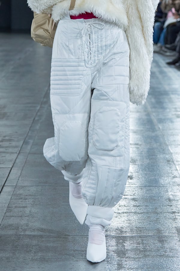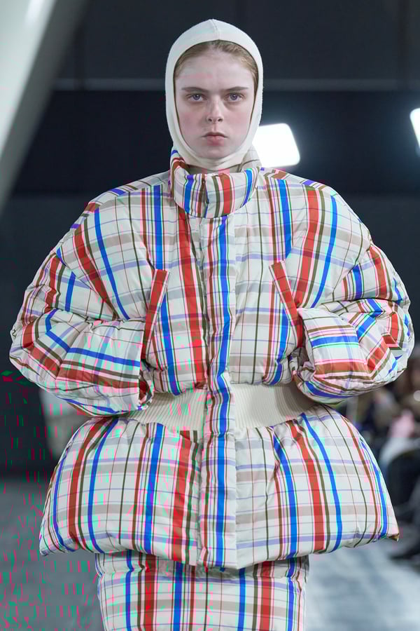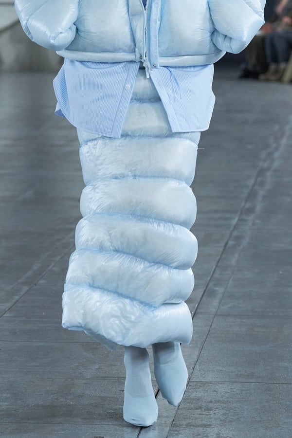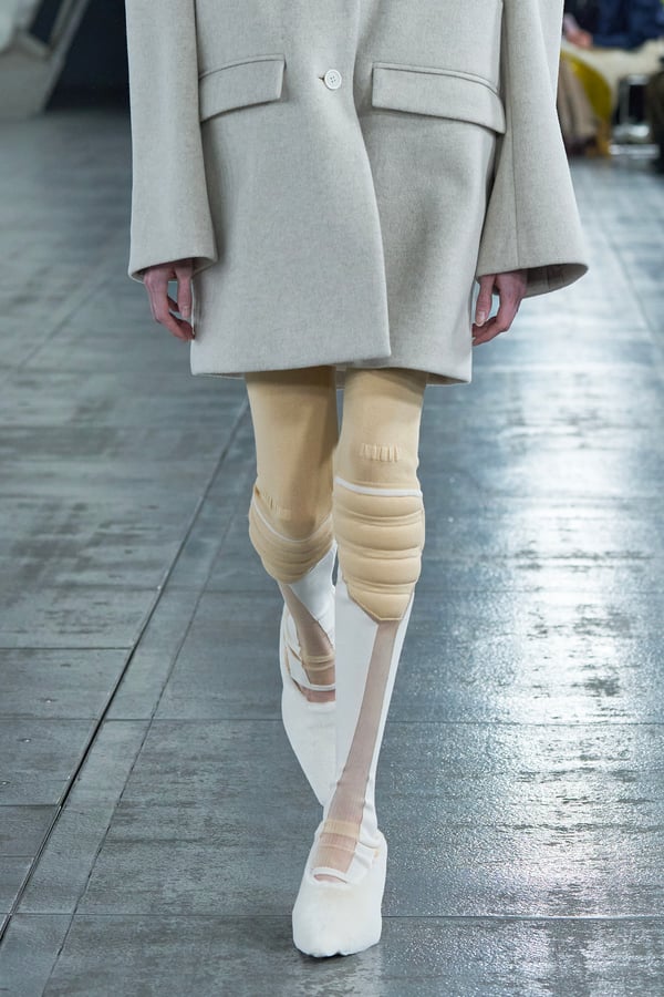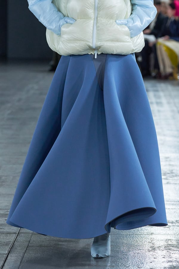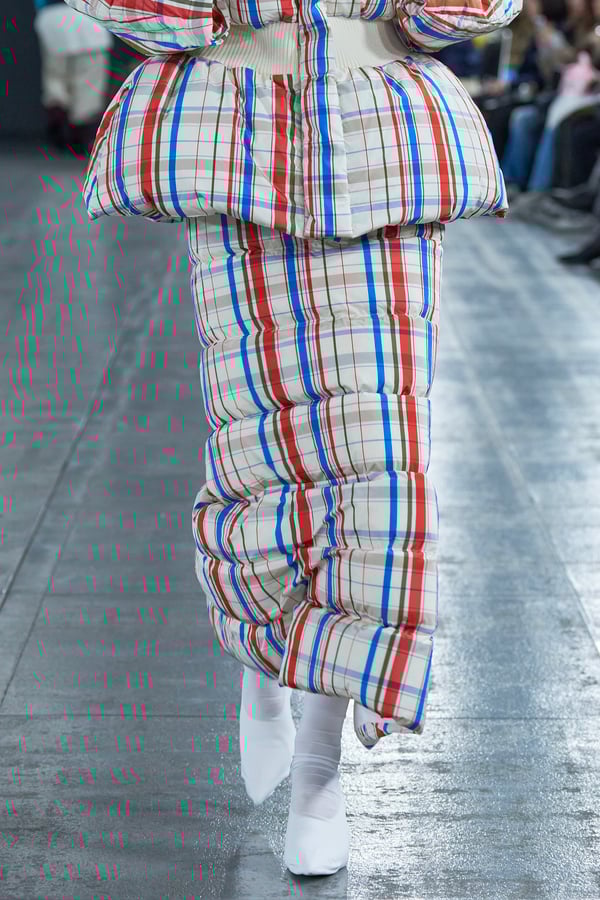 肩パッドやニープロテクターを構築的なフォルムのディテールとして取り入れ、競技用のレーシングスーツのようにフィットするボディスーツなどが登場。直線的なボリュームを備えたスカートは氷山をイメージし、オーロラを彷彿とさせるホログラフィックなジャケットなどに氷原の情景を落とし込んだ。躍動感のあるグラフィックアイテムは、スピードスケート選手の滑走の様子を捉えた写真を再構築した。