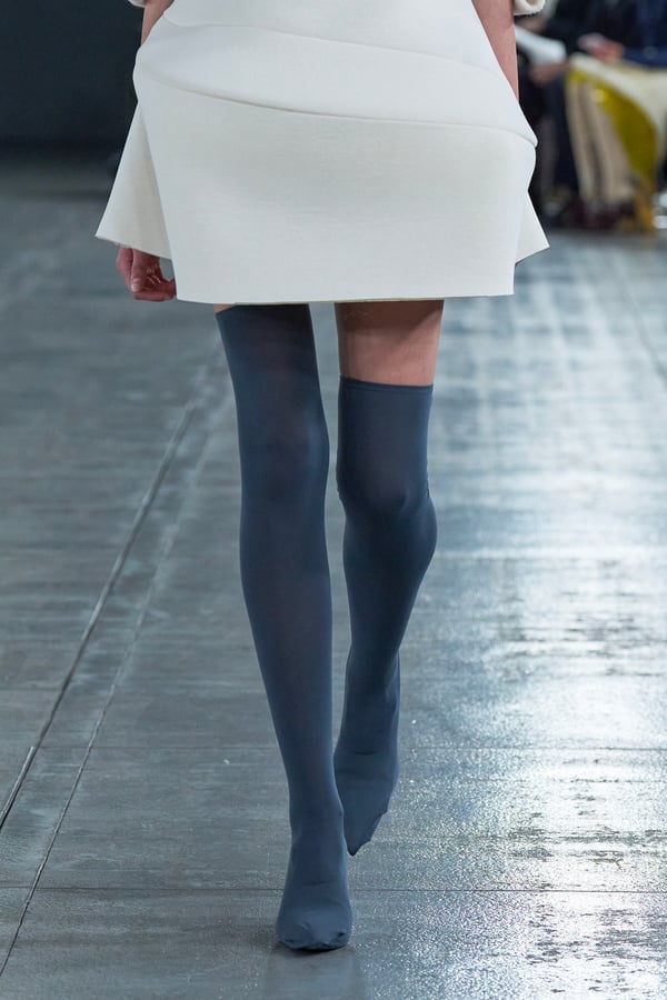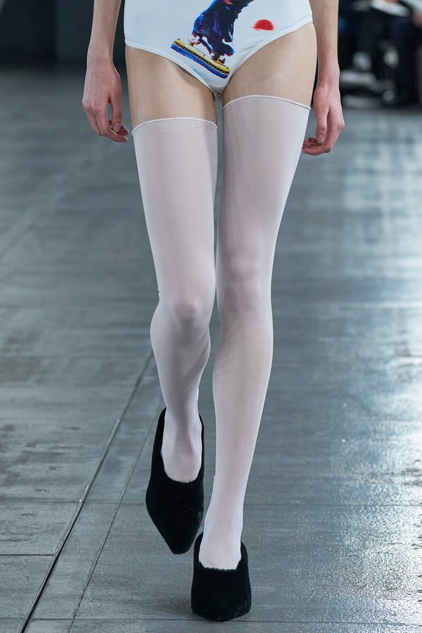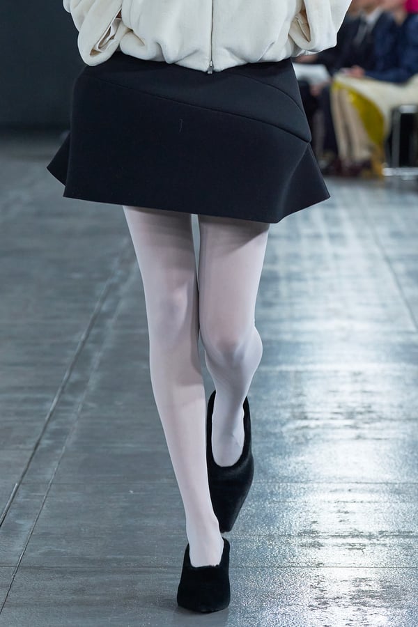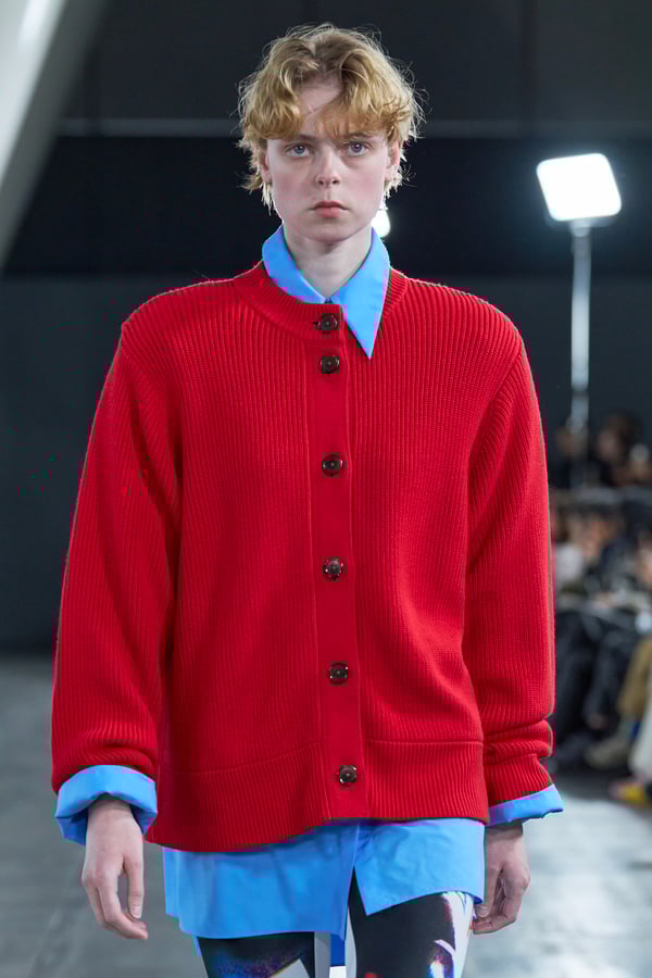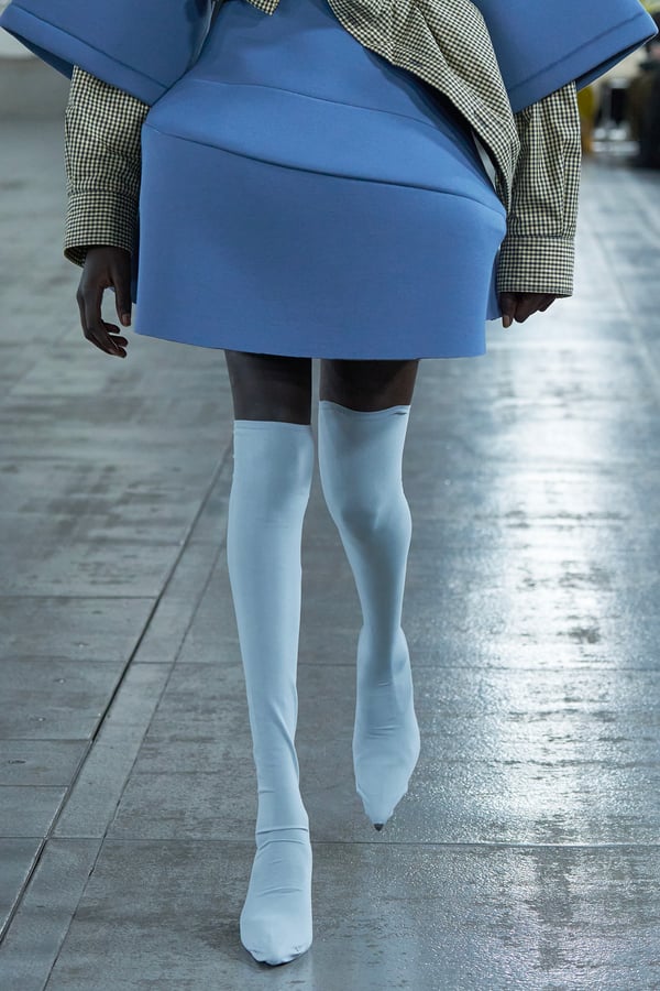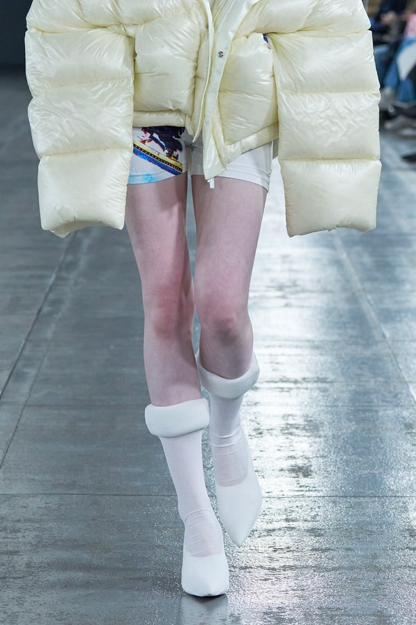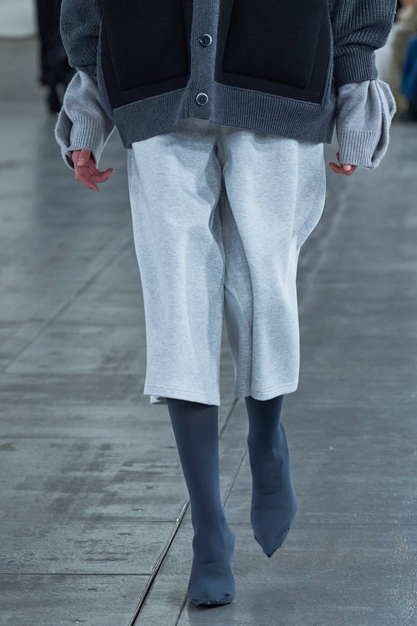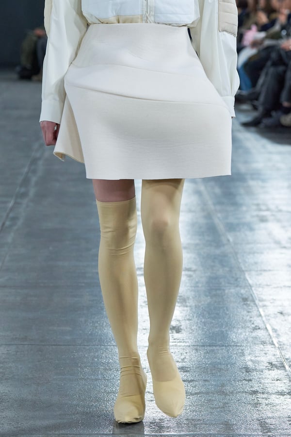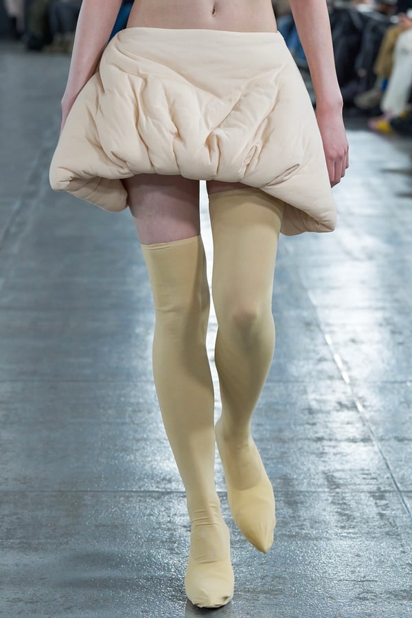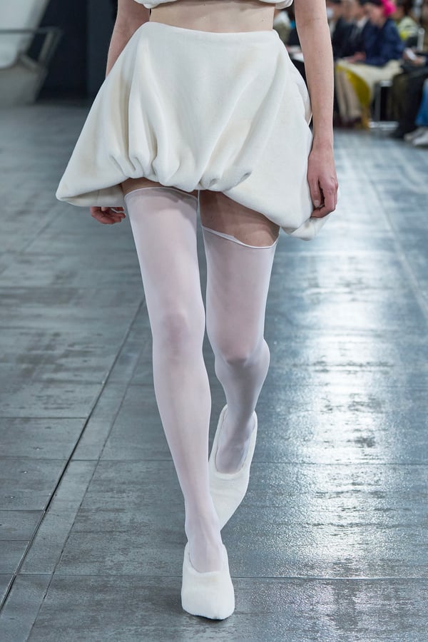 肩パッドやニープロテクターを構築的なフォルムのディテールとして取り入れ、競技用のレーシングスーツのようにフィットするボディスーツなどが登場。直線的なボリュームを備えたスカートは氷山をイメージし、オーロラを彷彿とさせるホログラフィックなジャケットなどに氷原の情景を落とし込んだ。躍動感のあるグラフィックアイテムは、スピードスケート選手の滑走の様子を捉えた写真を再構築した。
