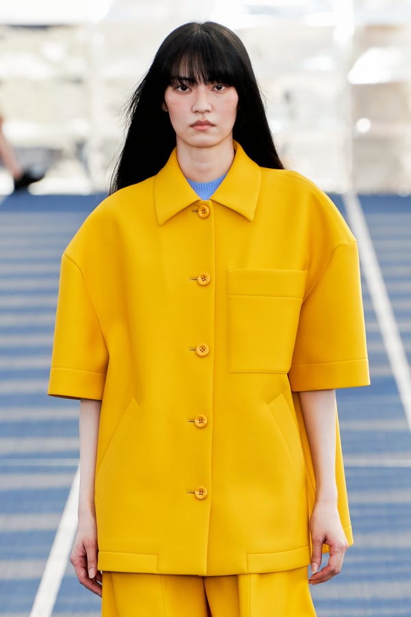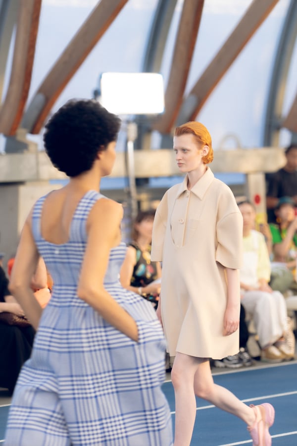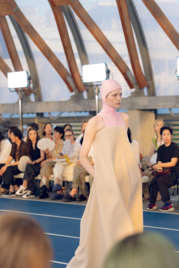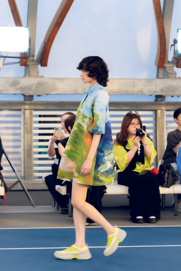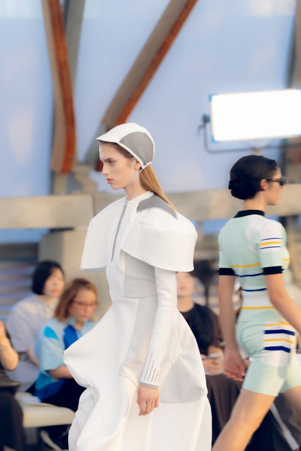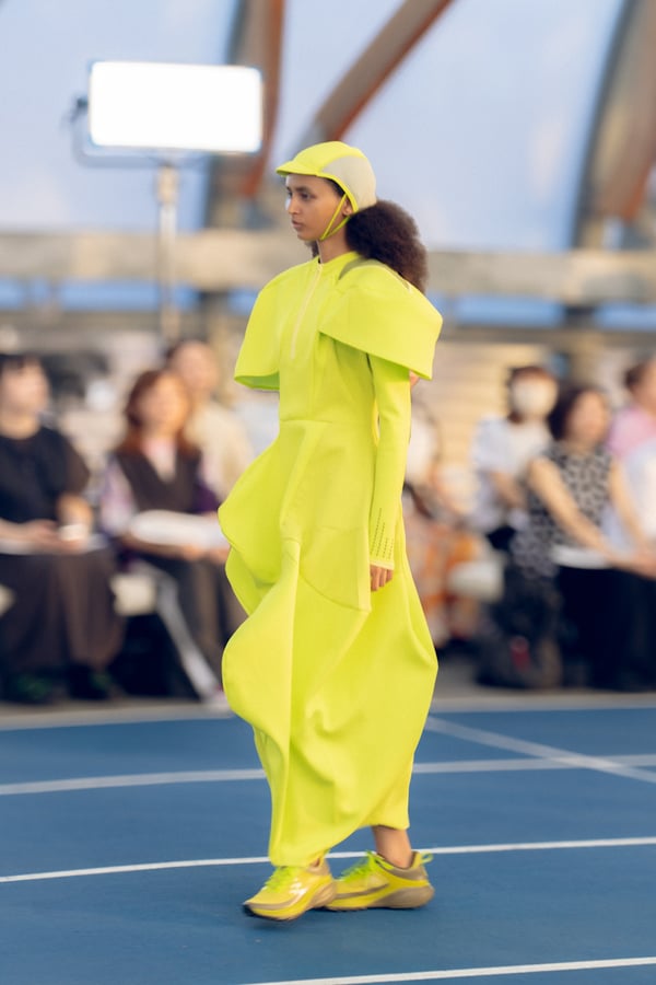 カラーパレットはピンクやイエロー、ブルーといった鮮やかなスタイルや、山岳地帯を想起させるアースカラーを採用し、タイトなシルエットだけではなく、心地良い山の空気感が漂う軽やかなオーバーサイズのアイテムも披露。山肌の岩石を連想させる丸みあるドレスや、シェルアウターやランニング用ベストも登場し、ヘッドバンドやキャップといった小物類と組み合わせたアスレジャースタイルへと昇華した。