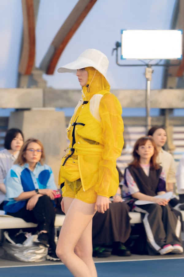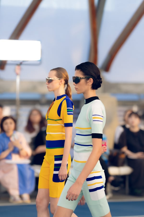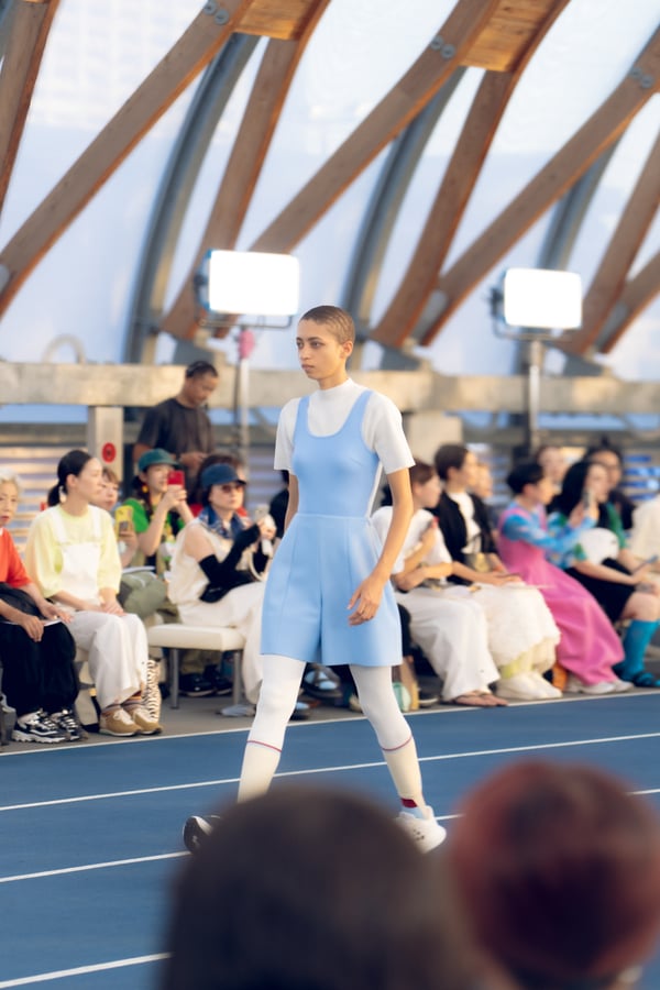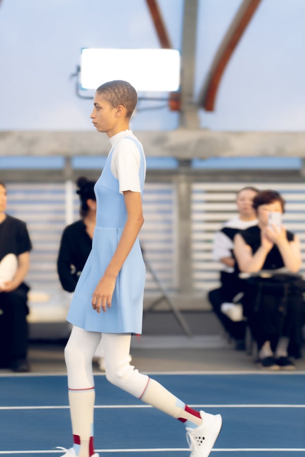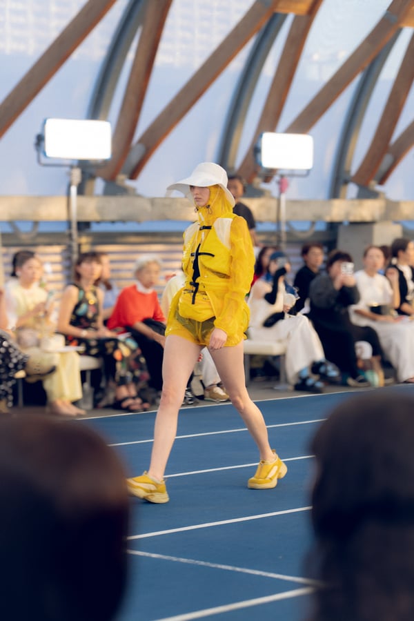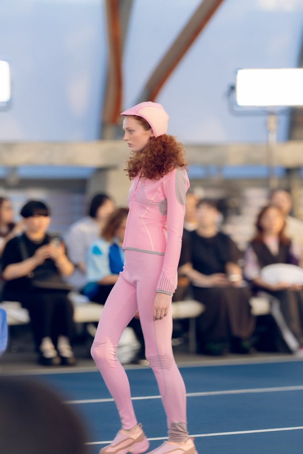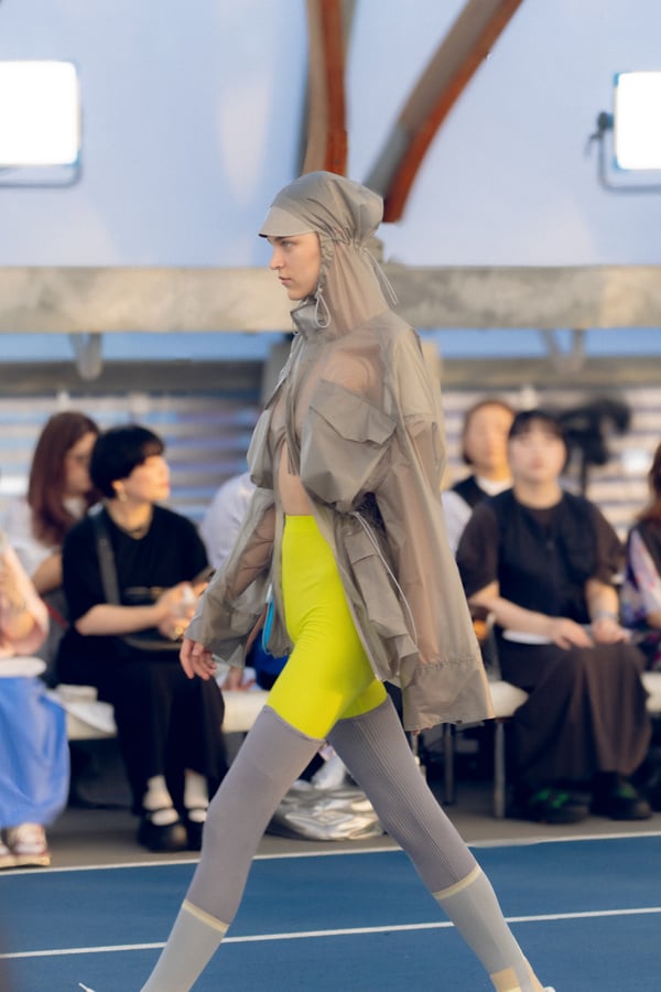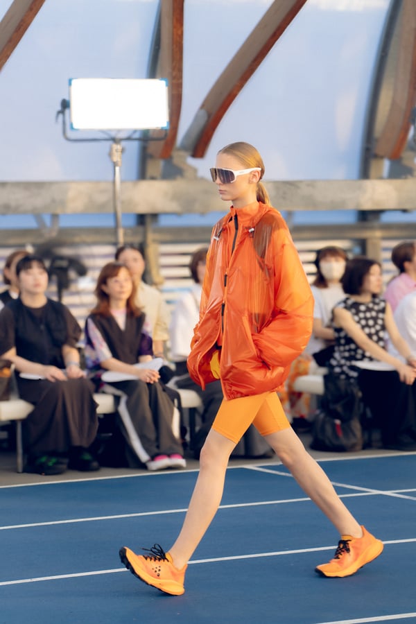 今回のコレクションは、アウトドアスタイルから着想した、ブランドが得意とするアスレジャーMIXを基調に構成。スイムウェアのようなシルエットのトップスやパンツ、レオタード、ショーツに加えて、ソックスを重ね履きしたようなライン入りタイツといったボディコンシャスなアイテムを着用したモデルが、アリーナのトラックを闊歩した。