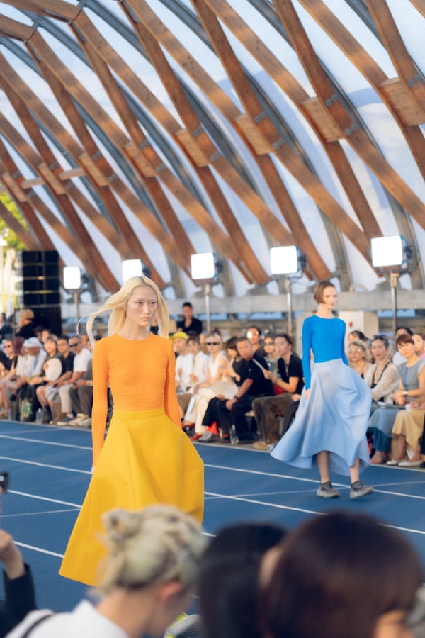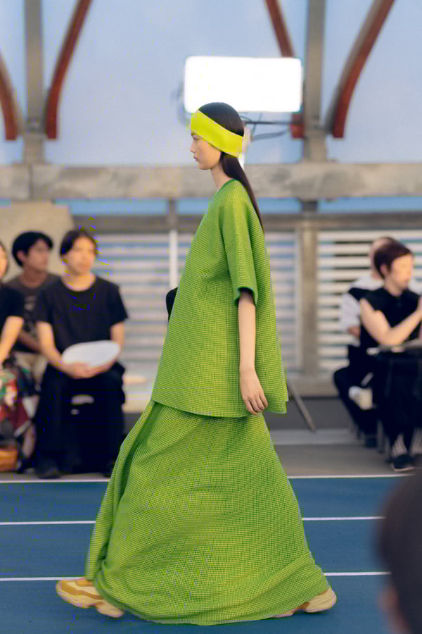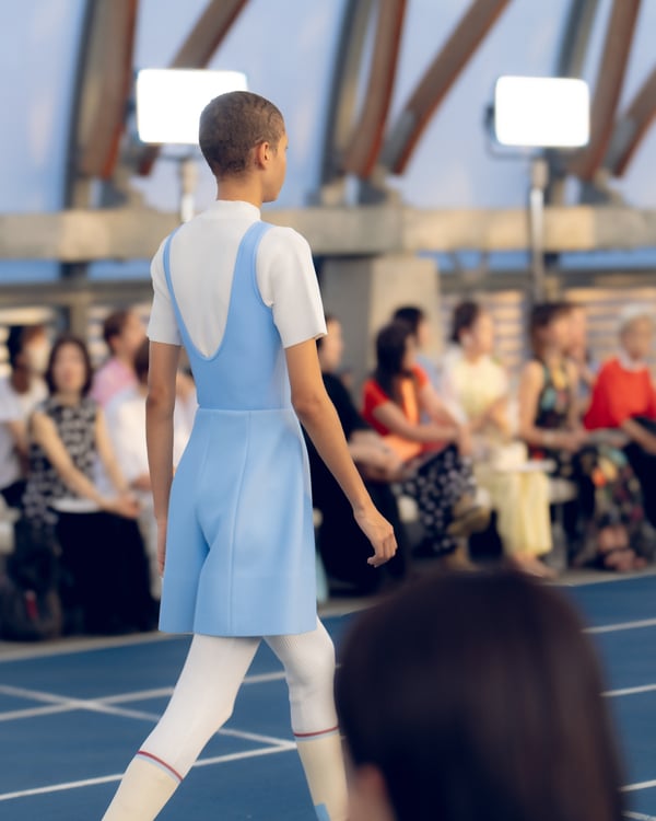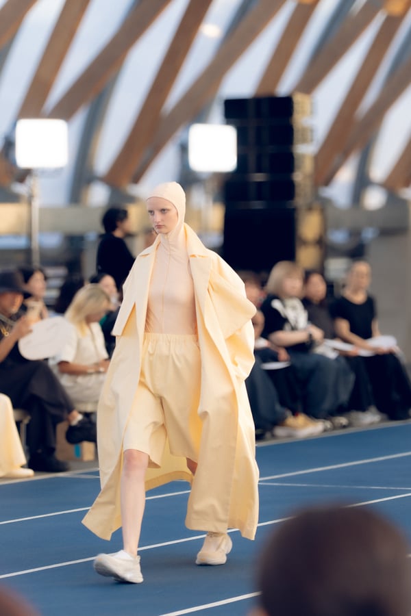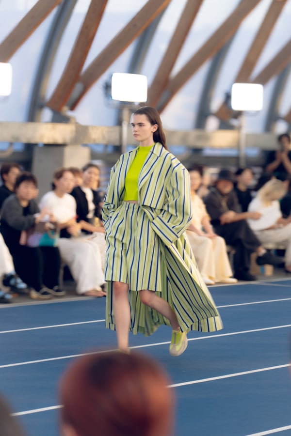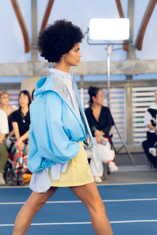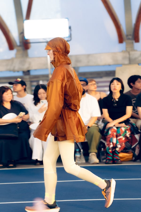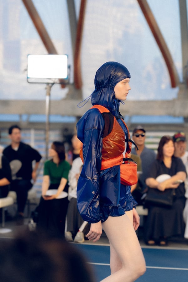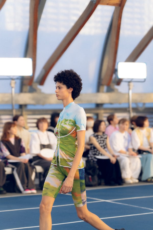 今回のコレクションは、アウトドアスタイルから着想した、ブランドが得意とするアスレジャーMIXを基調に構成。スイムウェアのようなシルエットのトップスやパンツ、レオタード、ショーツに加えて、ソックスを重ね履きしたようなライン入りタイツといったボディコンシャスなアイテムを着用したモデルが、アリーナのトラックを闊歩した。