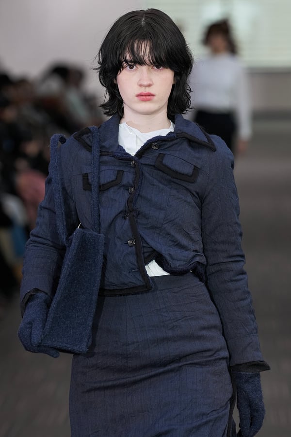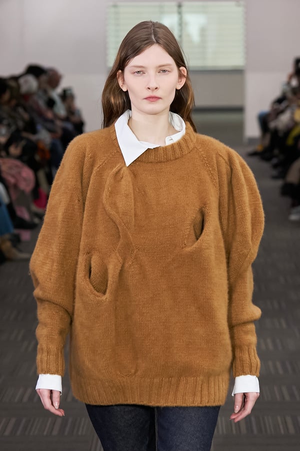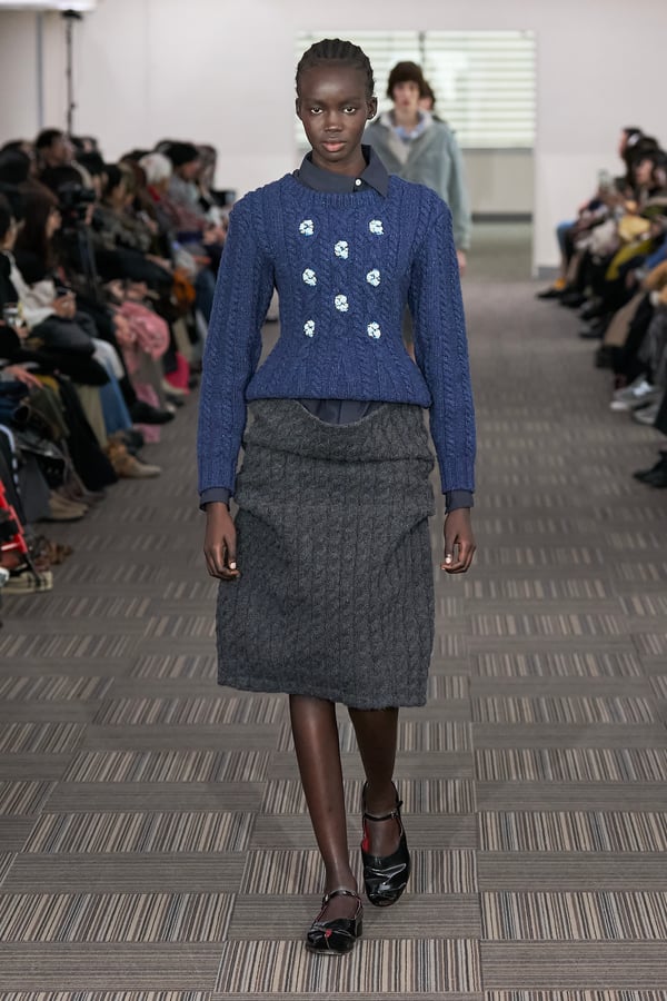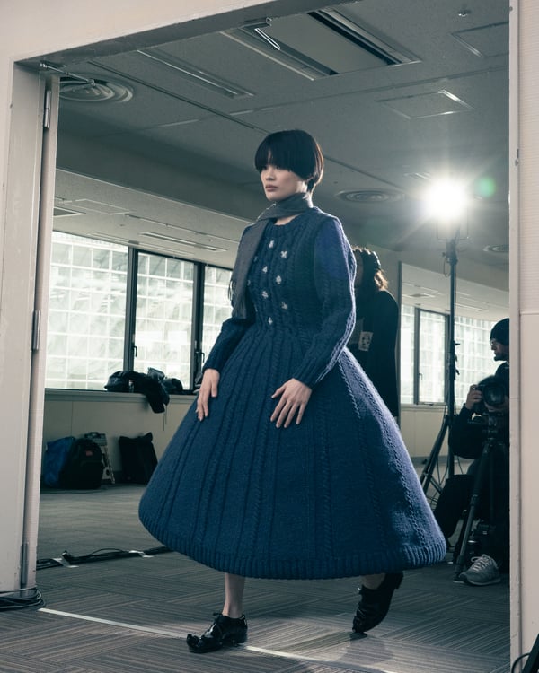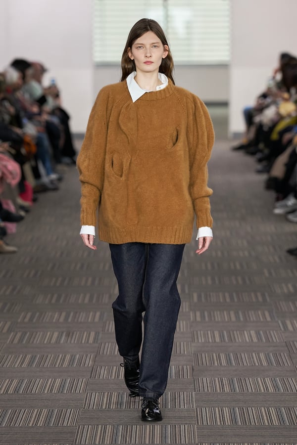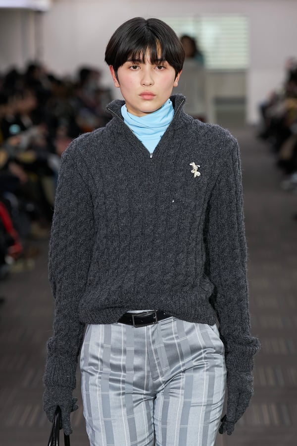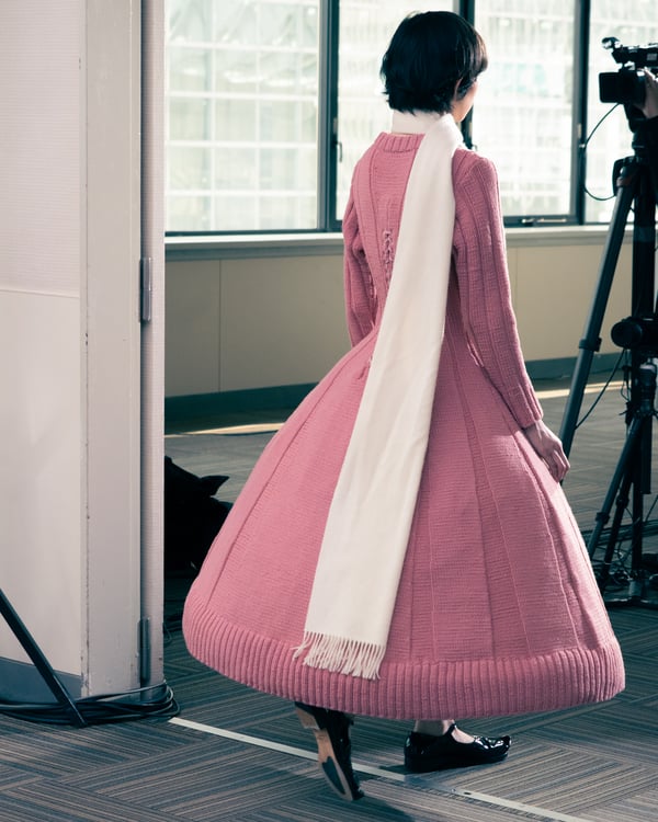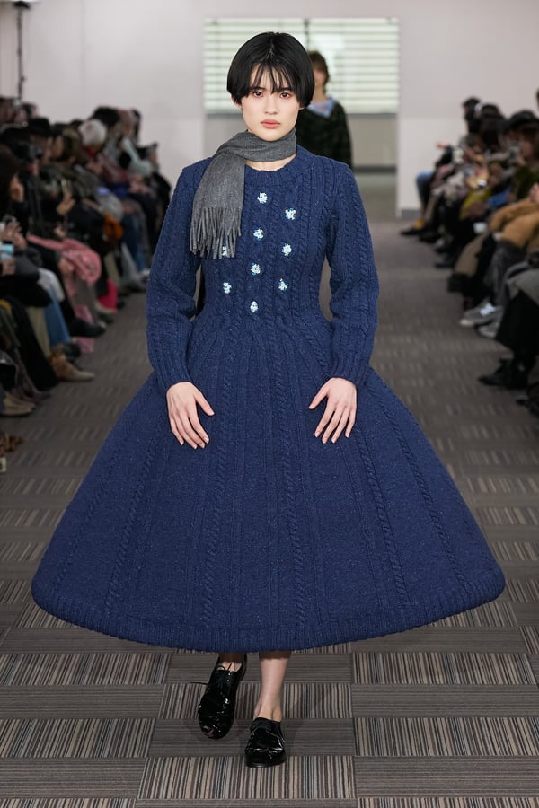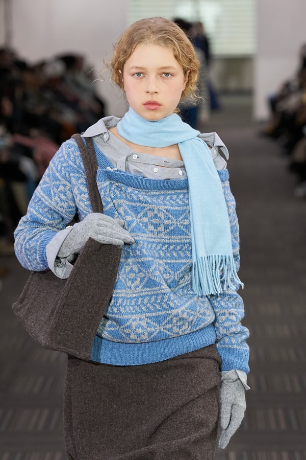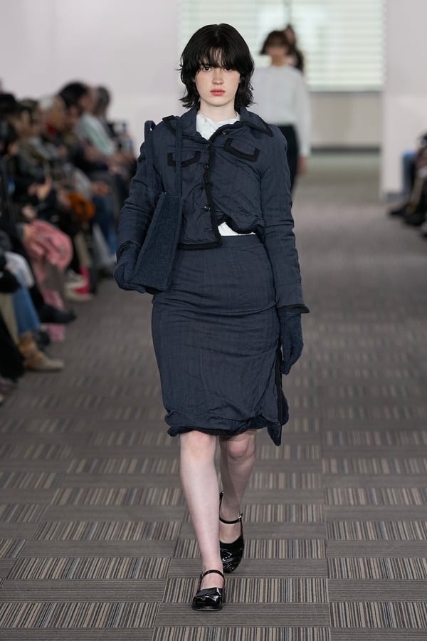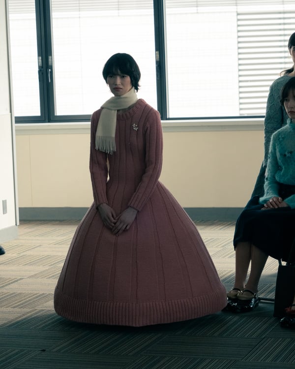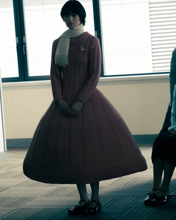 コレクションでは、ネイビーの膝丈のスカートスーツや、ハイネックのインナーに無地のカーディガンとスラックスを合わせた“オフィスカジュアル”から、フーディーとデニムパンツ、人形の衣装のようなプリンセスラインのニットドレスまで、リアルな日常着とファンタジックなスタイルが地続きの世界感の中で混在して登場。いずれも、縮絨や洗いをかけて風合いを出す加工、ボタンを掛け違えたようなデザイン、ポケットの袋布を少し釣り上げることで生まれるねじれたようなシェイプなど、ピリングスらしいわだかまりや歪みをあしらった。