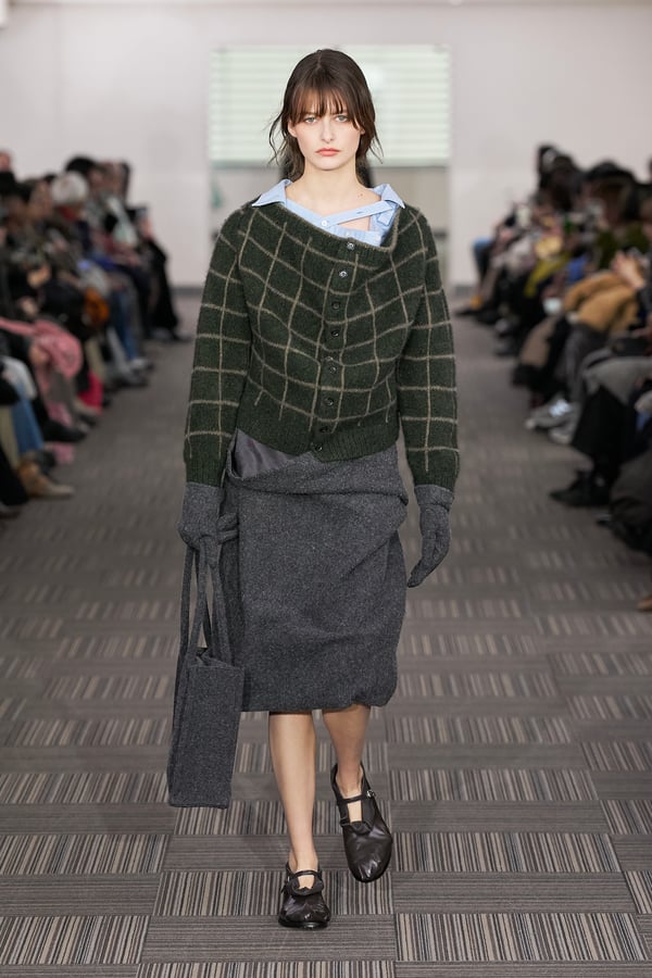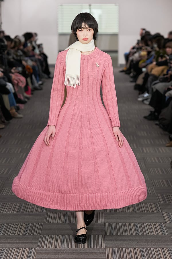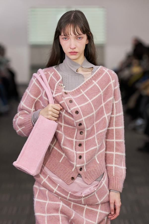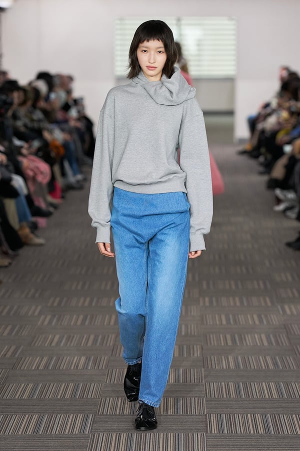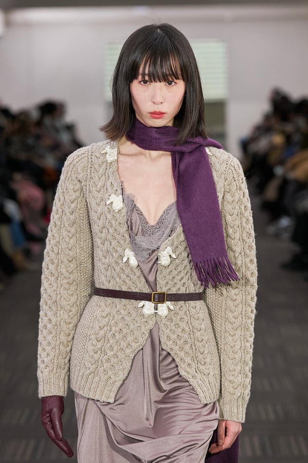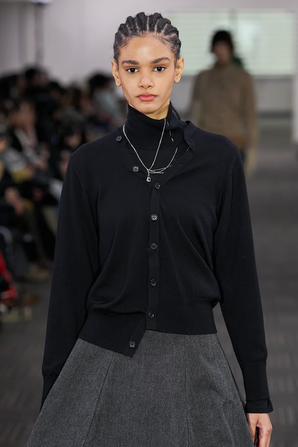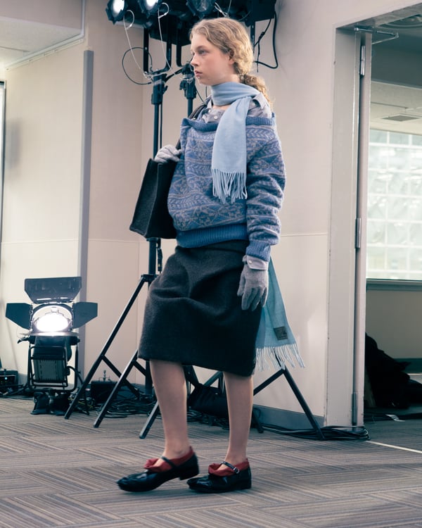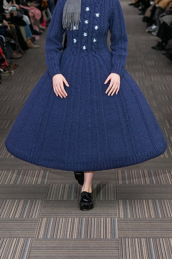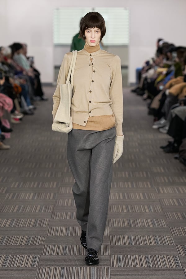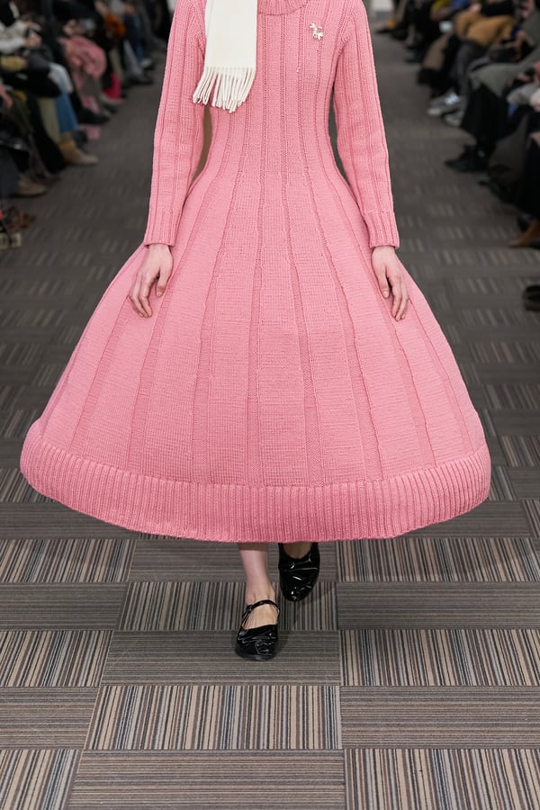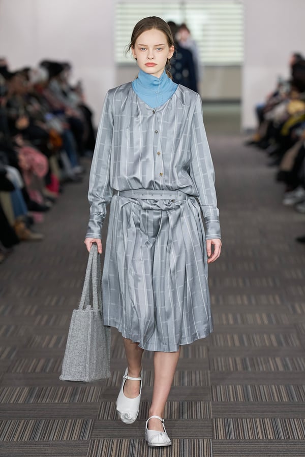 コレクションでは、ネイビーの膝丈のスカートスーツや、ハイネックのインナーに無地のカーディガンとスラックスを合わせた“オフィスカジュアル”から、フーディーとデニムパンツ、人形の衣装のようなプリンセスラインのニットドレスまで、リアルな日常着とファンタジックなスタイルが地続きの世界感の中で混在して登場。いずれも、縮絨や洗いをかけて風合いを出す加工、ボタンを掛け違えたようなデザイン、ポケットの袋布を少し釣り上げることで生まれるねじれたようなシェイプなど、ピリングスらしいわだかまりや歪みをあしらった。