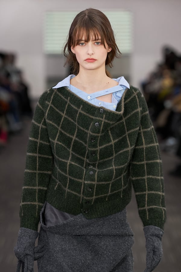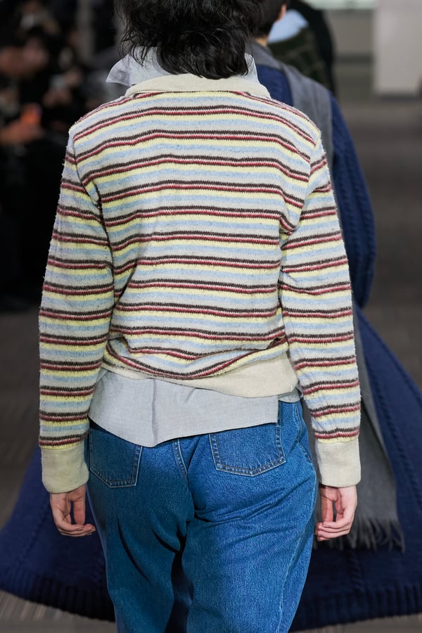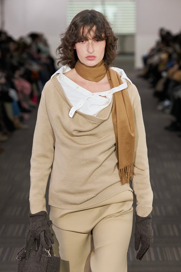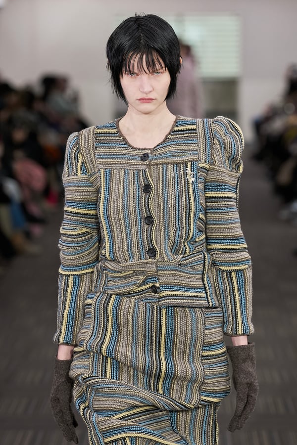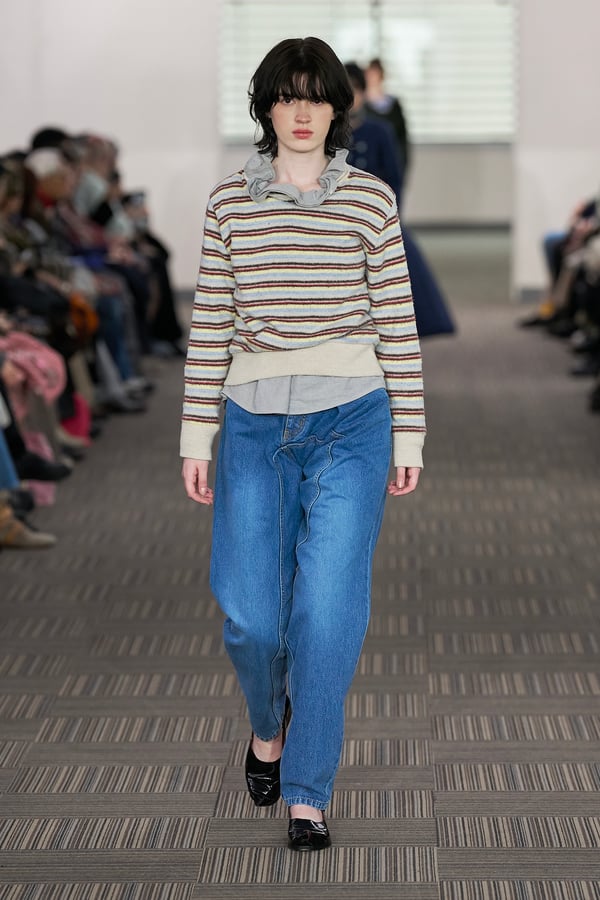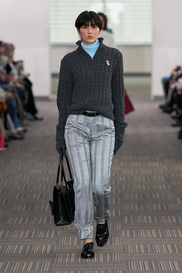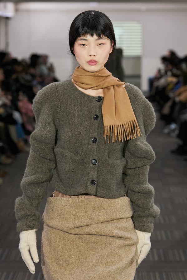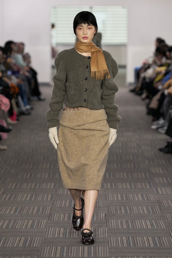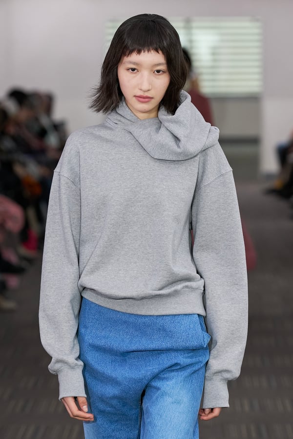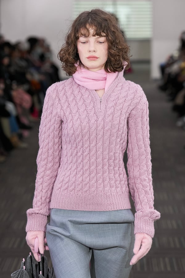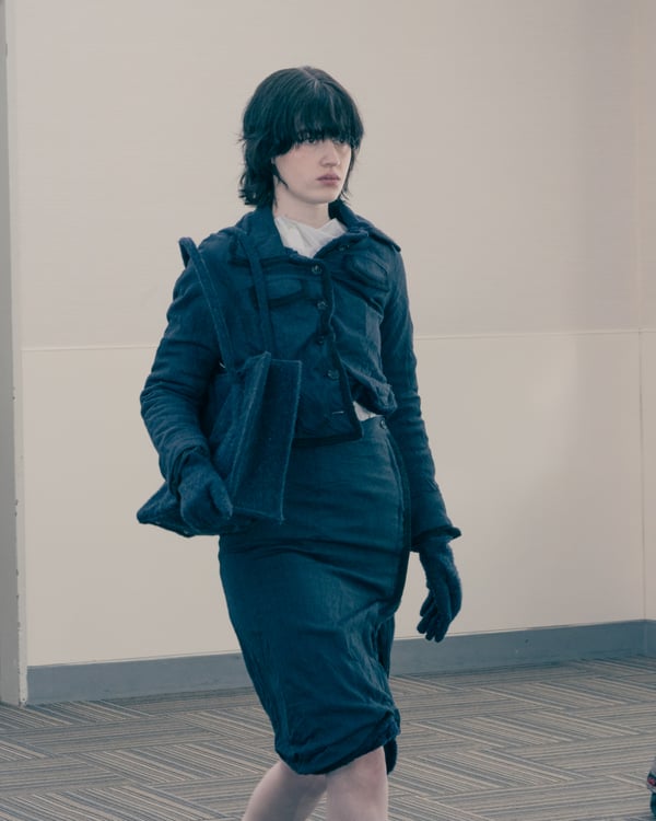 コレクションでは、ネイビーの膝丈のスカートスーツや、ハイネックのインナーに無地のカーディガンとスラックスを合わせた“オフィスカジュアル”から、フーディーとデニムパンツ、人形の衣装のようなプリンセスラインのニットドレスまで、リアルな日常着とファンタジックなスタイルが地続きの世界感の中で混在して登場。いずれも、縮絨や洗いをかけて風合いを出す加工、ボタンを掛け違えたようなデザイン、ポケットの袋布を少し釣り上げることで生まれるねじれたようなシェイプなど、ピリングスらしいわだかまりや歪みをあしらった。