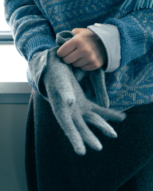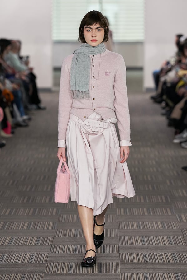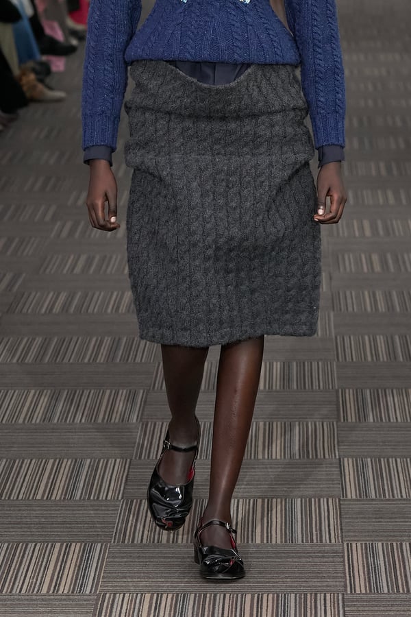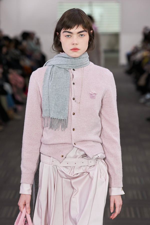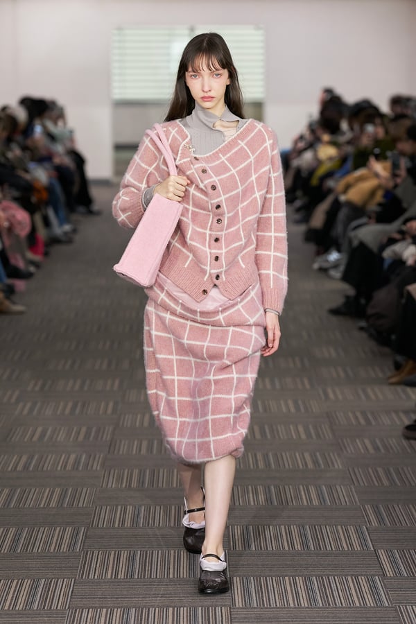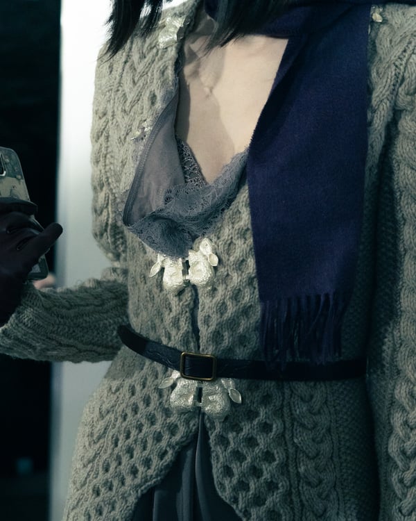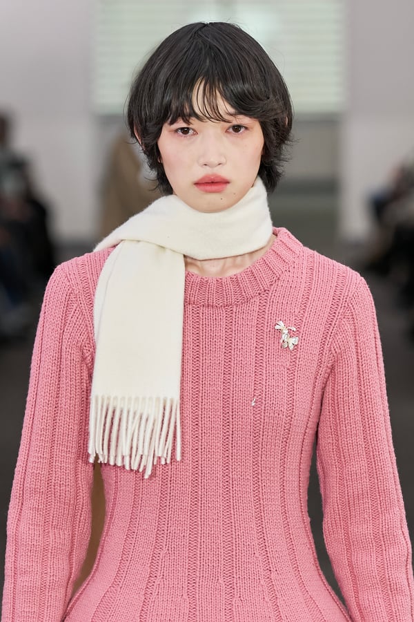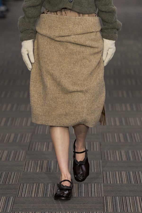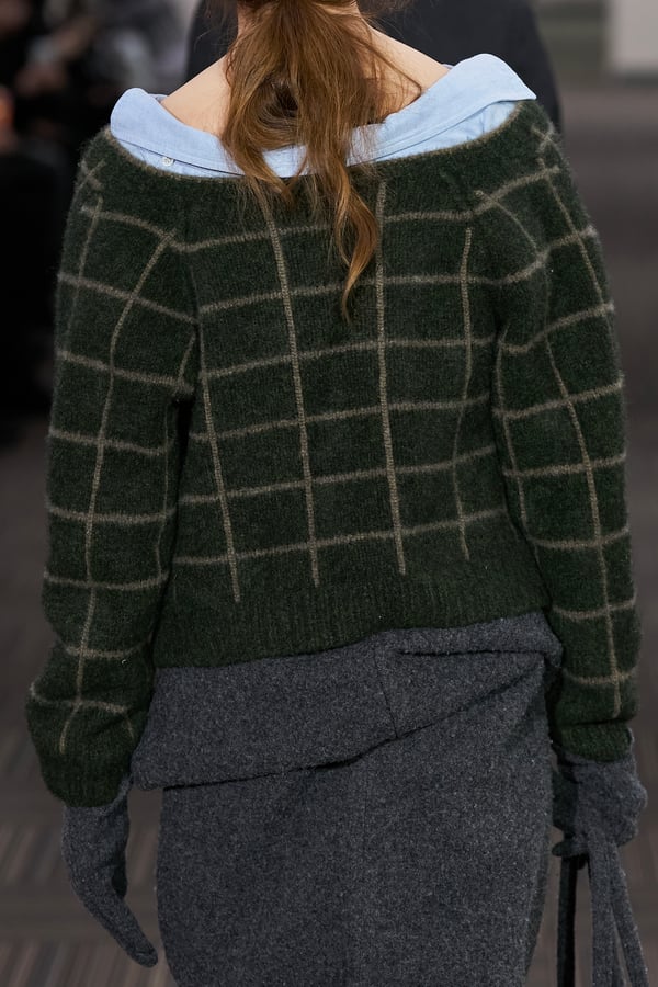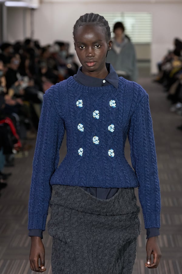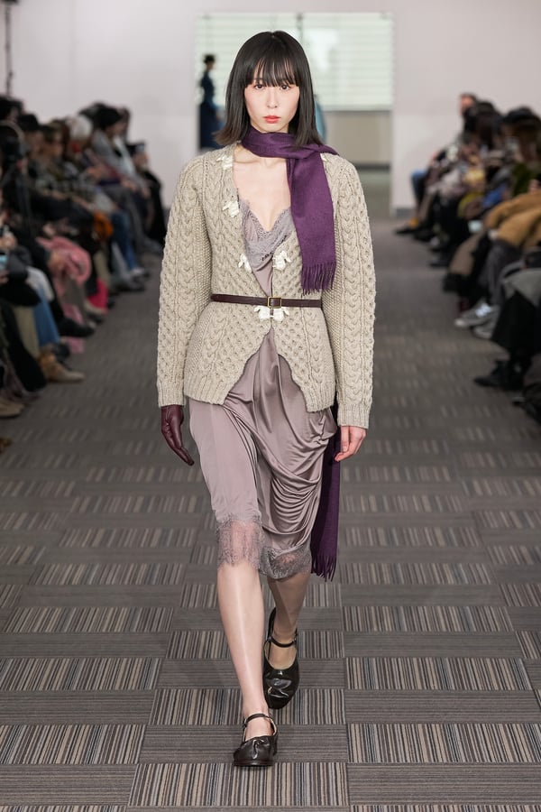 コレクションでは、ネイビーの膝丈のスカートスーツや、ハイネックのインナーに無地のカーディガンとスラックスを合わせた“オフィスカジュアル”から、フーディーとデニムパンツ、人形の衣装のようなプリンセスラインのニットドレスまで、リアルな日常着とファンタジックなスタイルが地続きの世界感の中で混在して登場。いずれも、縮絨や洗いをかけて風合いを出す加工、ボタンを掛け違えたようなデザイン、ポケットの袋布を少し釣り上げることで生まれるねじれたようなシェイプなど、ピリングスらしいわだかまりや歪みをあしらった。