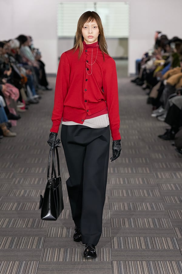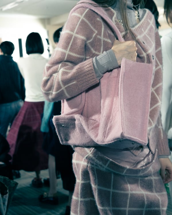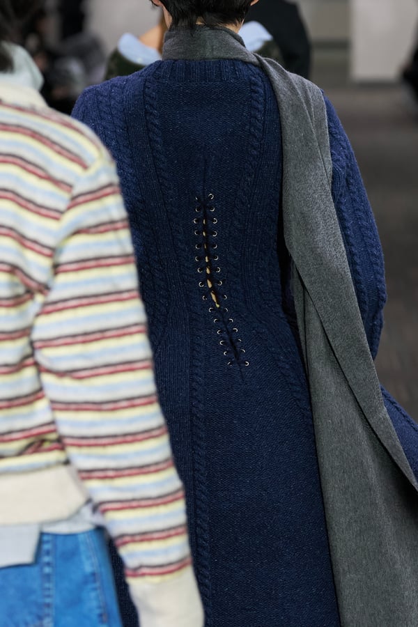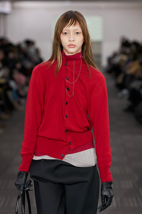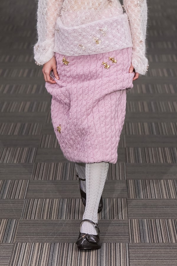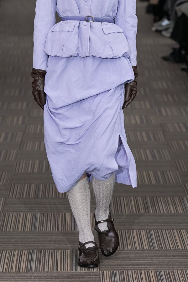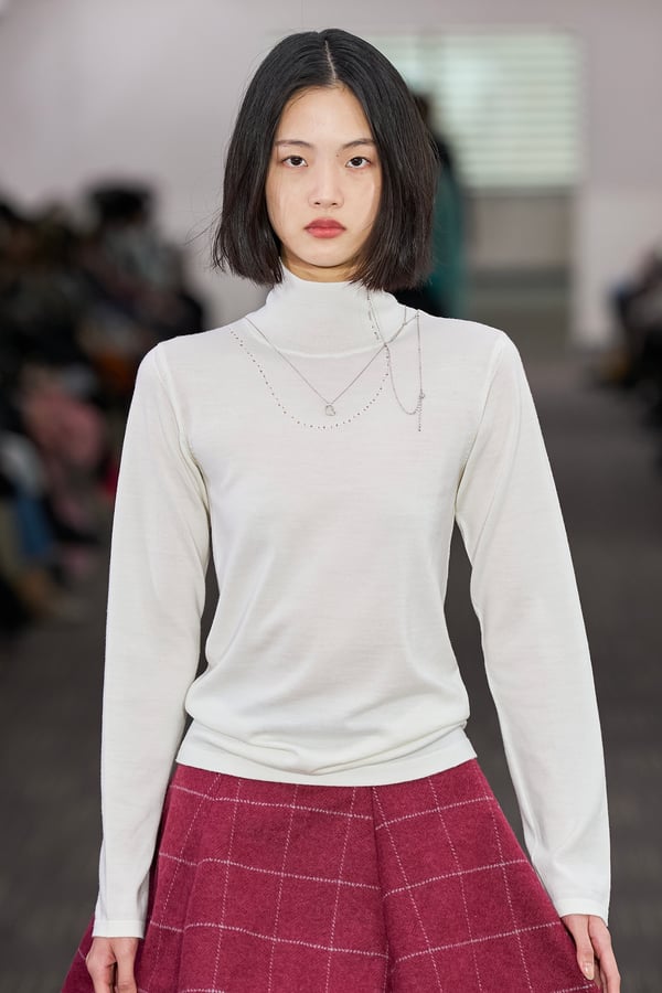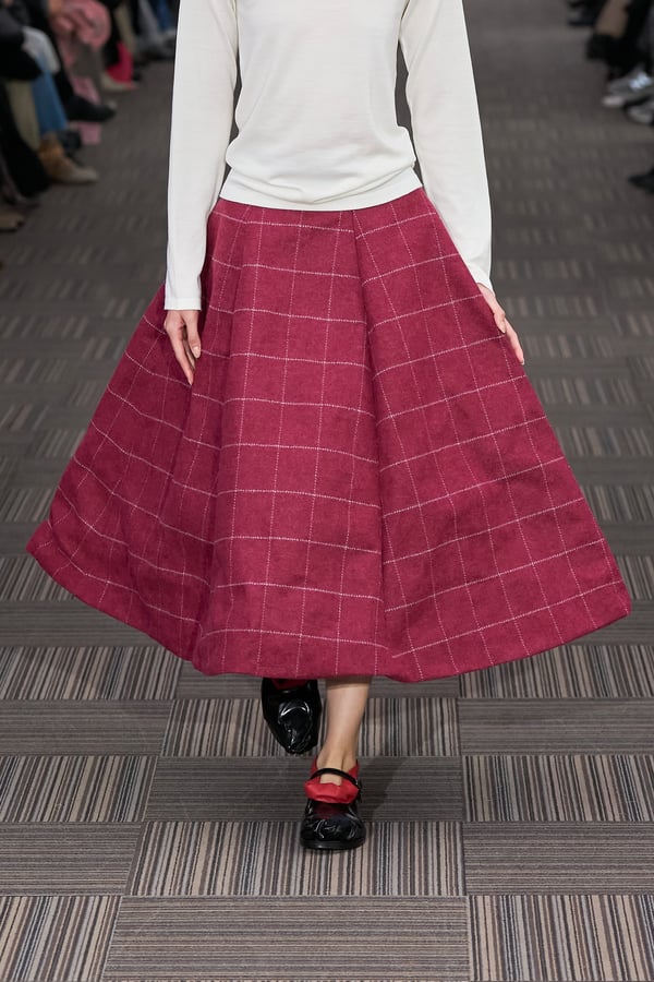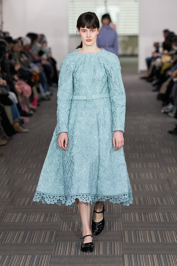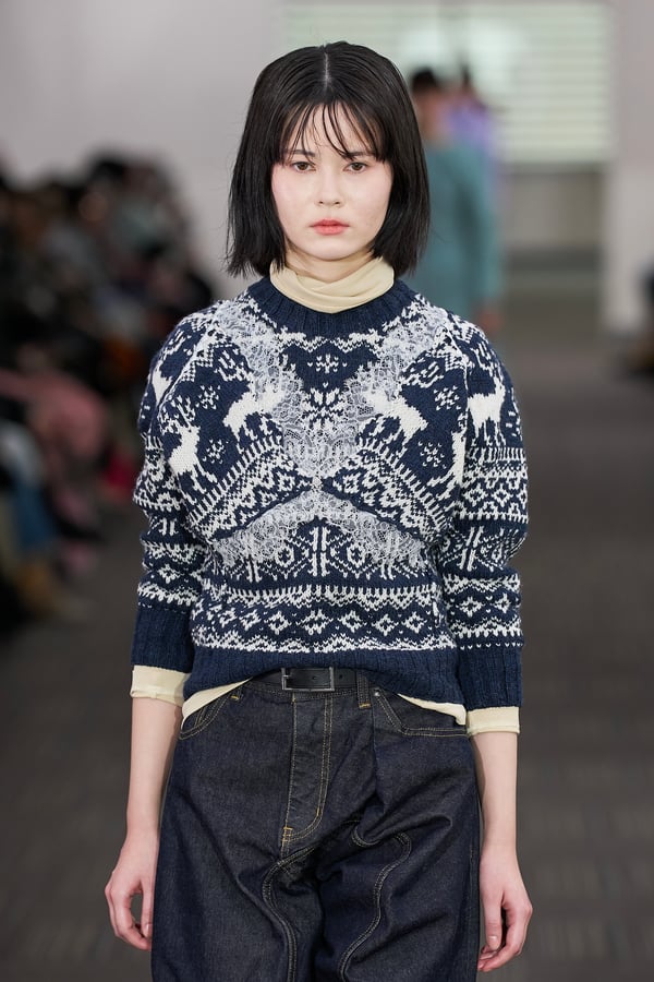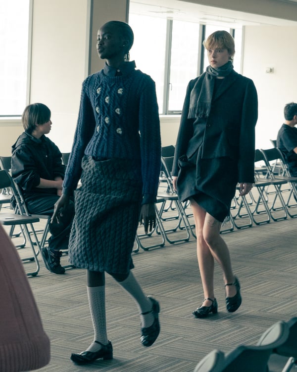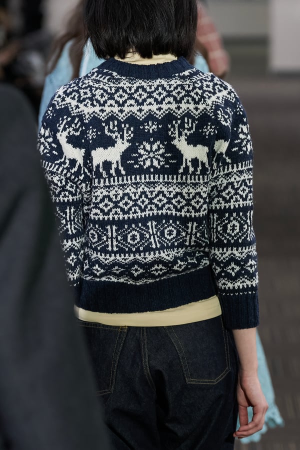 コレクションでは、ネイビーの膝丈のスカートスーツや、ハイネックのインナーに無地のカーディガンとスラックスを合わせた“オフィスカジュアル”から、フーディーとデニムパンツ、人形の衣装のようなプリンセスラインのニットドレスまで、リアルな日常着とファンタジックなスタイルが地続きの世界感の中で混在して登場。いずれも、縮絨や洗いをかけて風合いを出す加工、ボタンを掛け違えたようなデザイン、ポケットの袋布を少し釣り上げることで生まれるねじれたようなシェイプなど、ピリングスらしいわだかまりや歪みをあしらった。