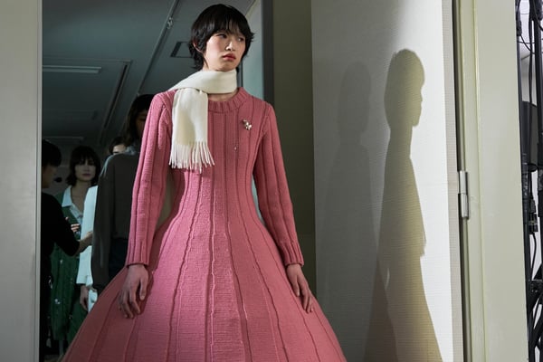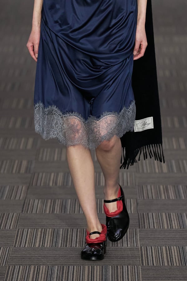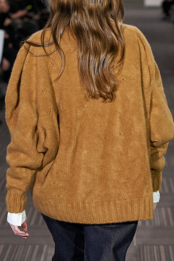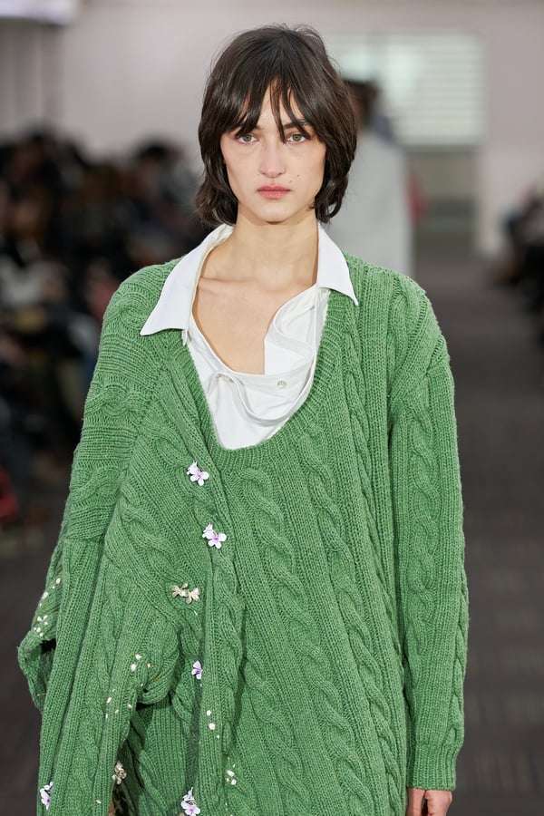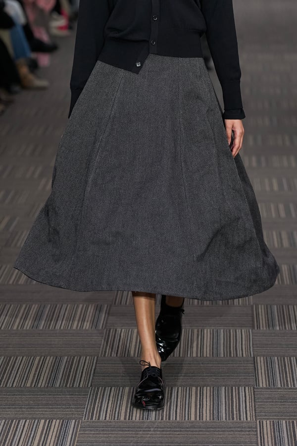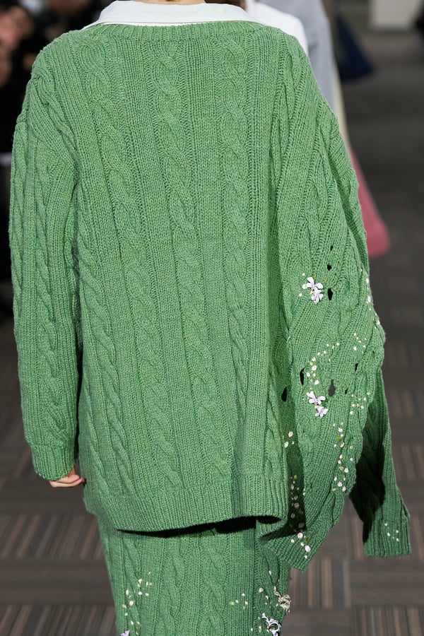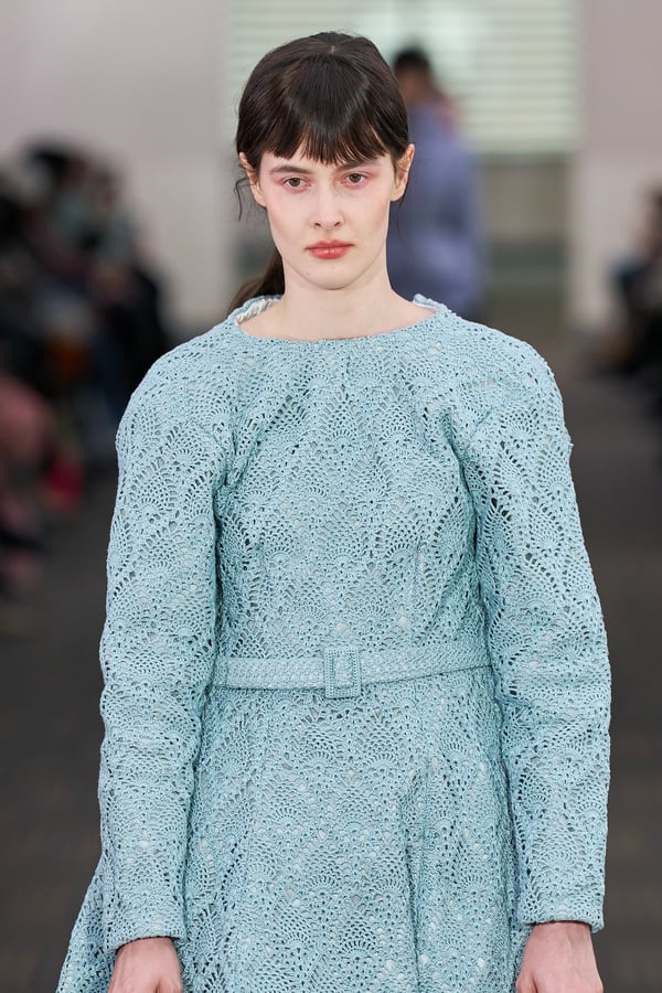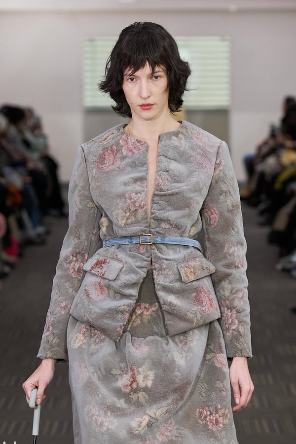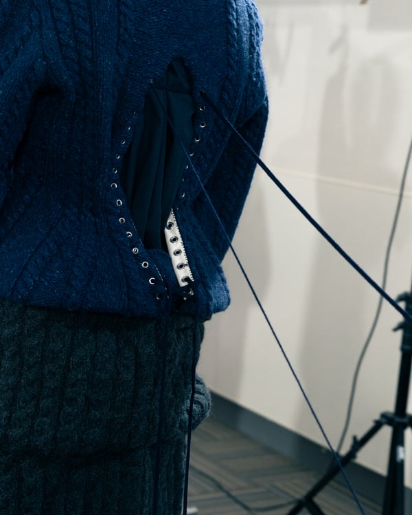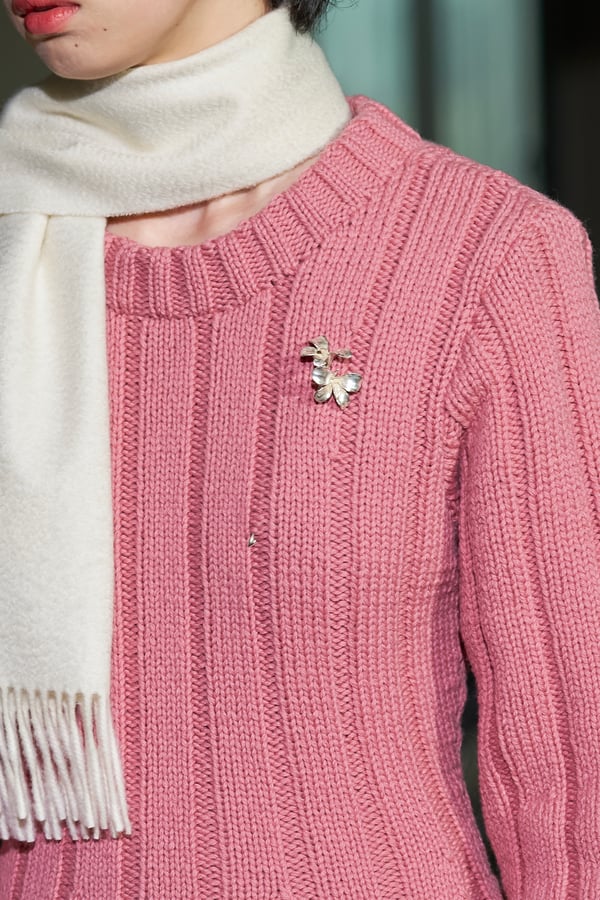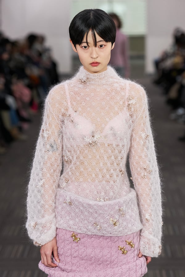 コレクションでは、ネイビーの膝丈のスカートスーツや、ハイネックのインナーに無地のカーディガンとスラックスを合わせた“オフィスカジュアル”から、フーディーとデニムパンツ、人形の衣装のようなプリンセスラインのニットドレスまで、リアルな日常着とファンタジックなスタイルが地続きの世界感の中で混在して登場。いずれも、縮絨や洗いをかけて風合いを出す加工、ボタンを掛け違えたようなデザイン、ポケットの袋布を少し釣り上げることで生まれるねじれたようなシェイプなど、ピリングスらしいわだかまりや歪みをあしらった。