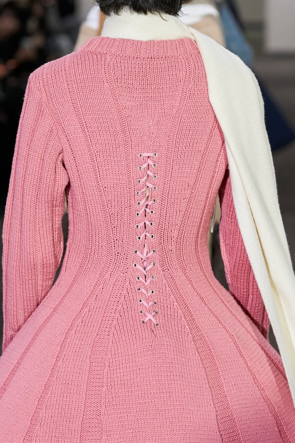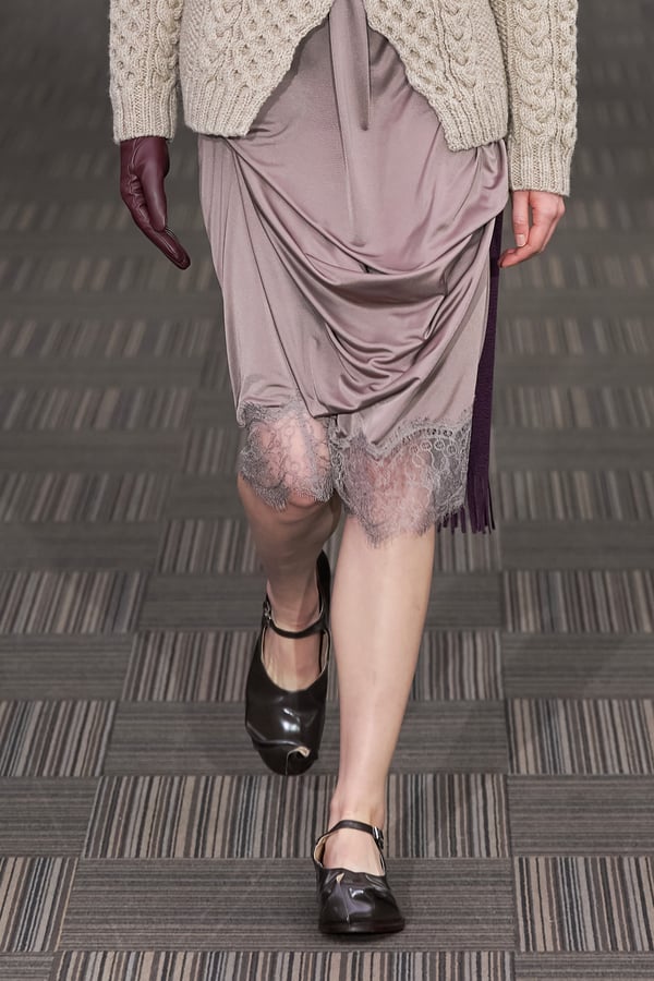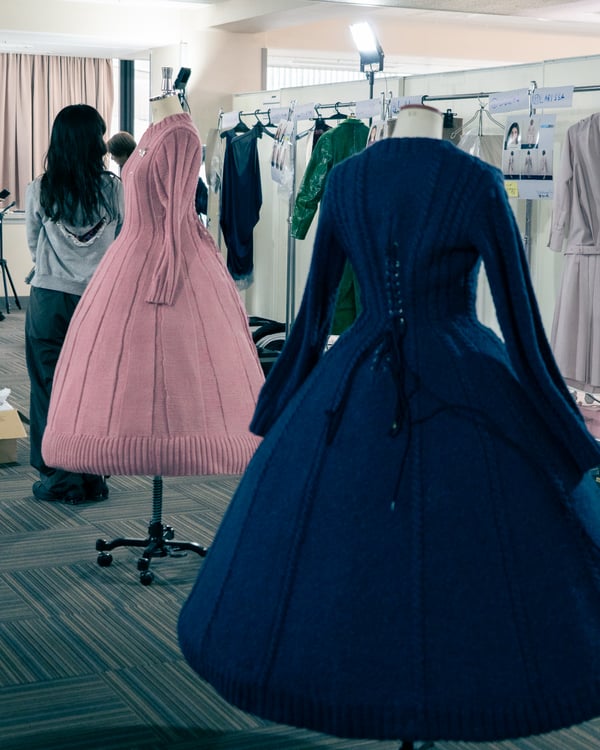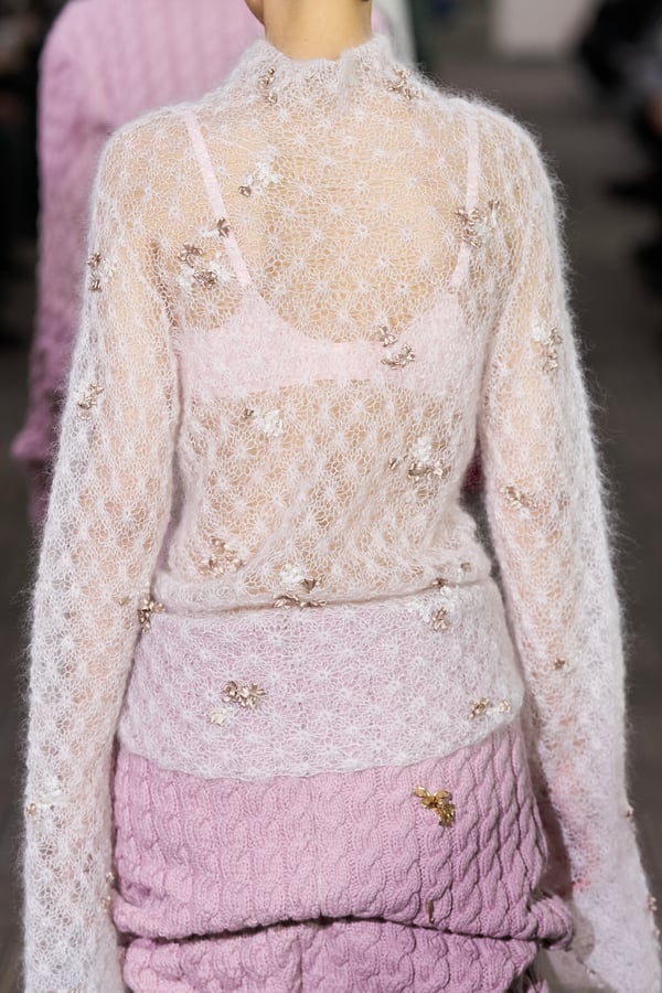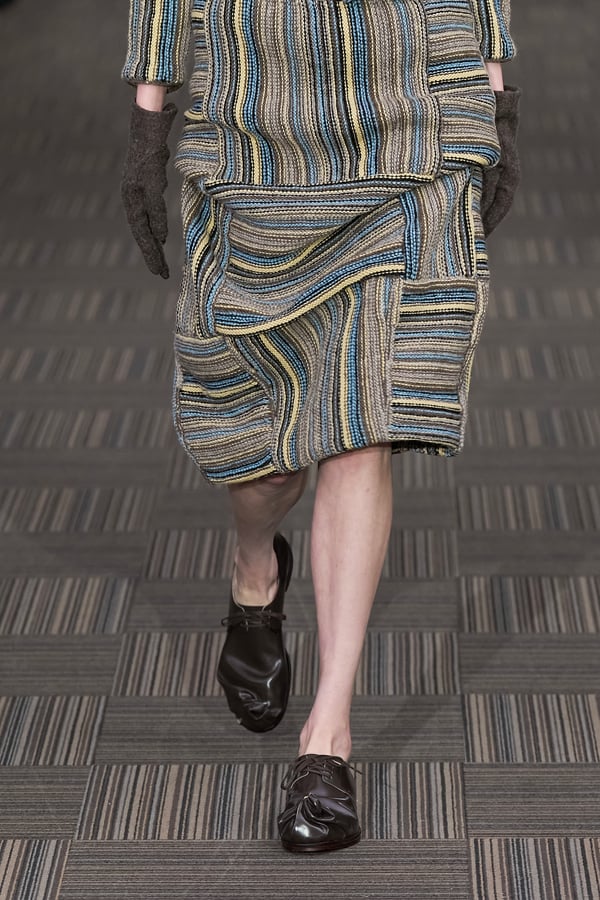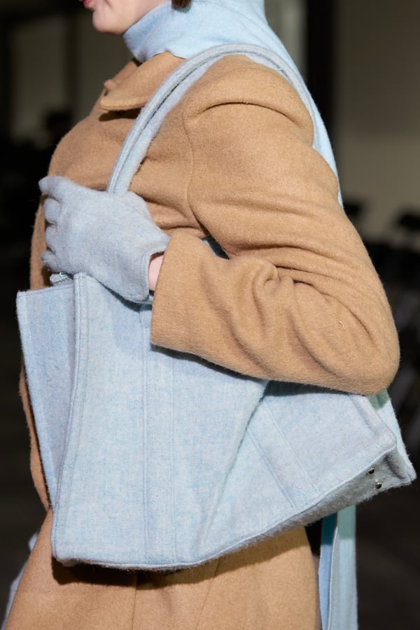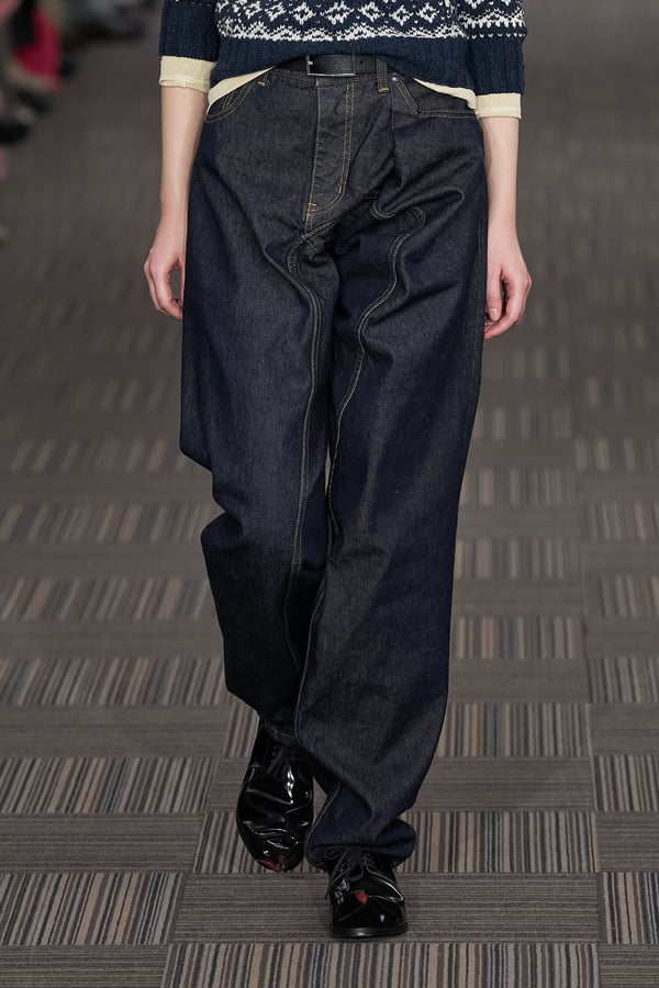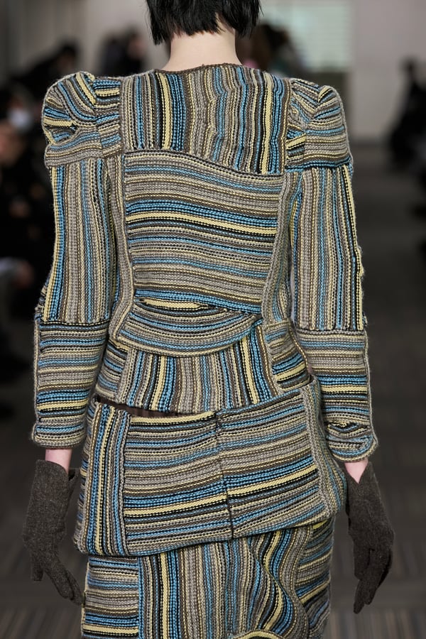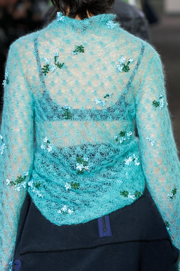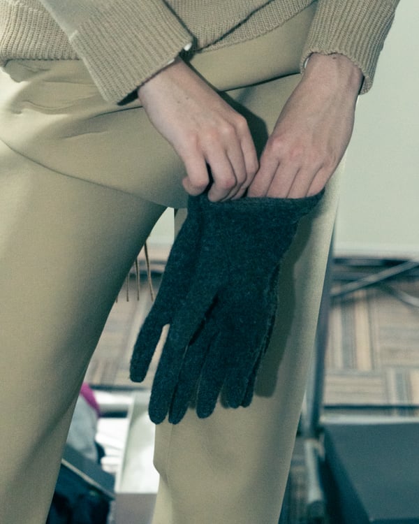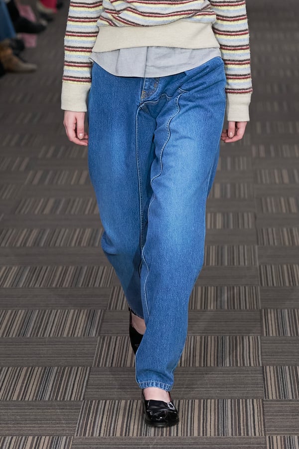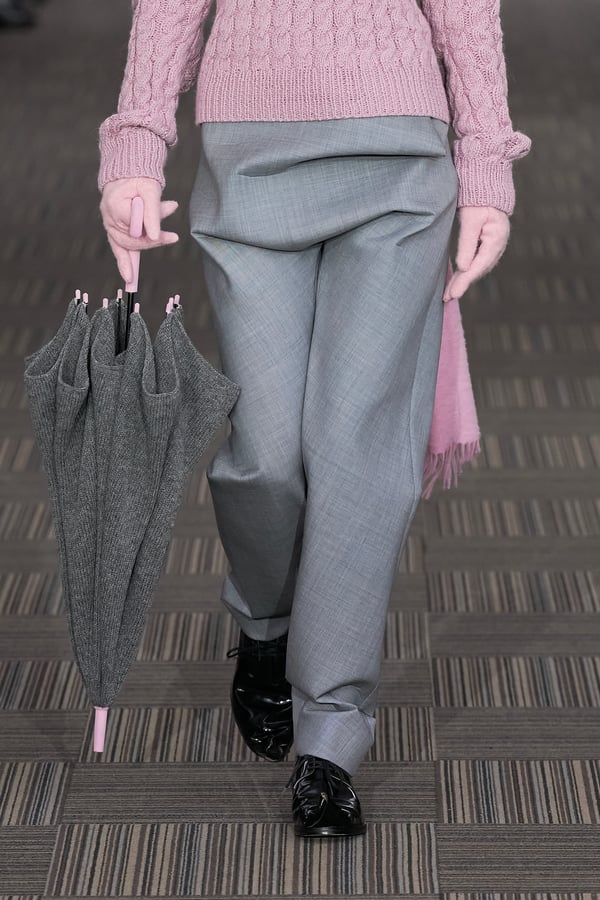 コレクションでは、ネイビーの膝丈のスカートスーツや、ハイネックのインナーに無地のカーディガンとスラックスを合わせた“オフィスカジュアル”から、フーディーとデニムパンツ、人形の衣装のようなプリンセスラインのニットドレスまで、リアルな日常着とファンタジックなスタイルが地続きの世界感の中で混在して登場。いずれも、縮絨や洗いをかけて風合いを出す加工、ボタンを掛け違えたようなデザイン、ポケットの袋布を少し釣り上げることで生まれるねじれたようなシェイプなど、ピリングスらしいわだかまりや歪みをあしらった。