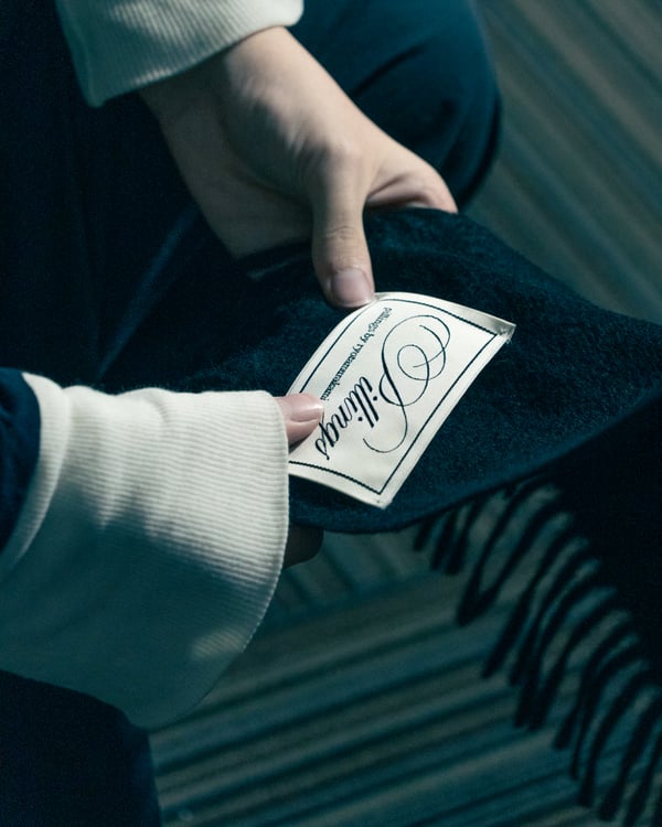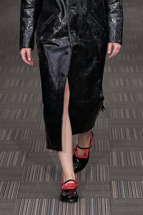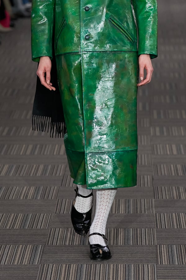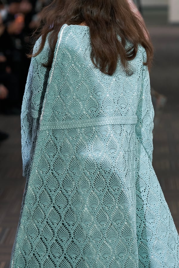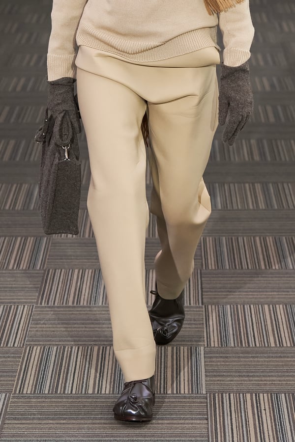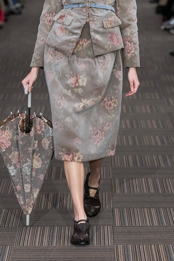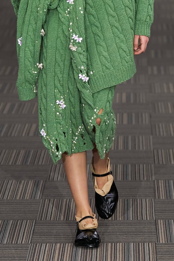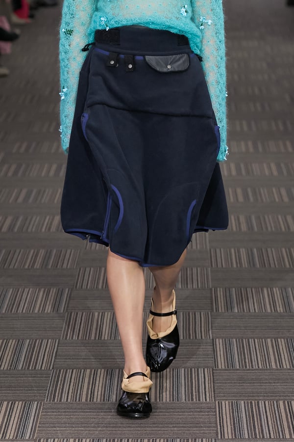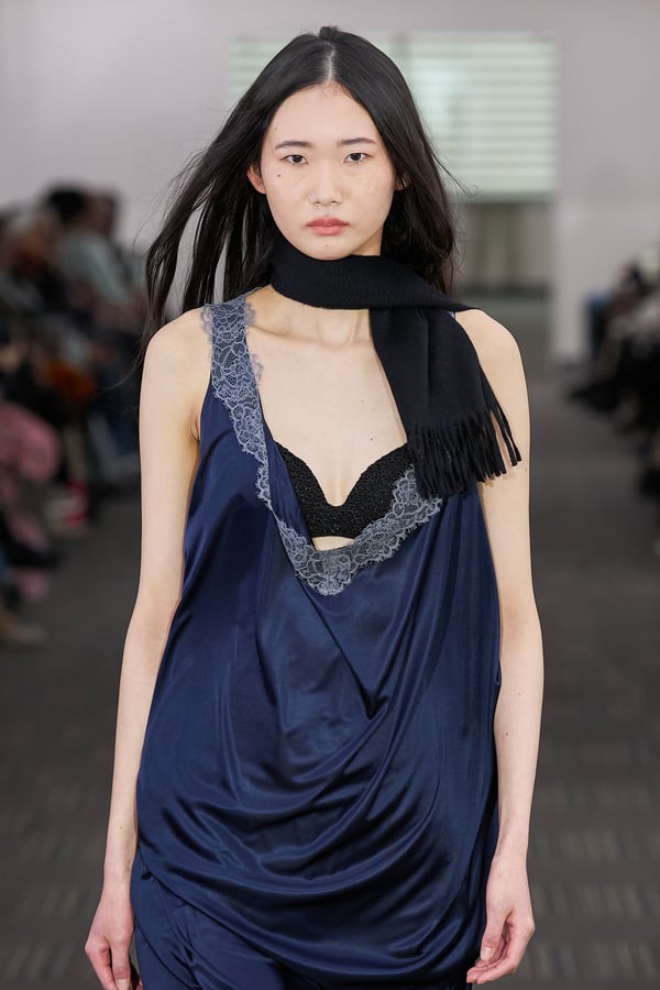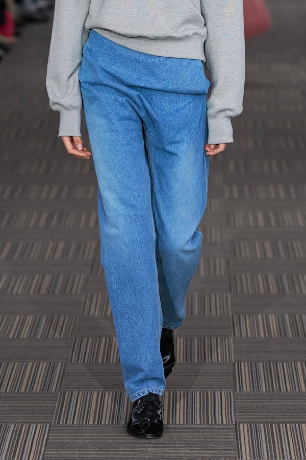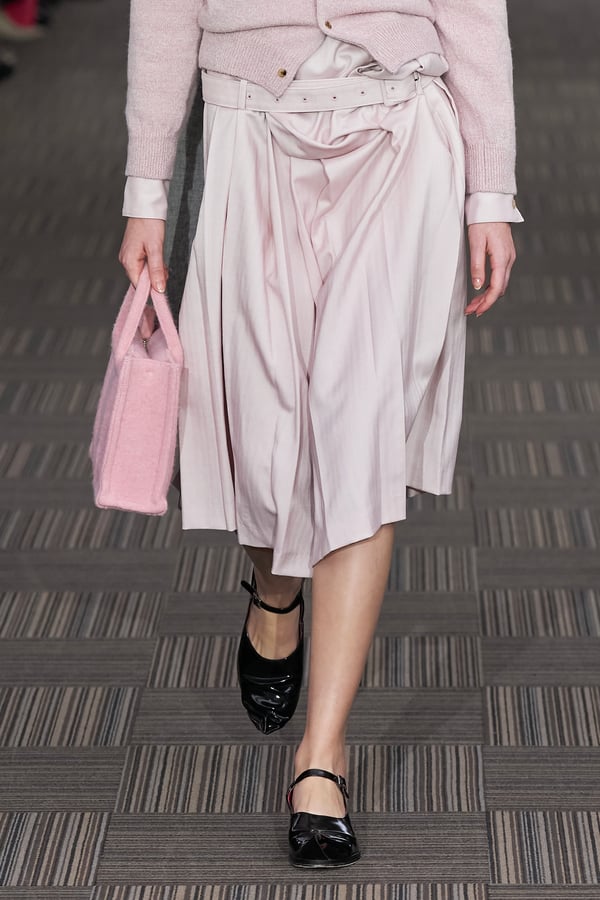コレクションでは、ネイビーの膝丈のスカートスーツや、ハイネックのインナーに無地のカーディガンとスラックスを合わせた“オフィスカジュアル”から、フーディーとデニムパンツ、人形の衣装のようなプリンセスラインのニットドレスまで、リアルな日常着とファンタジックなスタイルが地続きの世界感の中で混在して登場。いずれも、縮絨や洗いをかけて風合いを出す加工、ボタンを掛け違えたようなデザイン、ポケットの袋布を少し釣り上げることで生まれるねじれたようなシェイプなど、ピリングスらしいわだかまりや歪みをあしらった。