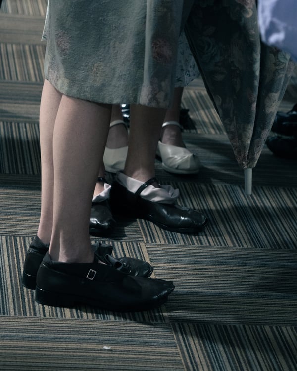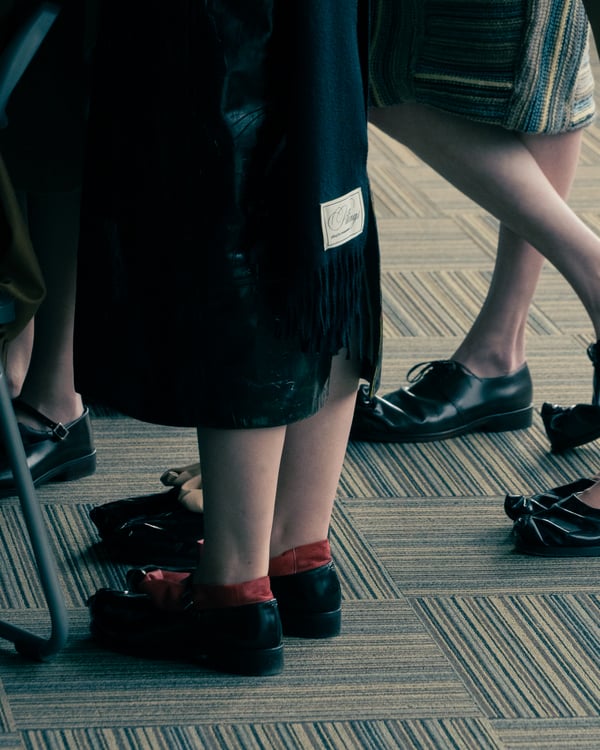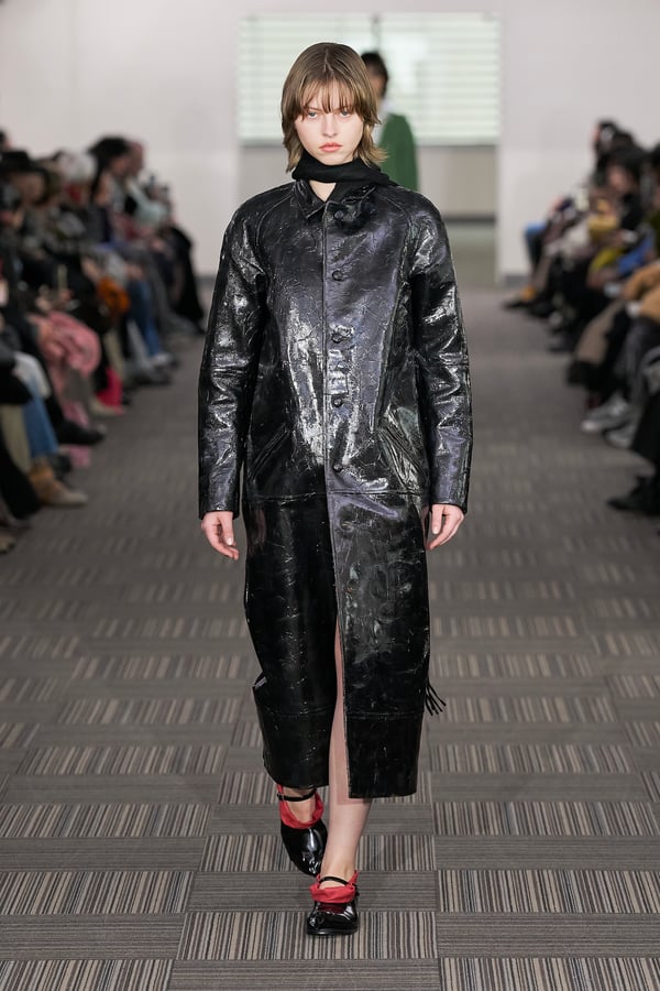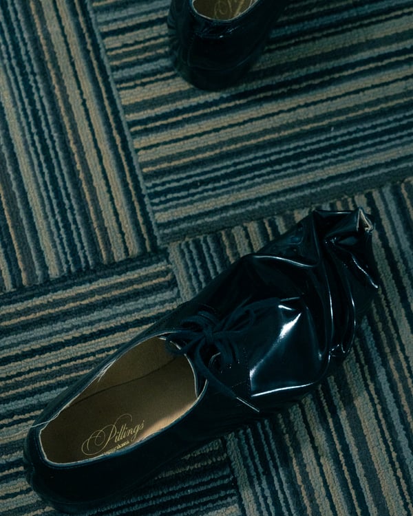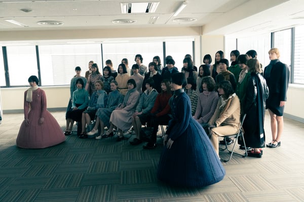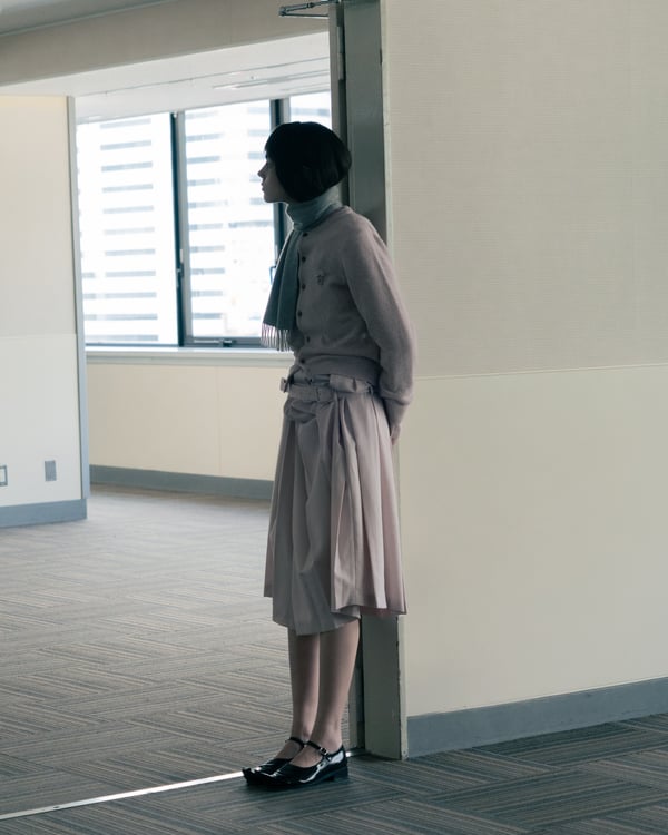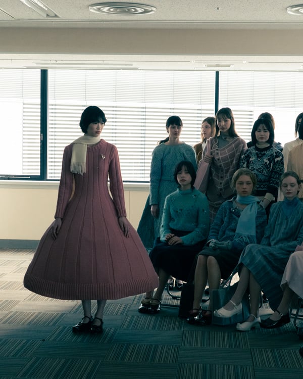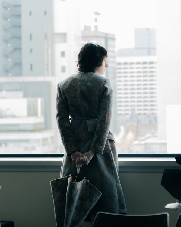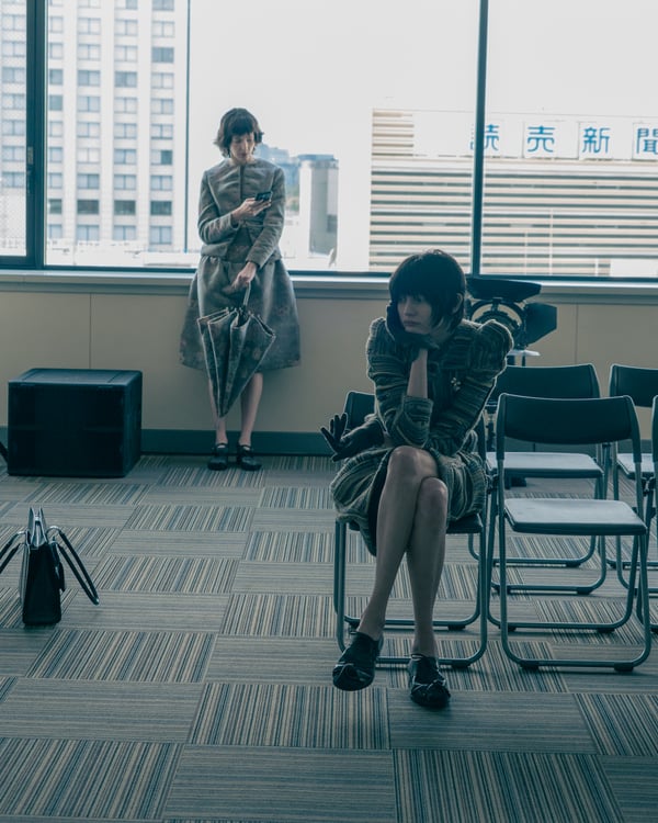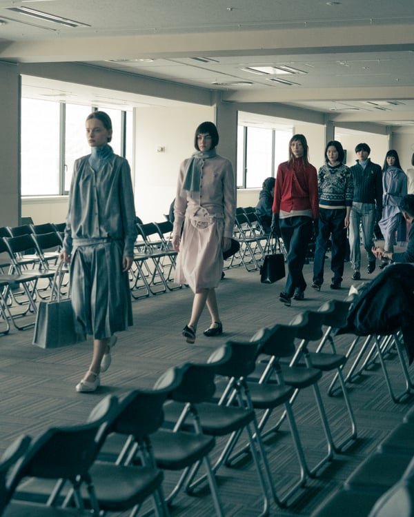 村上亮太が手掛ける「ピリングス(pillings)」が、2026年秋冬コレクションをランウェイショー形式で発表した。会場は、東京交通会館 12階のダイヤモンドホール。窓から青空と有楽町の街並みを臨む、少し古びれたオフィスのような空間を舞台に、リアルとファンタジーが入り混じった世界観のショーが行われた。