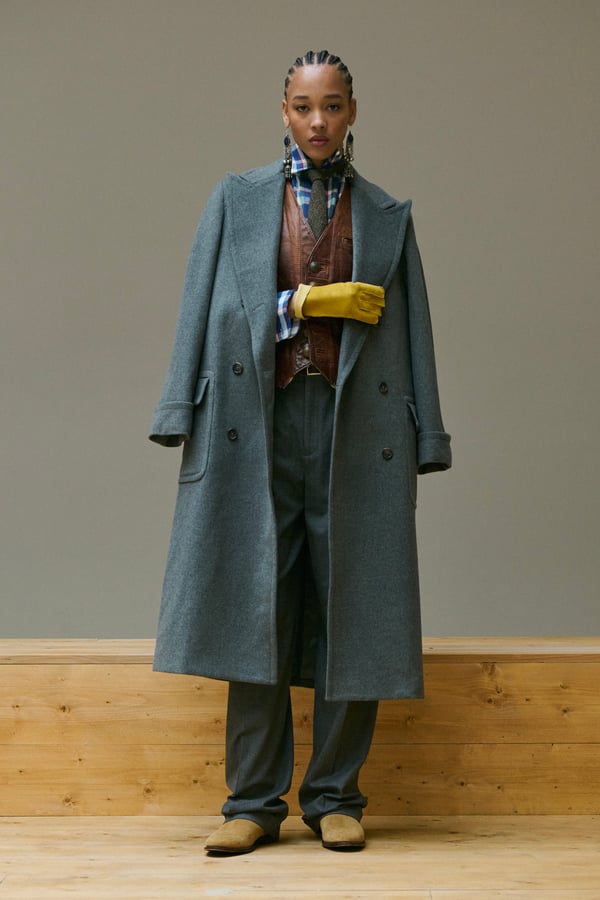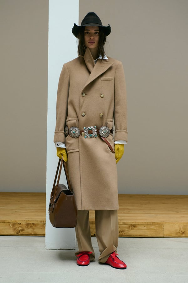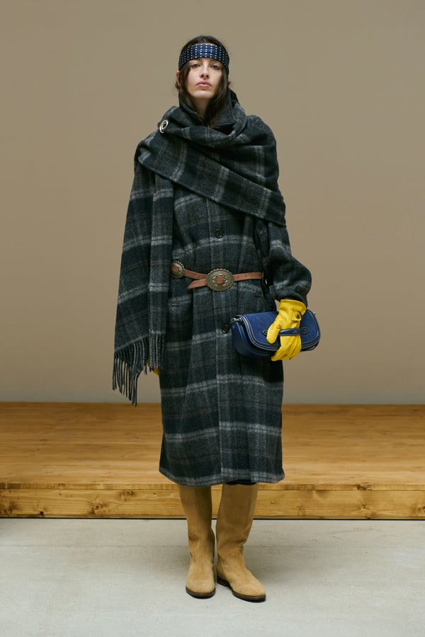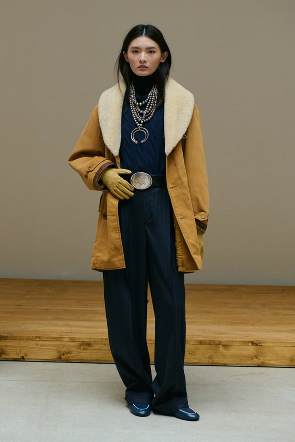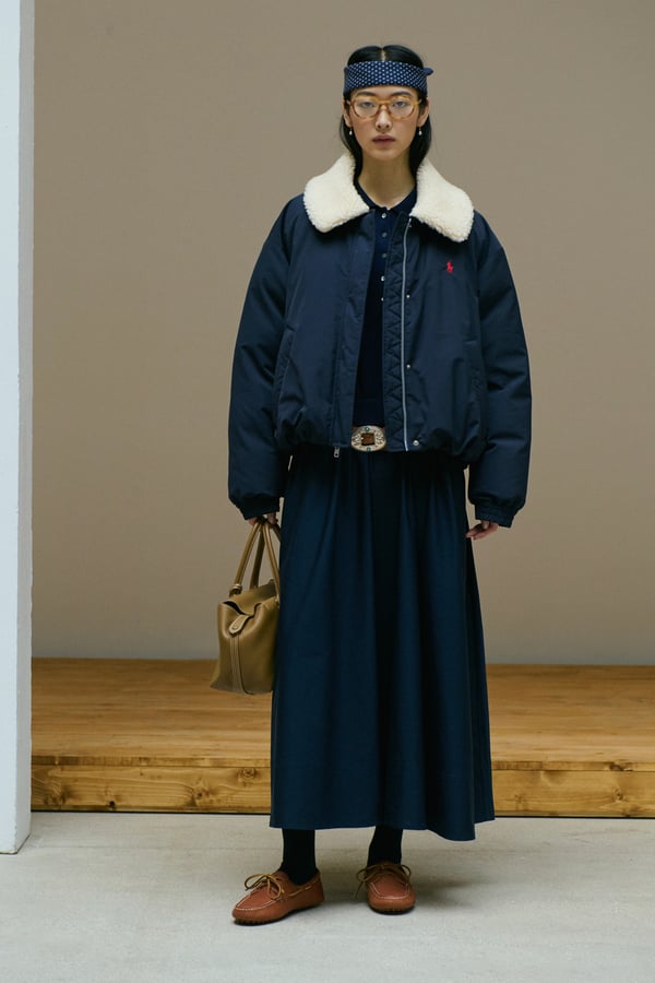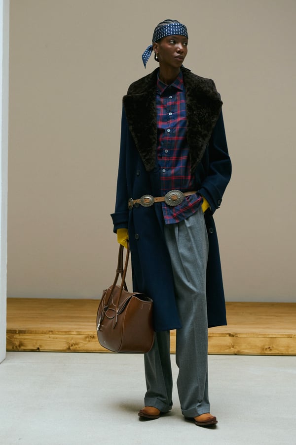 「ポロ ラルフ ローレン(Polo Ralph Lauren)」がパリで2026年秋冬ウィメンズコレクションを発表した。着想源は、自己表現と自由なスタイルが広がった1970年代のアメリカ。ニューヨークの洗練とアメリカ南西部のロマンを融合させ、規律と自由のあいだにある緊張感を表現した。細長いテーラリングを軸に、スエードやシアリング、コーデュロイなど異なる質感を重ね、同系色のトーナルなスタイリングで奥行きを演出。イエローの手袋が差し色として合わせられた。ウエスタンディテールのブーツやワイドベルトがアクセントとなり、乗馬文化から着想を得た新バッグ「ポロ ブレイズ」も登場した。