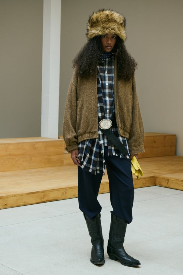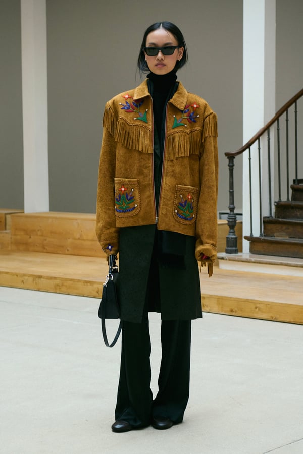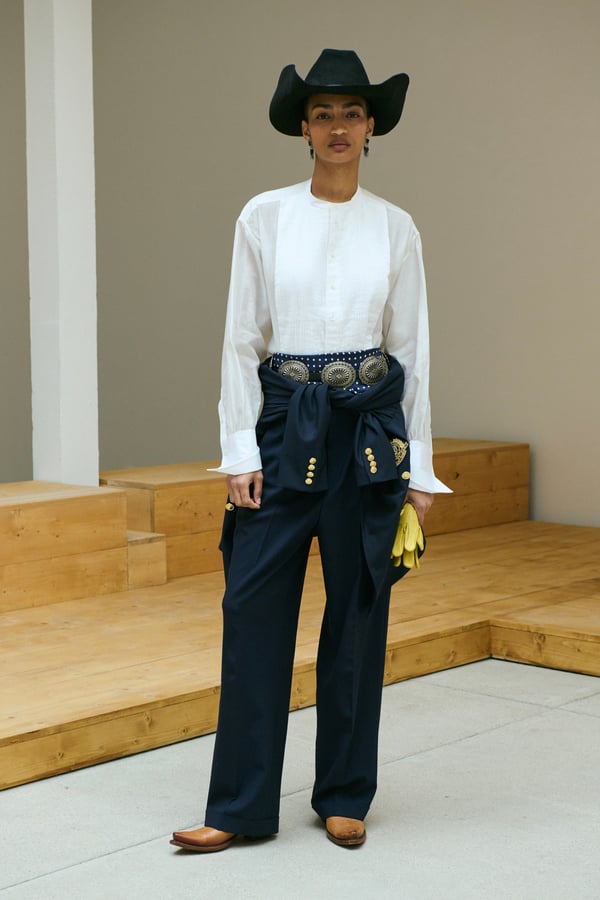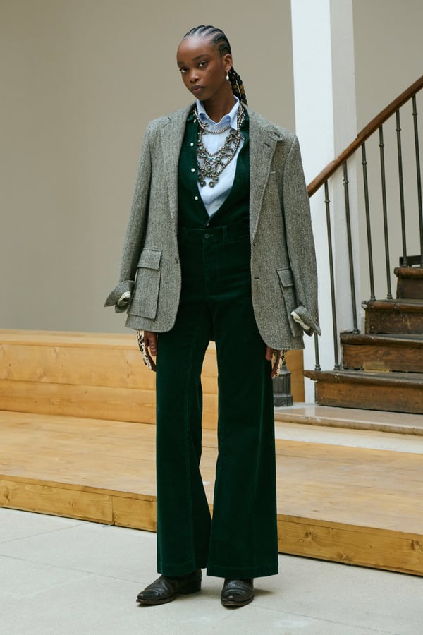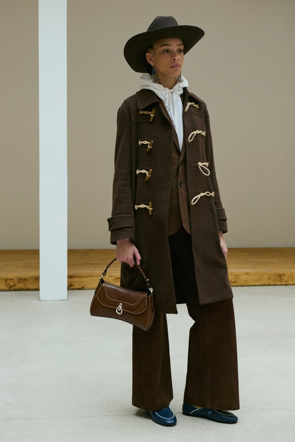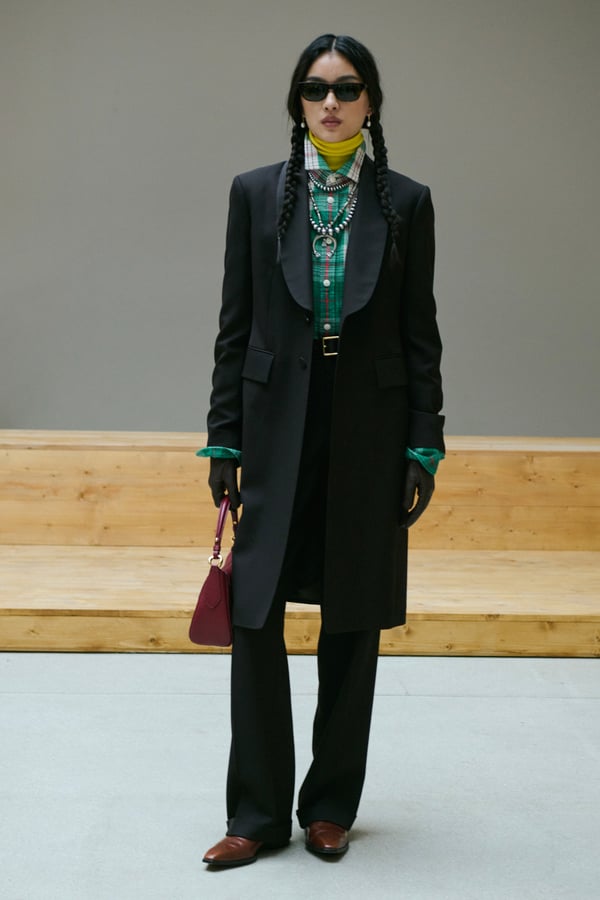 「ポロ ラルフ ローレン(Polo Ralph Lauren)」がパリで2026年秋冬ウィメンズコレクションを発表した。着想源は、自己表現と自由なスタイルが広がった1970年代のアメリカ。ニューヨークの洗練とアメリカ南西部のロマンを融合させ、規律と自由のあいだにある緊張感を表現した。細長いテーラリングを軸に、スエードやシアリング、コーデュロイなど異なる質感を重ね、同系色のトーナルなスタイリングで奥行きを演出。イエローの手袋が差し色として合わせられた。ウエスタンディテールのブーツやワイドベルトがアクセントとなり、乗馬文化から着想を得た新バッグ「ポロ ブレイズ」も登場した。