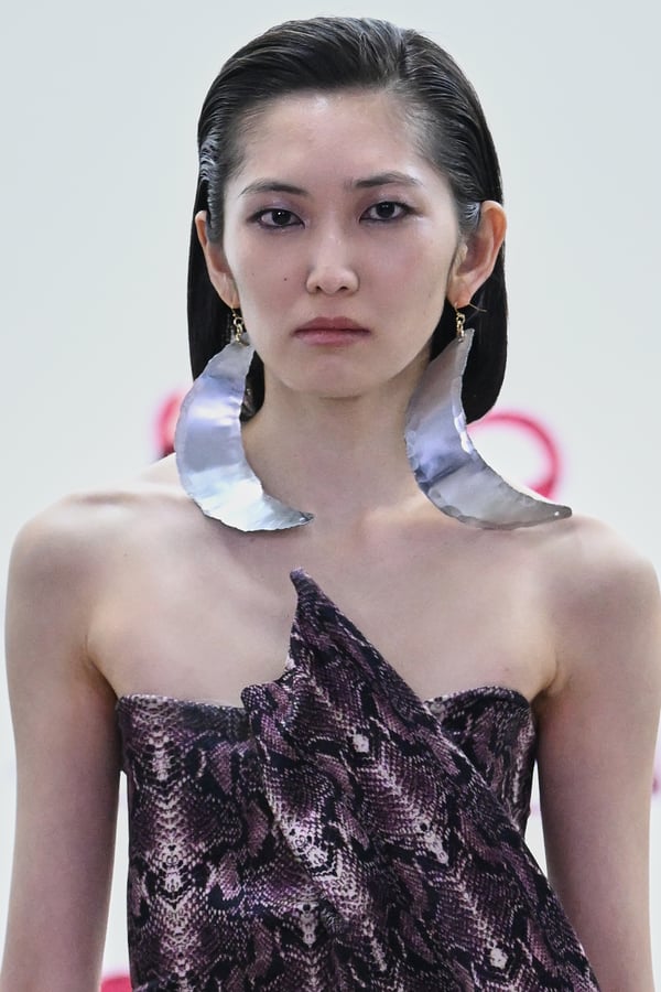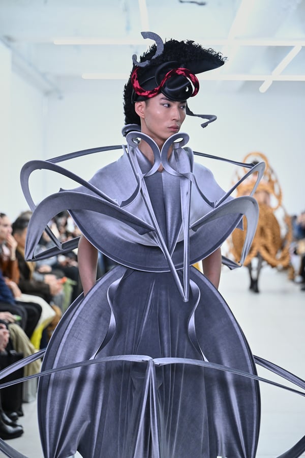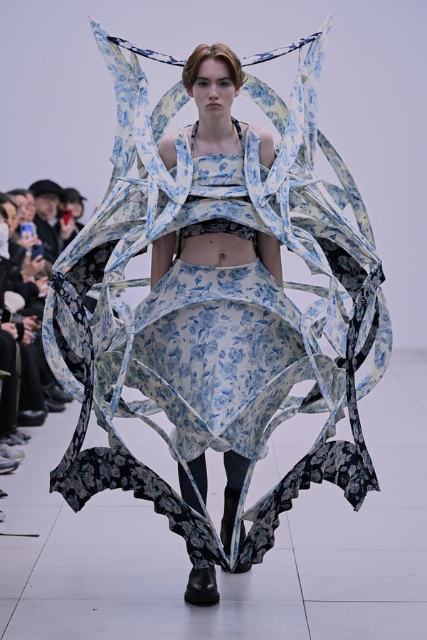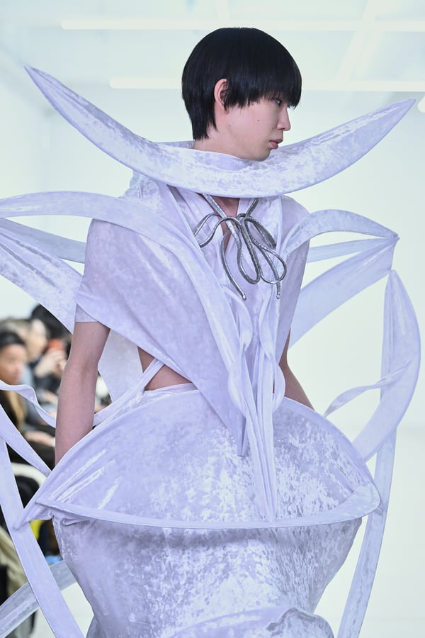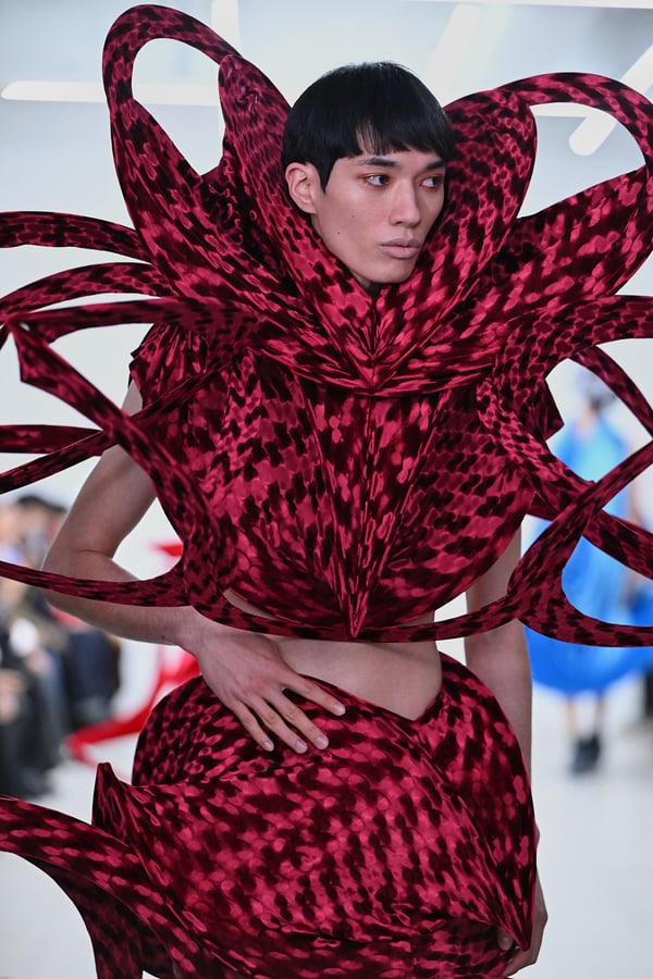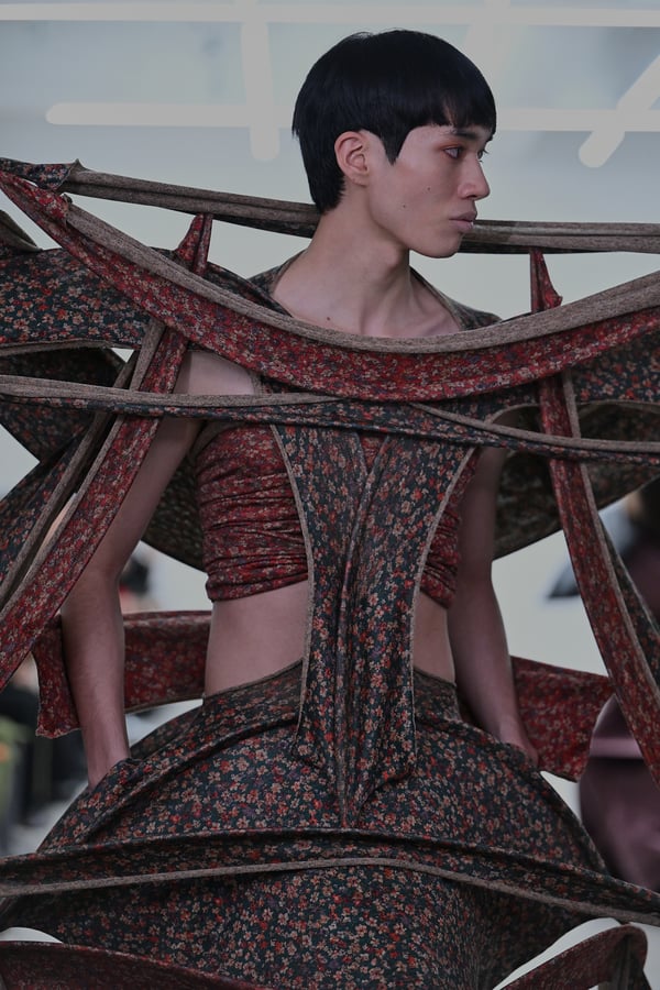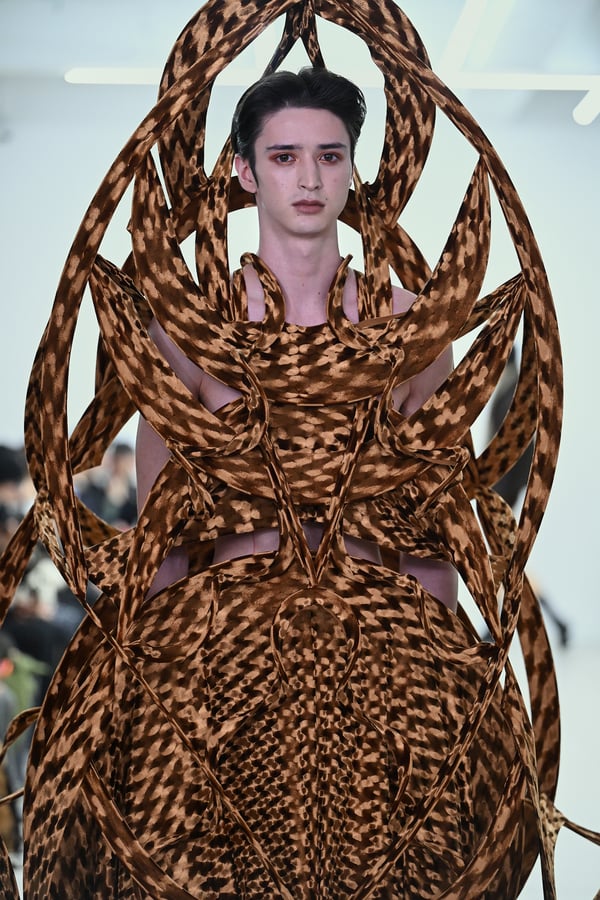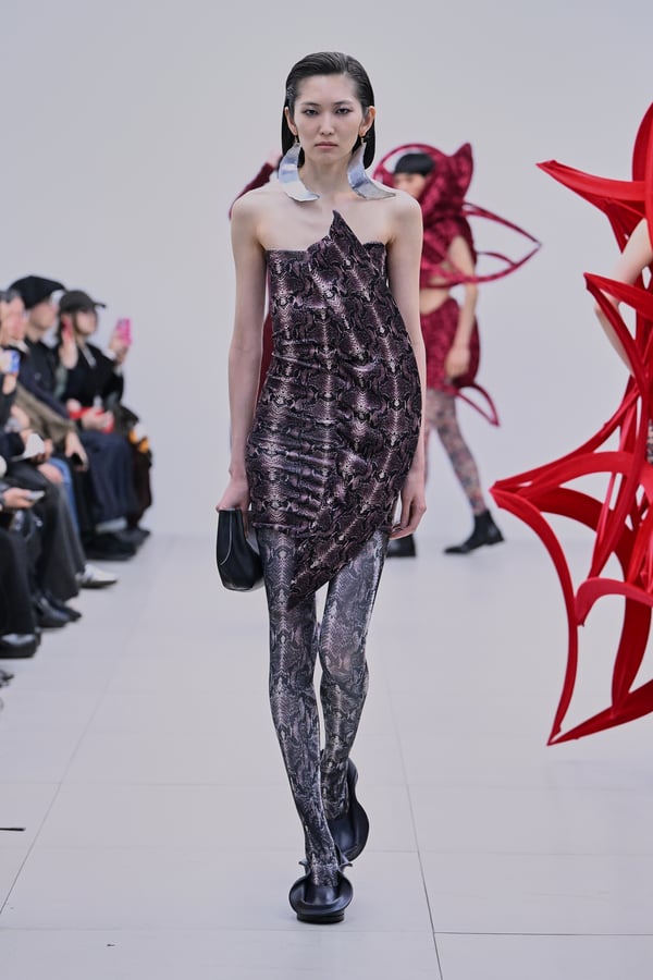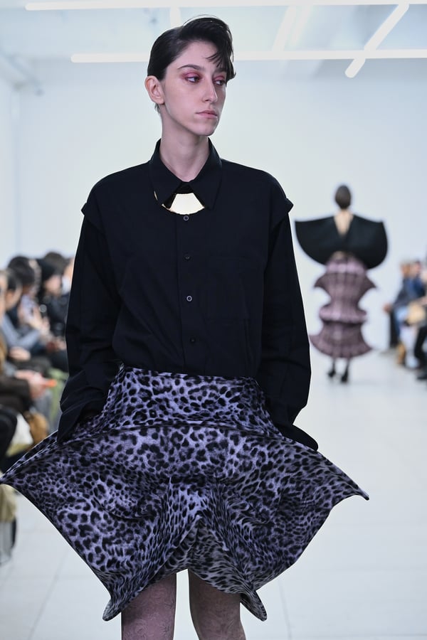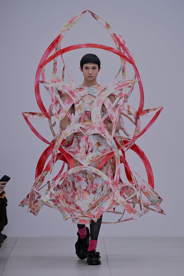 スカルプチュアルなドレスはこれまでと同様に伸縮性のあるポリエステルやハードチュールなどをチューブで支えるという構造だが、今季初めて花柄やアニマルモチーフといったプリント生地を取り入れた。岡﨑は同コレクションの思考の背景として、衣服の歴史を「なぞること(模倣)の歴史」ではないかと捉え直したことを挙げた。「自然や生物への憧憬から、模倣して取り入れたいという欲望はとても人間的な感情だと思うから」と説明している。