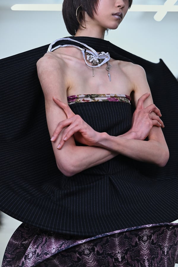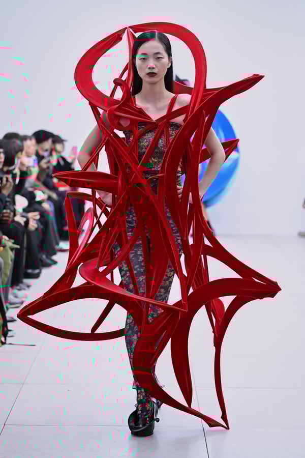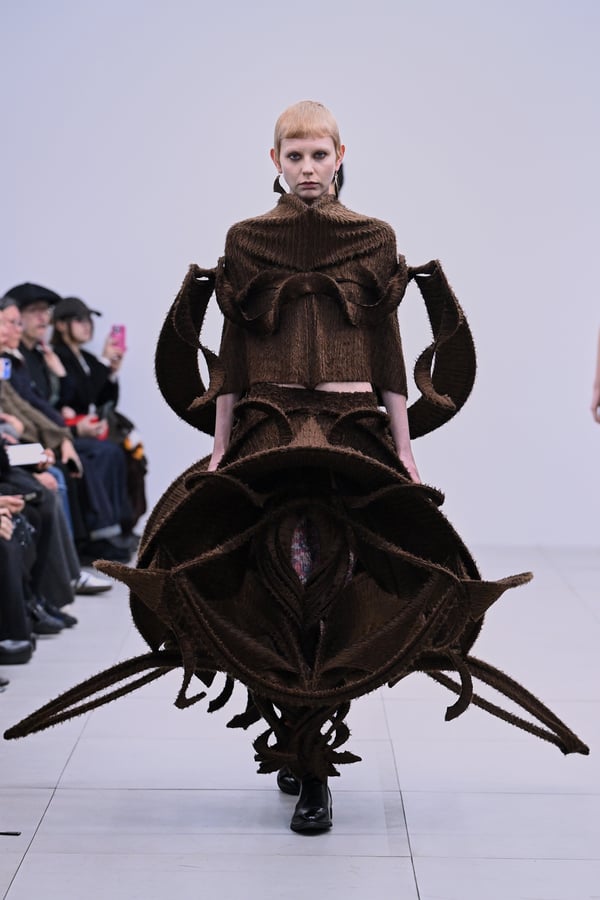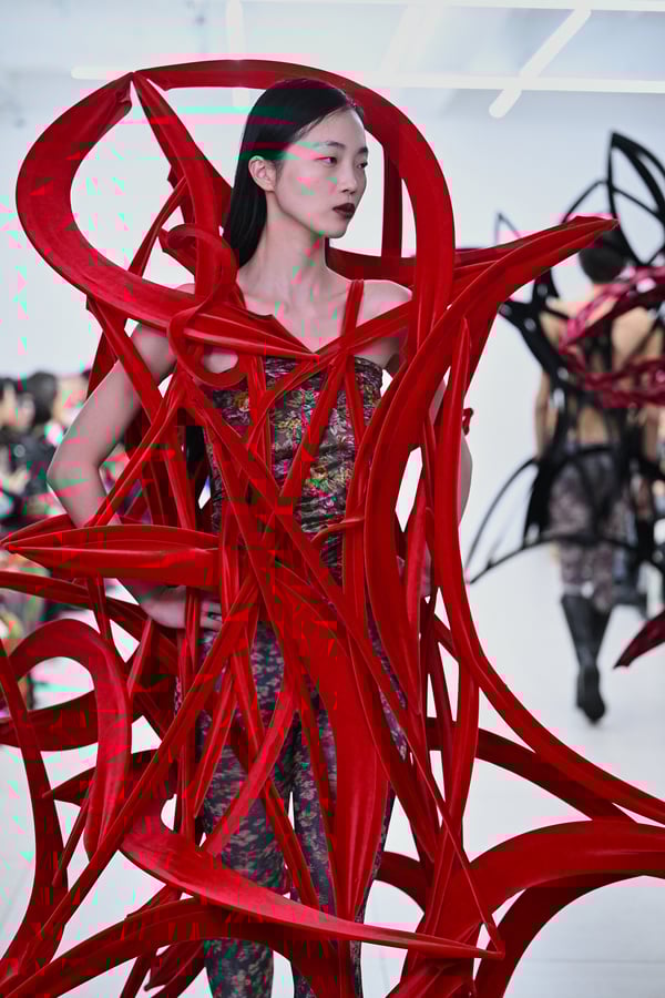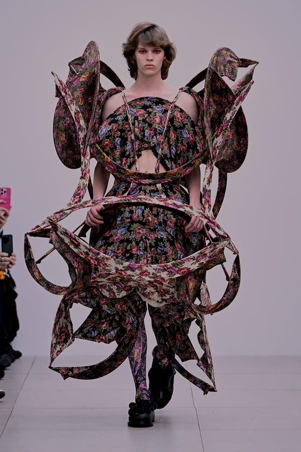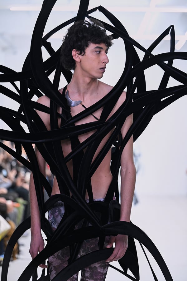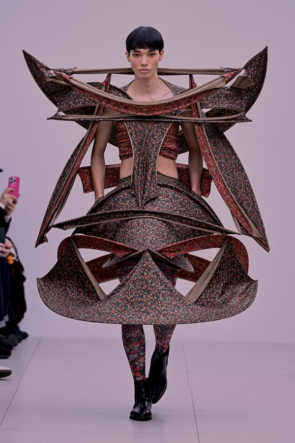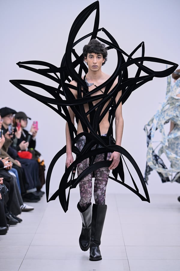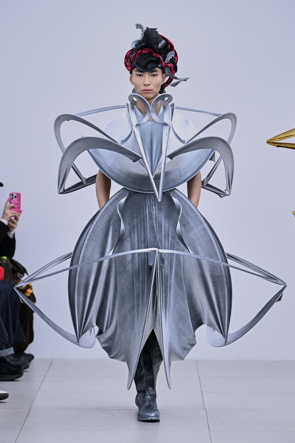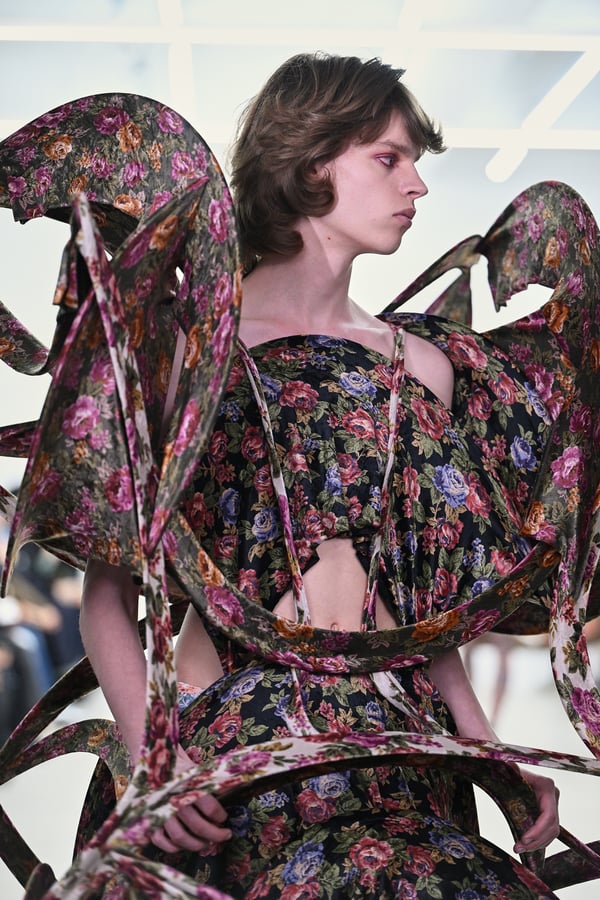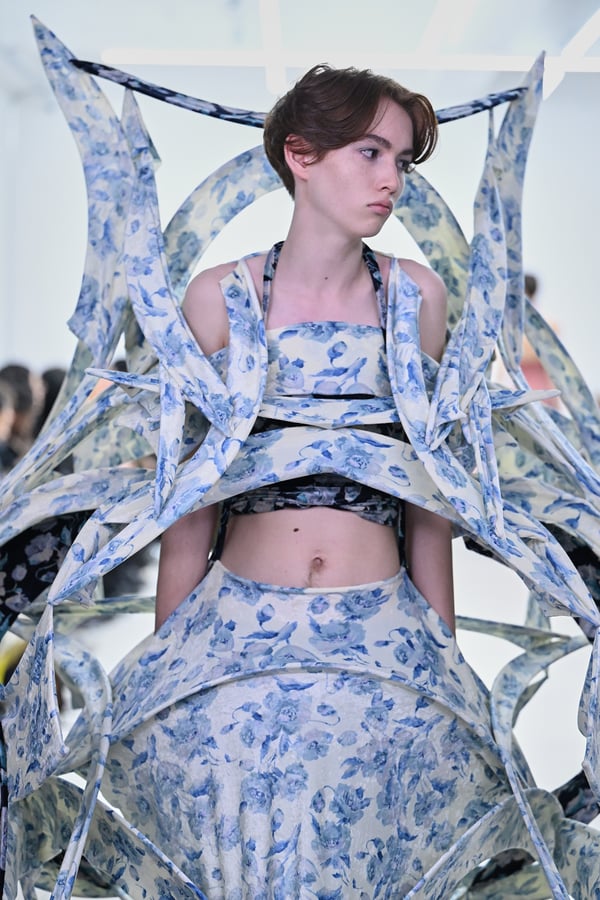 スカルプチュアルなドレスはこれまでと同様に伸縮性のあるポリエステルやハードチュールなどをチューブで支えるという構造だが、今季初めて花柄やアニマルモチーフといったプリント生地を取り入れた。岡﨑は同コレクションの思考の背景として、衣服の歴史を「なぞること(模倣)の歴史」ではないかと捉え直したことを挙げた。「自然や生物への憧憬から、模倣して取り入れたいという欲望はとても人間的な感情だと思うから」と説明している。