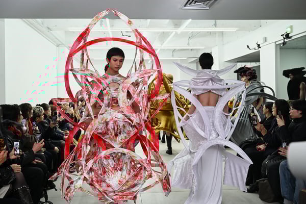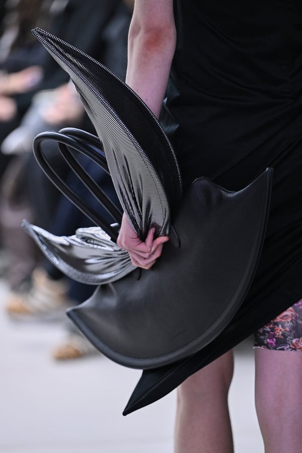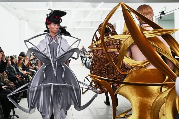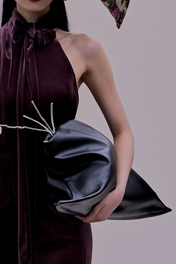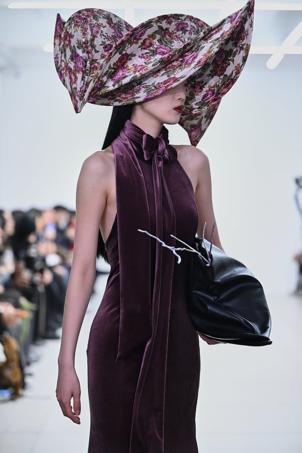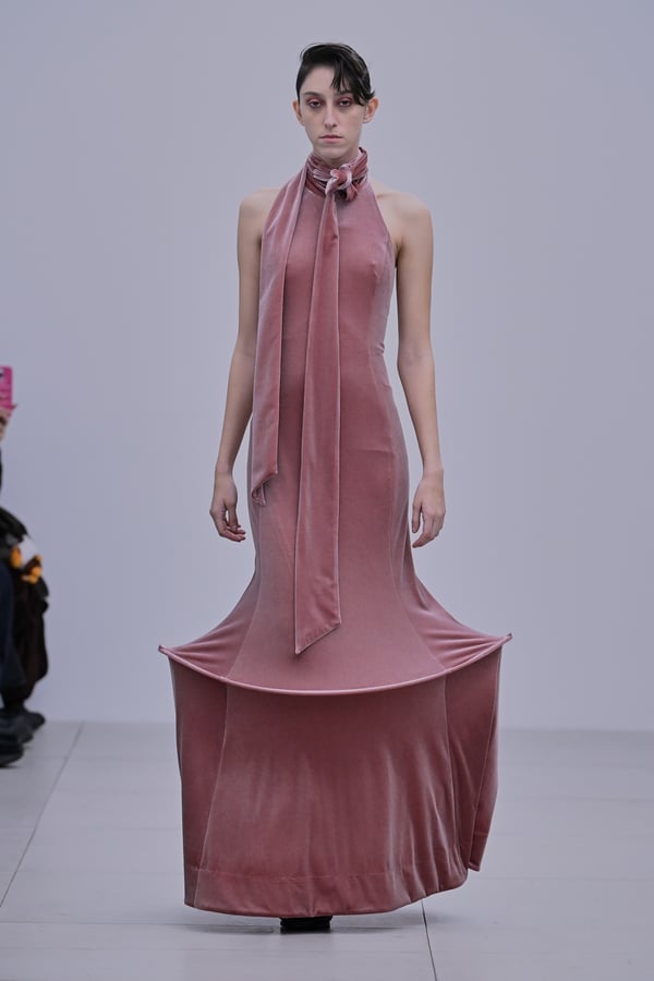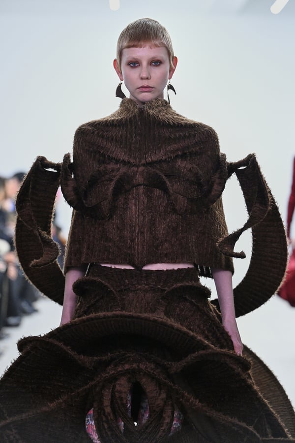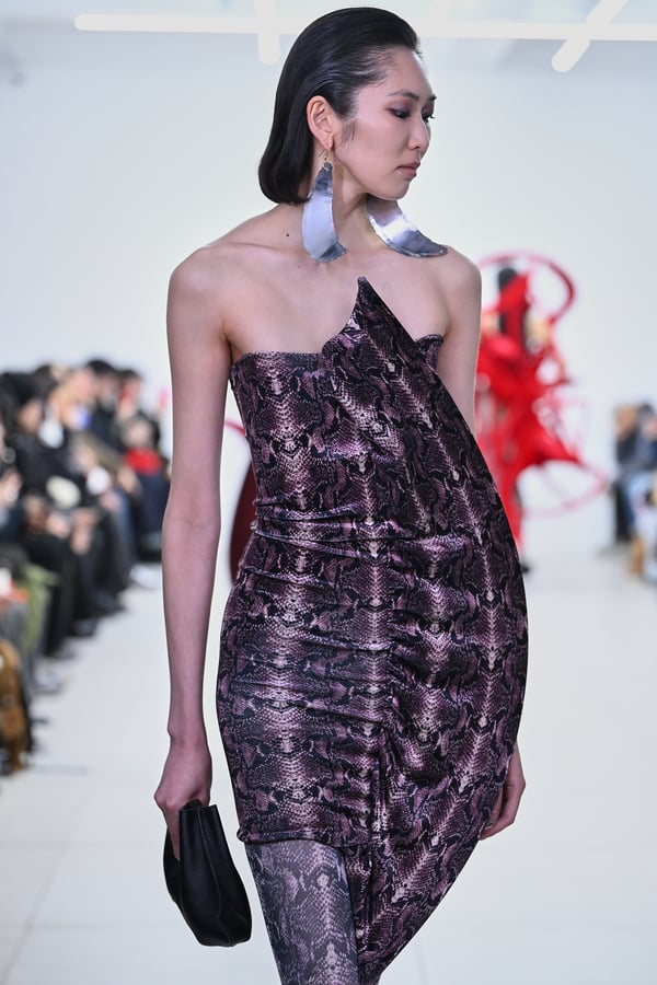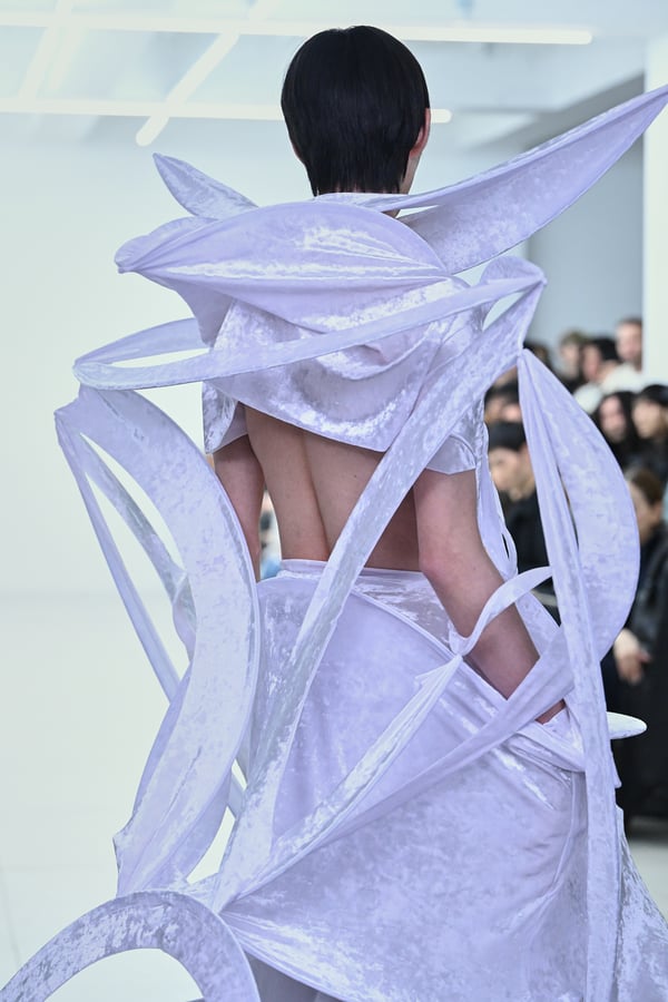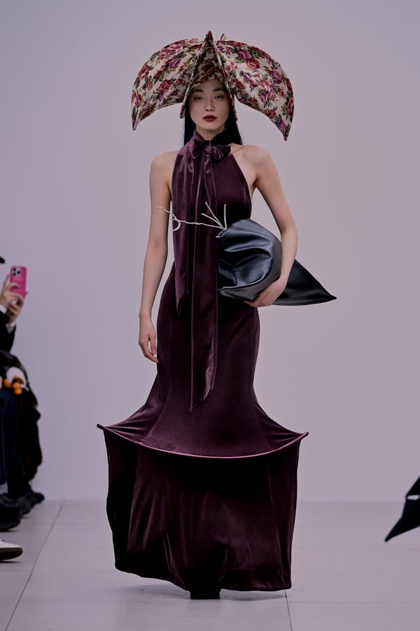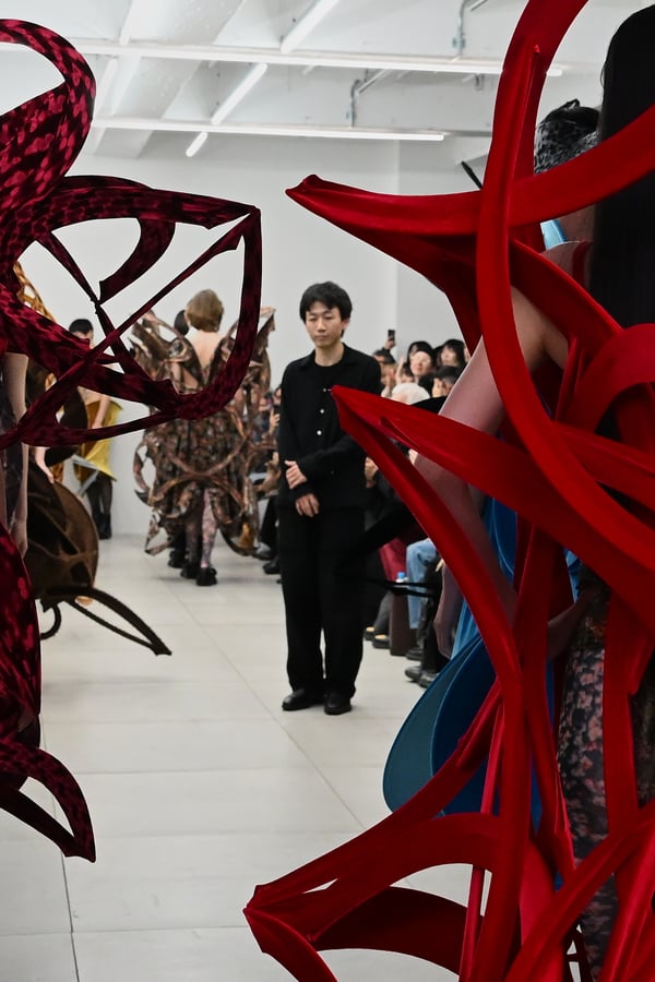 スカルプチュアルなドレスはこれまでと同様に伸縮性のあるポリエステルやハードチュールなどをチューブで支えるという構造だが、今季初めて花柄やアニマルモチーフといったプリント生地を取り入れた。岡﨑は同コレクションの思考の背景として、衣服の歴史を「なぞること(模倣)の歴史」ではないかと捉え直したことを挙げた。「自然や生物への憧憬から、模倣して取り入れたいという欲望はとても人間的な感情だと思うから」と説明している。