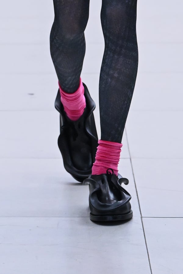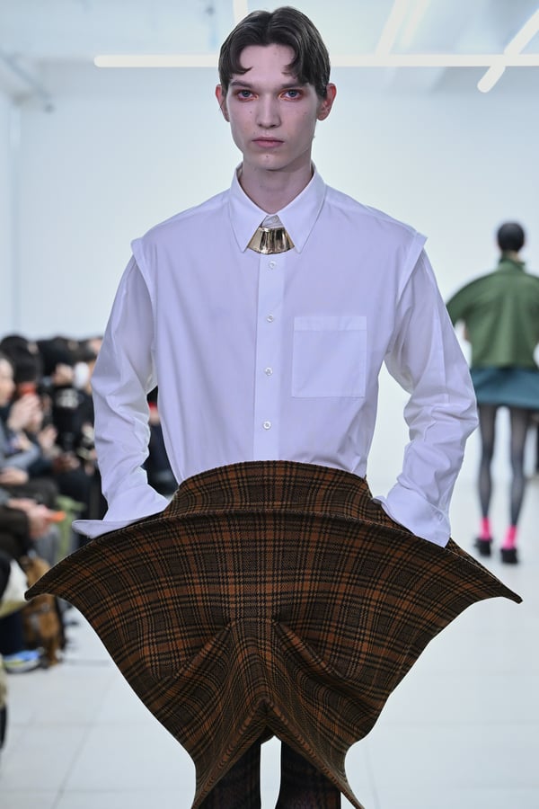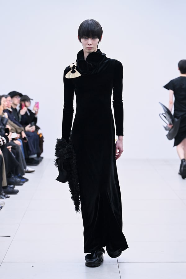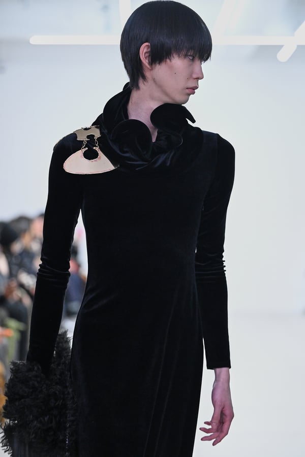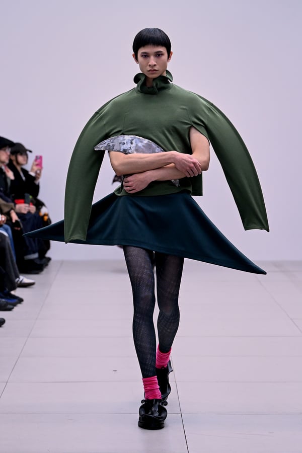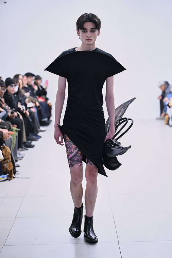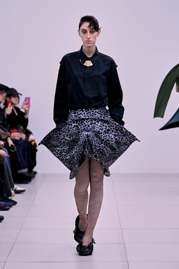 セカンドスキンようなタイツには、プリント生地の折れ目や、着用した時の歪みを残したまま複写した絵柄を落とし込んだ。「模倣を模倣する」ことで、感情の連続性や多重性を彷彿とさせた。そのほか、ベロア素材や起毛したアニマリックなマテリアルなど、テクスチャーも多様化。ポロシャツやタイドレスなど、チューブの躯体を削ぎ落とした、より日常的な衣服に近いルックも今季の挑戦のひとつ。オリジナルのシューズも登場し、金属を叩いたような粗野さを残したアクセサリーはアーティストの辻一徹とのコラボレーションで製作。デザイン画を描かず、手の経験による「オートマチック」な創造を行う岡﨑が、「プレタポルテ的な視点で手を動かしたら何が生まれるのか」という表現の拡張を試みたコレクションとなった。