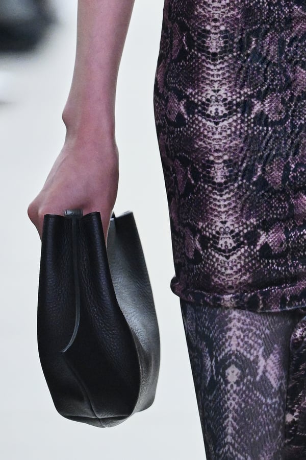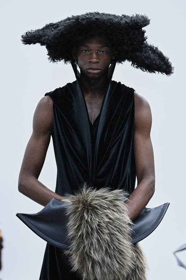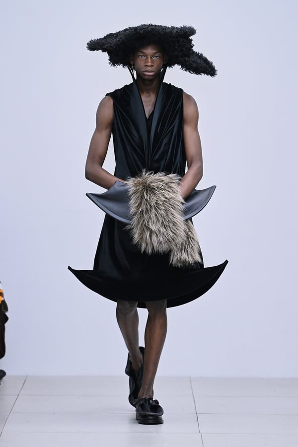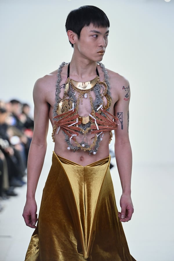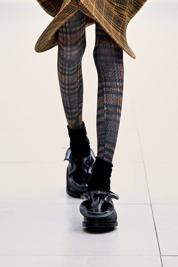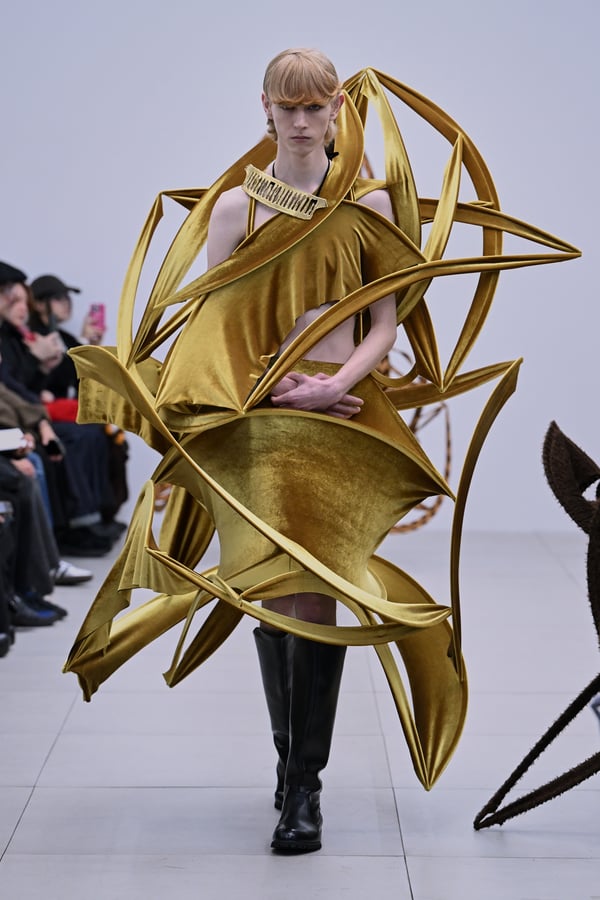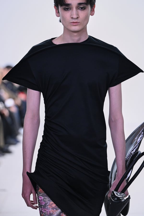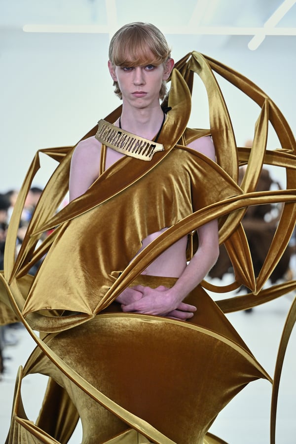 セカンドスキンようなタイツには、プリント生地の折れ目や、着用した時の歪みを残したまま複写した絵柄を落とし込んだ。「模倣を模倣する」ことで、感情の連続性や多重性を彷彿とさせた。そのほか、ベロア素材や起毛したアニマリックなマテリアルなど、テクスチャーも多様化。ポロシャツやタイドレスなど、チューブの躯体を削ぎ落とした、より日常的な衣服に近いルックも今季の挑戦のひとつ。オリジナルのシューズも登場し、金属を叩いたような粗野さを残したアクセサリーはアーティストの辻一徹とのコラボレーションで製作。デザイン画を描かず、手の経験による「オートマチック」な創造を行う岡﨑が、「プレタポルテ的な視点で手を動かしたら何が生まれるのか」という表現の拡張を試みたコレクションとなった。